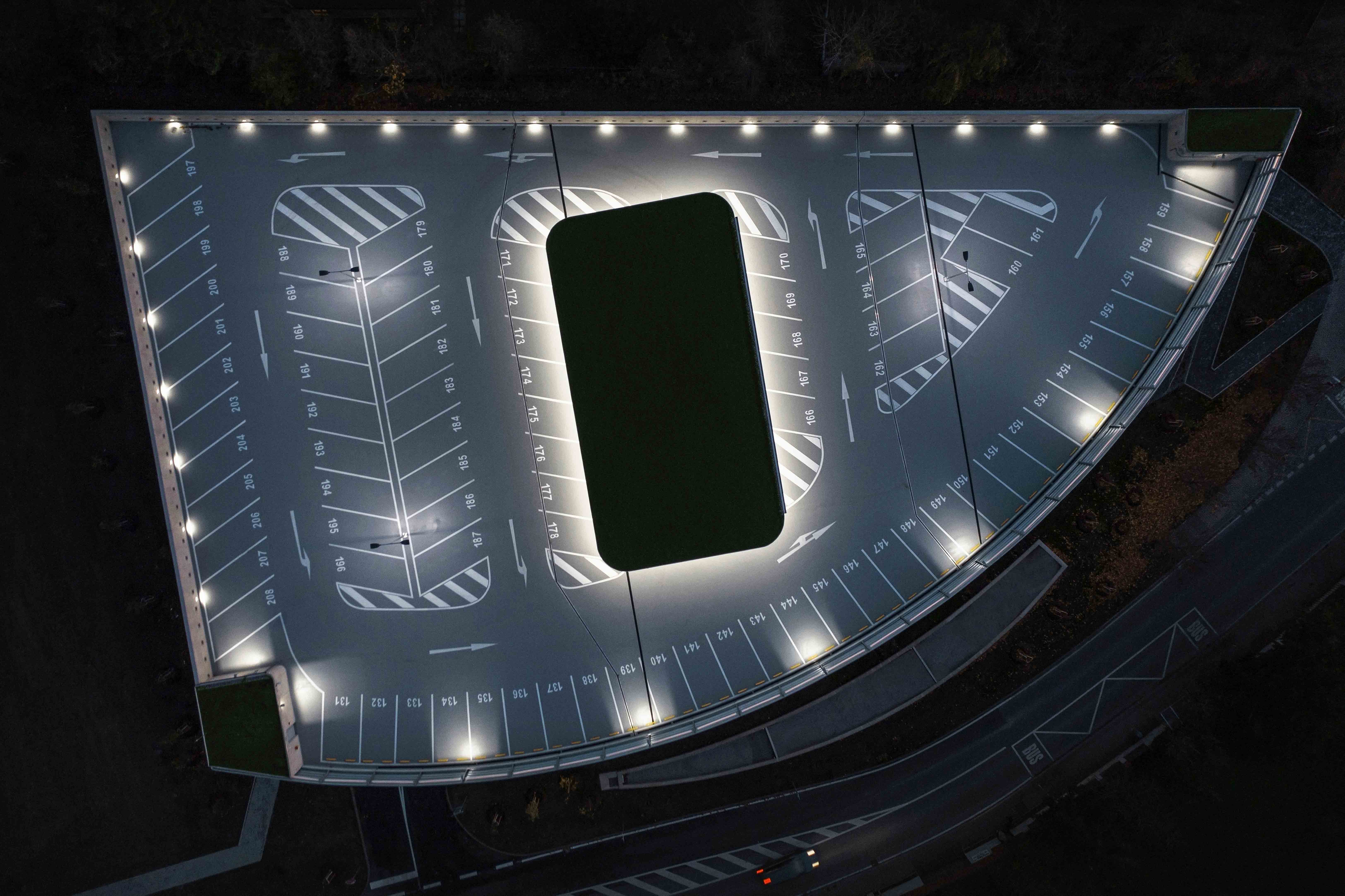북쪽 장벽에 설치된 LED 조명은 긴 노출된 차량 통로를 보여준다. 주차장 앞의 연못은 빗물을 모아 사용할 수 있는 물이 남아있도록 돕는다. 건물의 가장 높은 층에 있는 세 개의 지붕은 초목으로 덮여 있다. 나중에는 건물 전체가 녹색에 삼켜질 것이다.