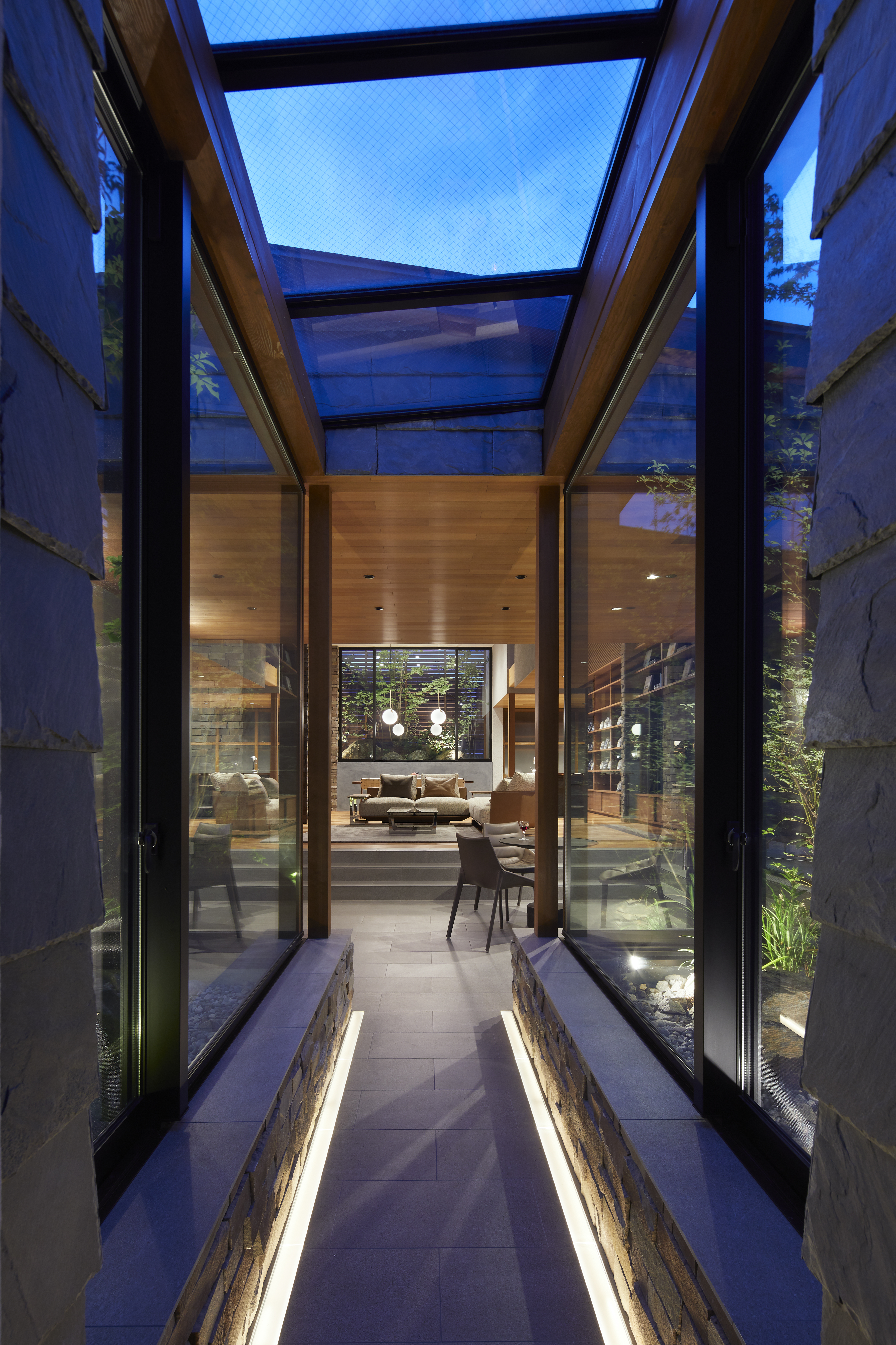 The site is an area located near the city center of Shunan, Yamaguchi Prefecture. The plot area has more than enough space to build a residence, but fulfilling the client’s requirements would result in clearly exceeding the scale of the surroundings. Thus, we planned the residence not as a single block, but as a building that considers and fits well with the scale of the surrounding environment. First, we scattered various rooms in the shape of a box according to the boundary lines of the site and arranged for the spaces between the rooms to be corridors that allowed for the enjoyment of looking at the courtyard and yards. The size of each room was adapted to fit the surrounding environment and the layout of the rooms were decided by constructing various everyday situations and stories, also accommodating to future lifestyle changes. It was a divided ridge-style plan, but by directing one’s vision to the large courtyard situated in the center, we also created a sense of unity as a residence. When the windows of each yard are opened, the wind passes through, and the sensation of being amidst nature can be felt even while indoors, with the sound of rustling foliage, the fragrance of flowers, and the chirping of birds visiting the yards. The eight courtyards born from the spaces between rooms each have their own features with regards to the scale, height, lighting, and ventilation, creating a residence where various expressions created by the changing seasons can be enjoyed.