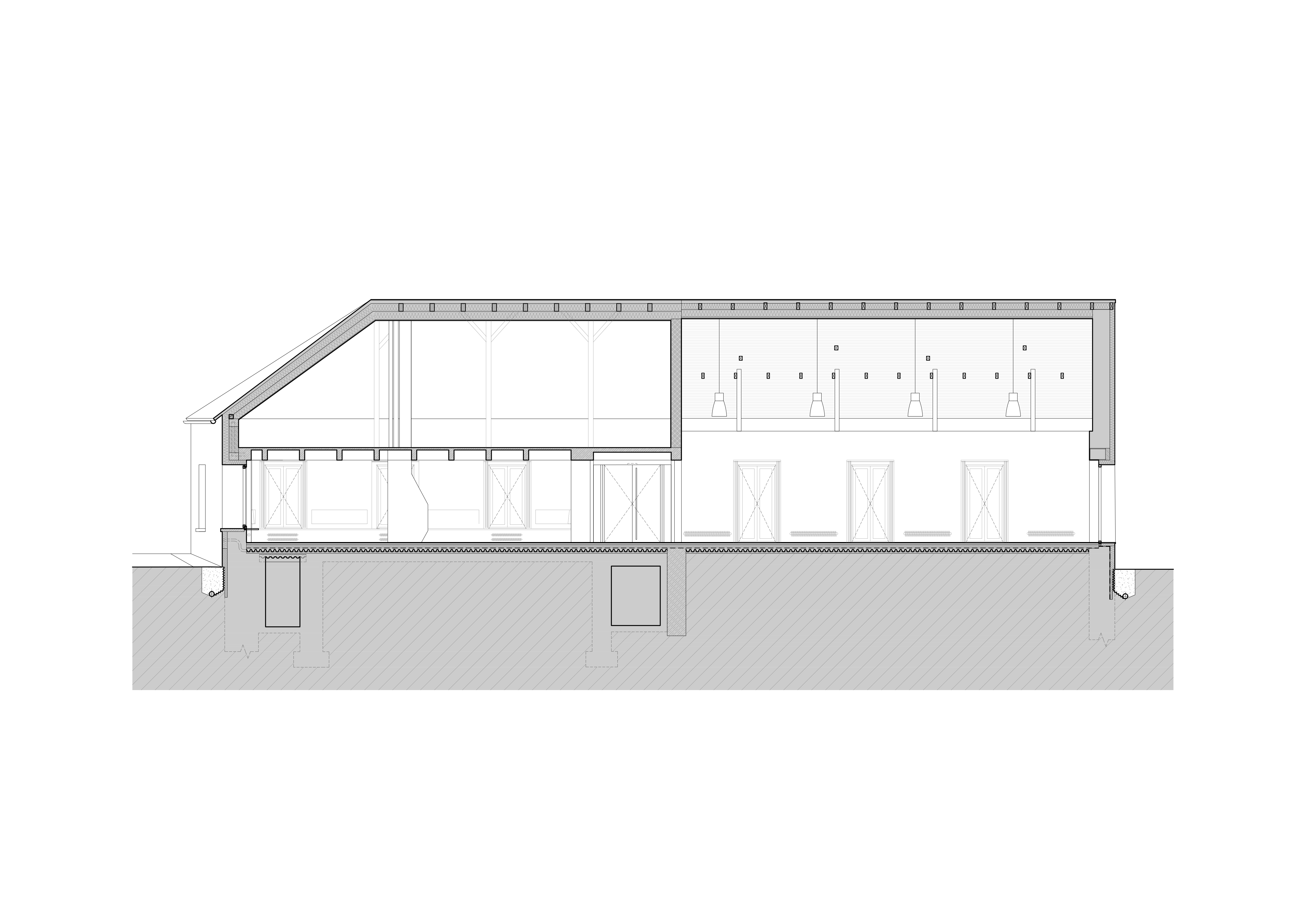 The house is divided into three areas - the multi-purpose hall on one side of the entrance, the pub on the other side and the service part at the back. The multi-purpose hall and the pub are accessible via the entrance hall and can be easily merged together for special occasions via large wooden door in the entrance hall. The multi-purpose hall is also equipped with three large french windows, which can seamlessly connect the interior with the village square, enabling the house to serve the crucial function in social and cultural life of Máslovice.