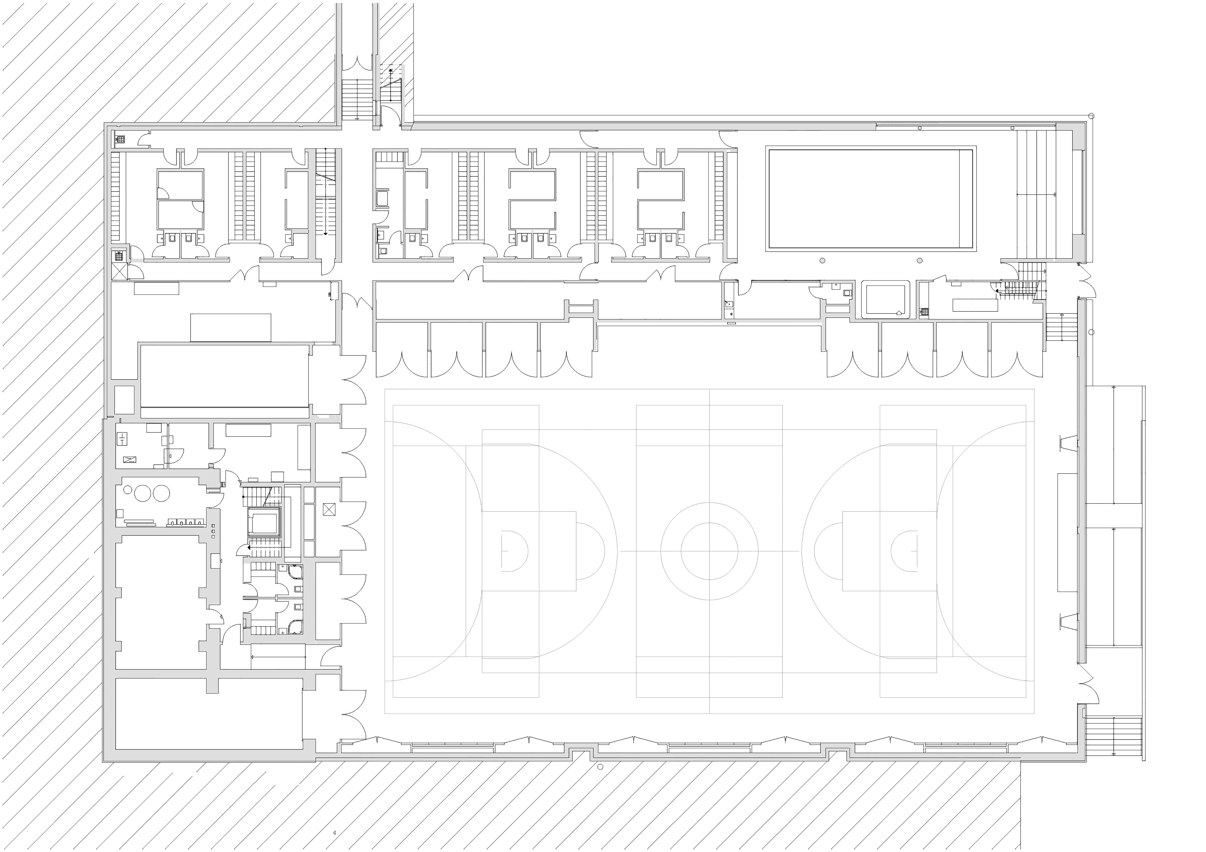 The entrance foyer is the core of the building, the meeting point, where the sportman meets the spectator. Right after the entering the foyer you can see the sport hall trough a big window. From the foyer is directly accesible the gallery of the big hall, from which is accesible the main tribune, the changing rooms, the gym and it also lead up to the exit to the outside courts. Other way from the foyer leads downstairs to the service part of the buildng, where are located other changing rooms and the swimming pool. The lower level is directly connected to the primary school via an underground corridor, because the swimming pool mainly serves for the school children. The upper story of the building is dedicated to the mirror hall with the natural rooflight. The entrance foyer is also connected with the old building, where is the restaurant on the ground level and the accomodation for the sport clubs on the upper levels.