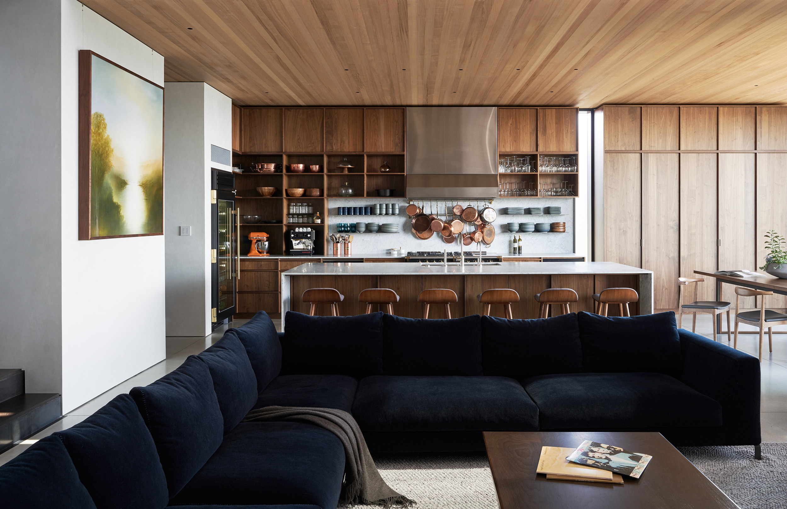 Another design challenge of the project was to create a large family home that sits in context with its neighbors on a tight urban site. The sectional diagram was a key driver in designing the house and understanding the relationships to the steep slope and views to the south. The massing of the house allows it to appear in scale with neighboring properties on the north side and opens up to the south as it cascades down the site. The plan layout creates a central double height core (living room) allowing a separation of program at the upper level between the east primary wing and the west kids' wing while retaining a shared relationship between these spaces. This core central space, bookended with extensive glazing, draws light deep into the plan.