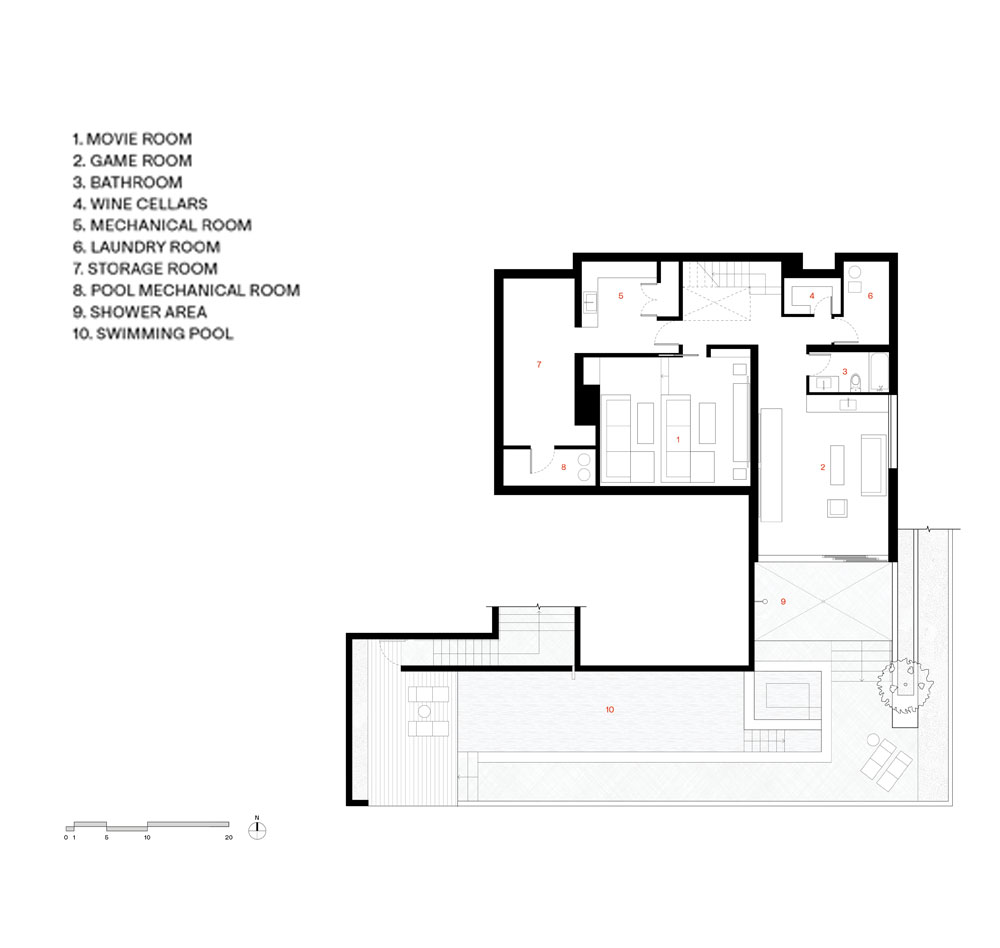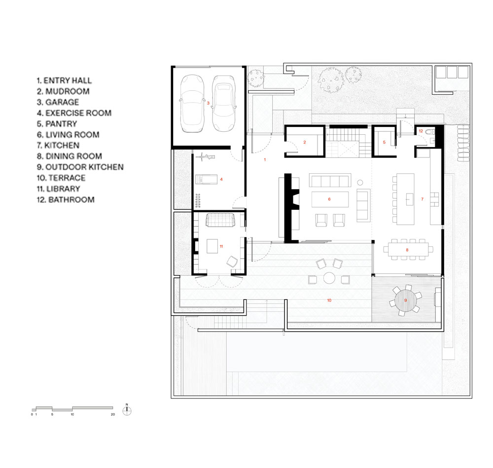Another design challenge of the project was to create a large family home that sits in context with its neighbors on a tight urban site. The sectional diagram was a key driver in designing the house and understanding the relationships to the steep slope and views to the south. The massing of the house allows it to appear in scale with neighboring properties on the north side and opens up to the south as it cascades down the site. The plan layout creates a central double height core (living room) allowing a separation of program at the upper level between the east primary wing and the west kids' wing while retaining a shared relationship between these spaces. This core central space, bookended with extensive glazing, draws light deep into the plan.