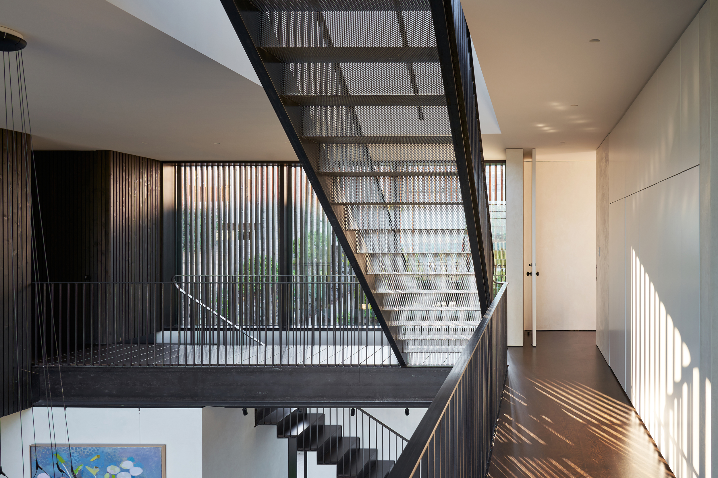 지하층에서 정원 그리고 옥상 테라스까지 두 배 높이의 생활 공간을 통해 순환이 이루어진다. 지붕은 가족을 위한 또다른 모임을 위한 공간을 제공해주고 에너지 사용을 최소화하기 위해 18개의 패널 태양 전지판을 설치하였다. 500sf 규모의 넓은 옥상 정원에서는 직접 채소와 주방용 허브도 재배할 수 있다. 집은 단열재를 사용하여 열손실을 줄이고 전체적으로 복사수소 난방을 사용하여 효율적인 난방이 가능하도록 했다. 집의 디테일과 디자인은 철제 핸드레일을 사용하는 등 세심하게 고려하였다. 내부는 석고 질감과 따뜻한 느낌의 목재를 사용하고 콘크리트와 강철의 녹청으로 자연의 따뜻함을 주었다. 집은 우아하고 세련될 뿐만 아니라 접대를 좋아하는 8인 가족의 일상적인 삶에도 연결될 수 있어야 했다.