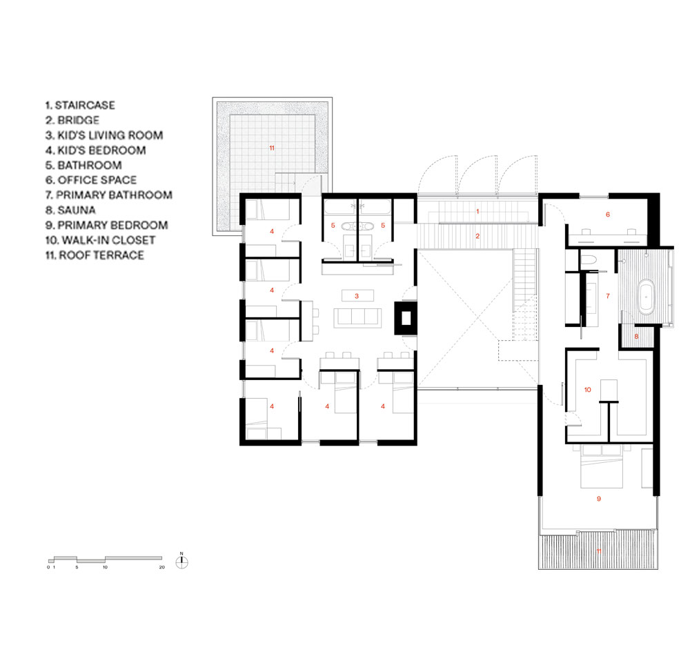 Sound House is a 5,500sf single-family home on a steep slope site in Seattle’s Magnolia neighborhood. The program for the house was unique, in that it needed to house a large blended family of two adults and six children living together for the first time. An emphasis was placed on providing large shared spaces to enjoy together and smaller areas of retreat for all members of the family. All spaces in the house needed to maximize the extensive views across the city and Puget Sound. Working closely with the owners and how their large family prioritizes communal spaces was key to deriving a plan that would function well for their needs.