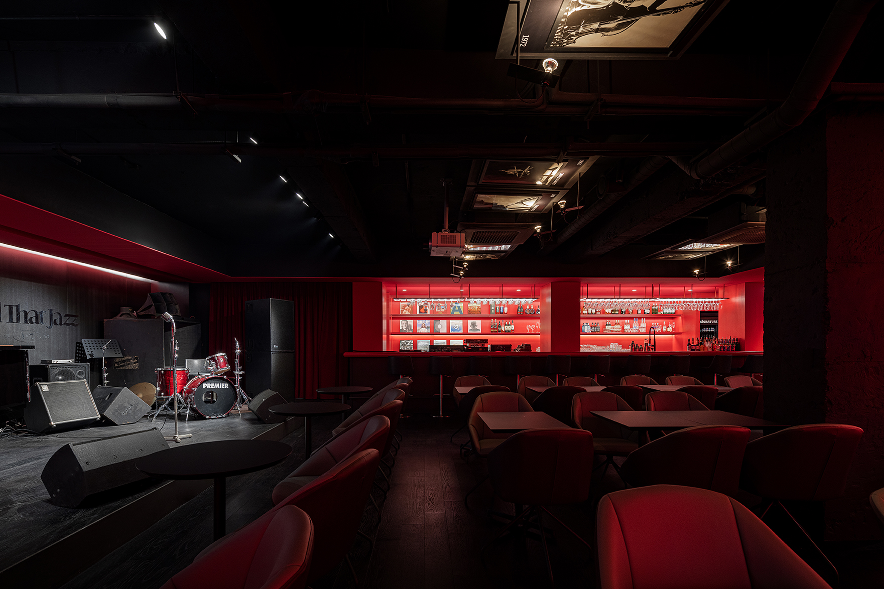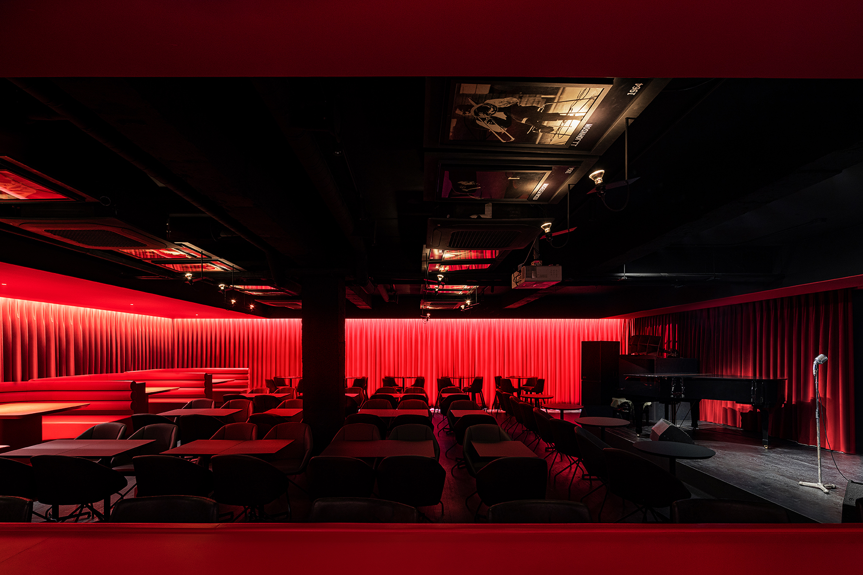 The stage and hall were wrapped in red curtains. The curtain, which blocks light and gaze and protects it from the outside, was interpreted as a device and image to protect the history and tradition of All That Jazz. The density of the volume of red curtains creates an attractive atmosphere as the space becomes richer due to the contrast with the dark space.
