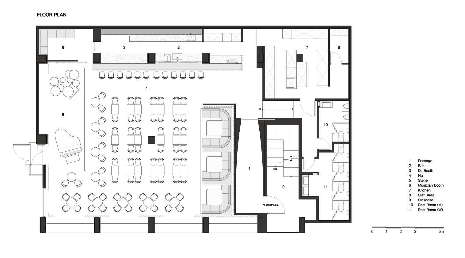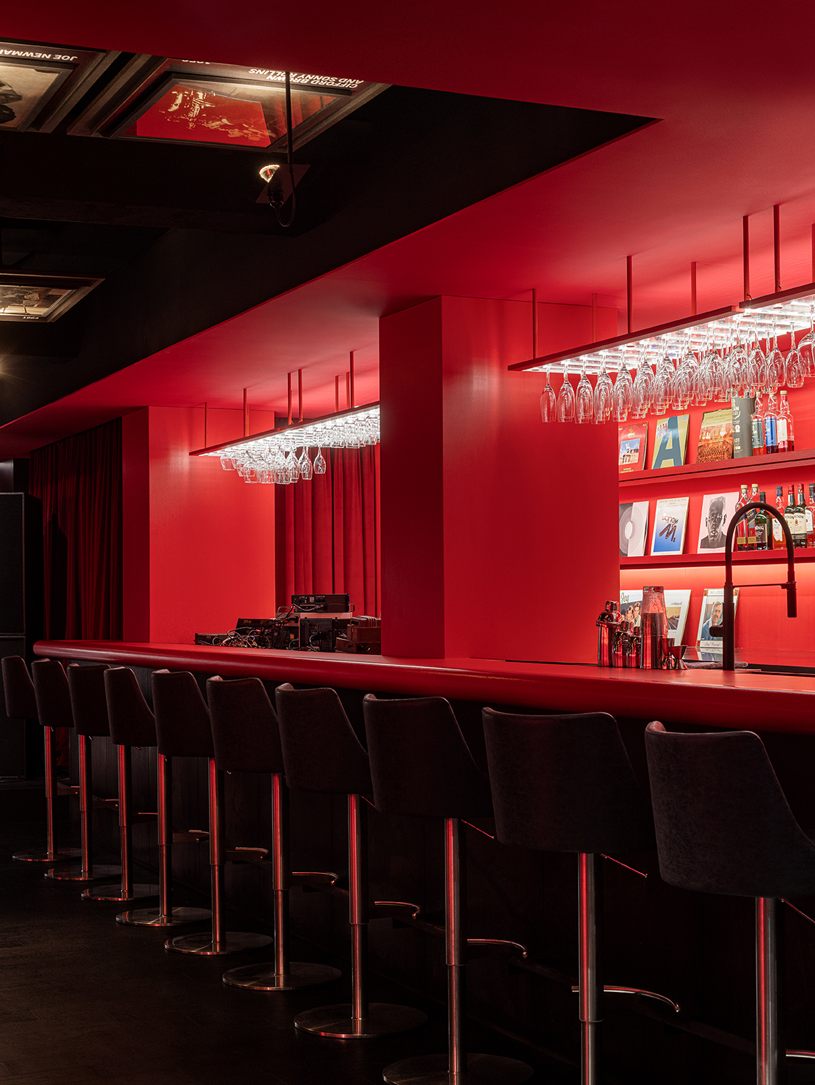 둘러싸인 붉은색 레이어에 기능적인 공간을 배치하였다. 무대의 음향을 조율하는 DJ 부스와 바텐더 바, 인포데스크를 통합 배치하여 개방된 공간에서 무대와 홀을 한눈에 관망할 수 있게 하였고, 여러 명이 동시에 앉을 수 있는 부스형 좌석은 무대의 전면에 배치하였다. 간결하고 단순한 배치를 통해 시선이 무대로 집중되어 음악에 몰입할 수 있게 하였다.