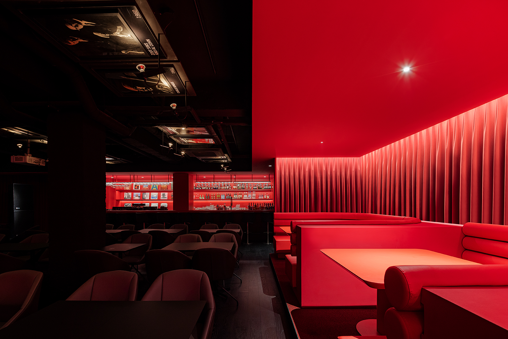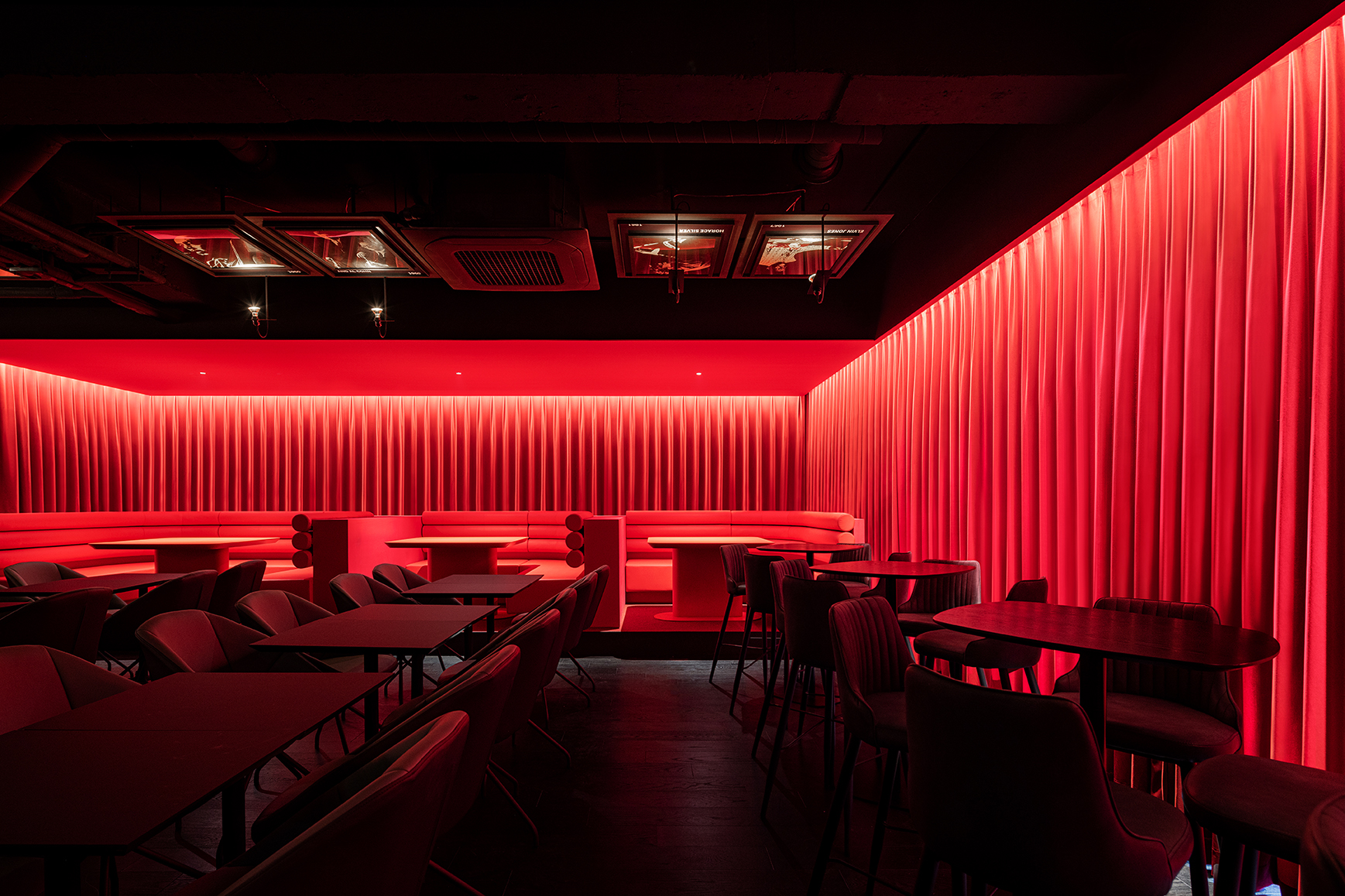 A functional space was placed in the surrounding red layer. DJ booths, bartender bars, and infodesk, which coordinate the sound of the stage, were integrated to allow a panoramic view of the stage and hall in an open space, and booth-type seats for several people at the same time, were placed at the front of the stage. Through a simple and simple arrangement, the eyes were focused on the stage so that they could immerse themselves in the music.