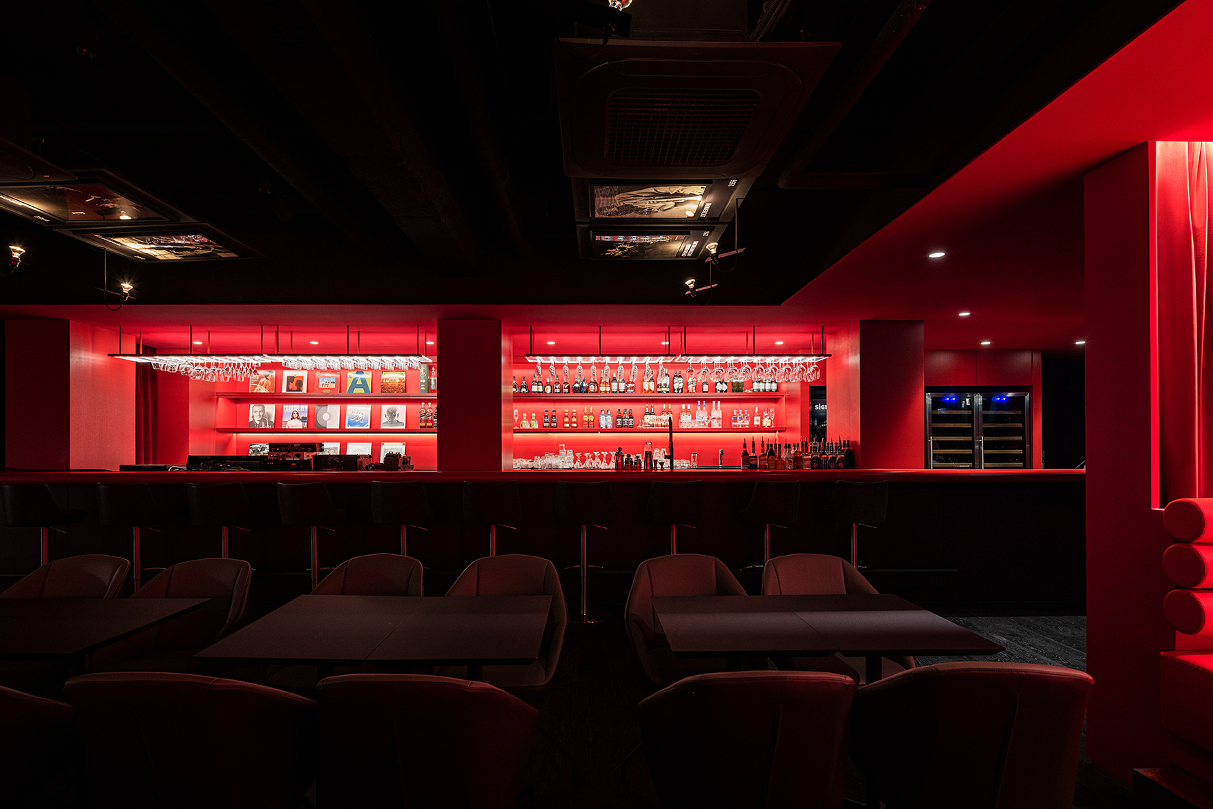 A functional space was placed in the surrounding red layer. DJ booths, bartender bars, and infodesk, which coordinate the sound of the stage, were integrated to allow a panoramic view of the stage and hall in an open space, and booth-type seats for several people at the same time, were placed at the front of the stage. Through a simple and simple arrangement, the eyes were focused on the stage so that they could immerse themselves in the music.