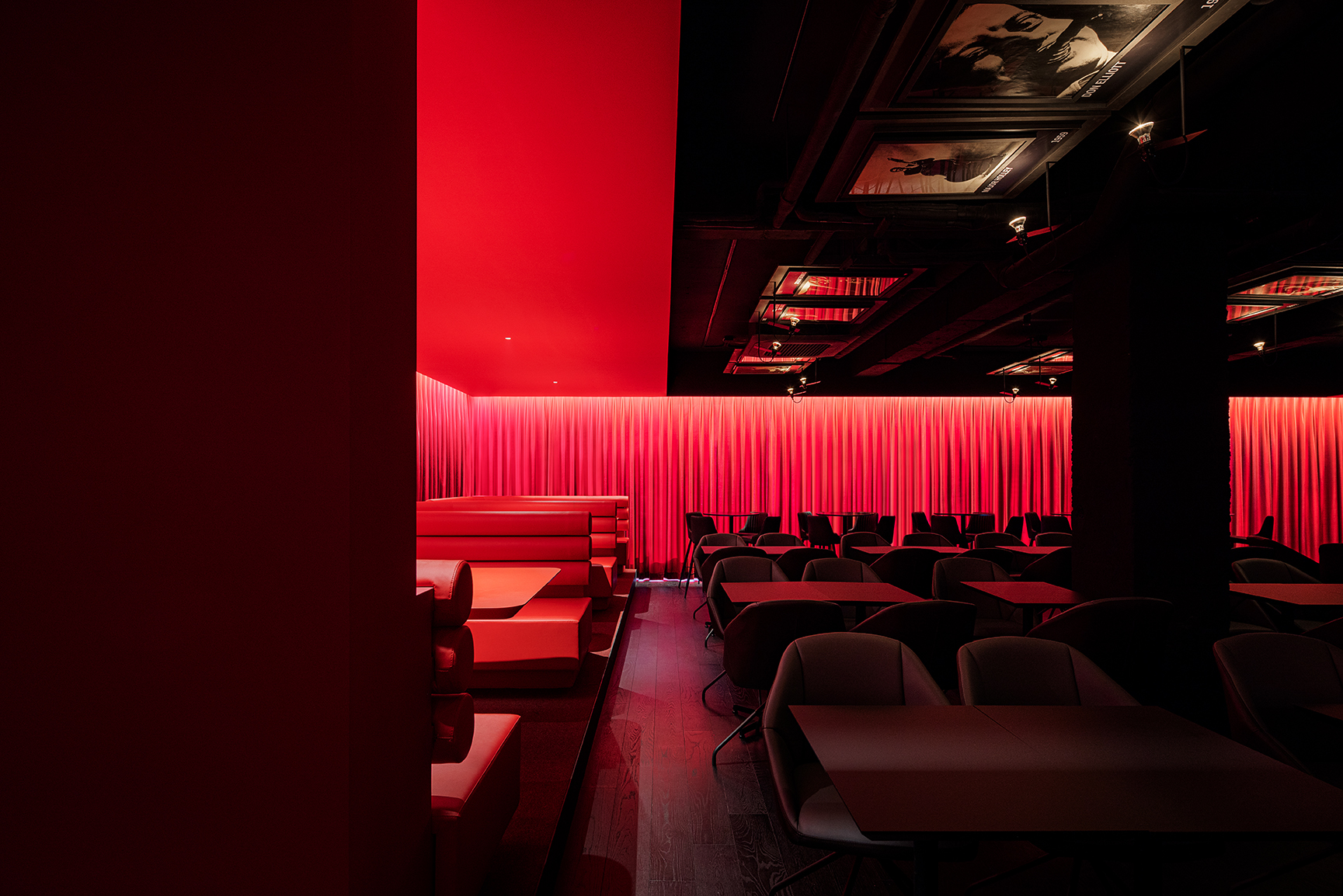 The stage and hall were wrapped in red curtains. The curtain, which blocks light and gaze and protects it from the outside, was interpreted as a device and image to protect the history and tradition of All That Jazz. The density of the volume of red curtains creates an attractive atmosphere as the space becomes richer due to the contrast with the dark space.