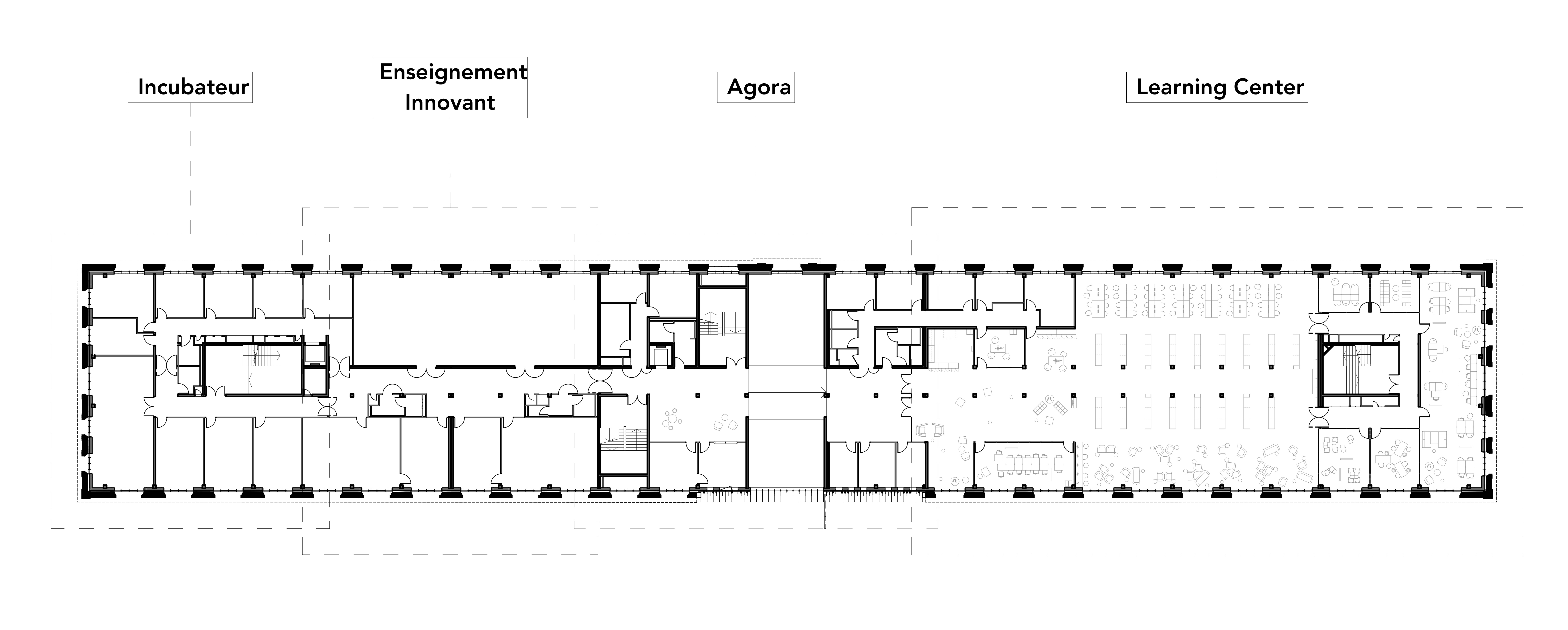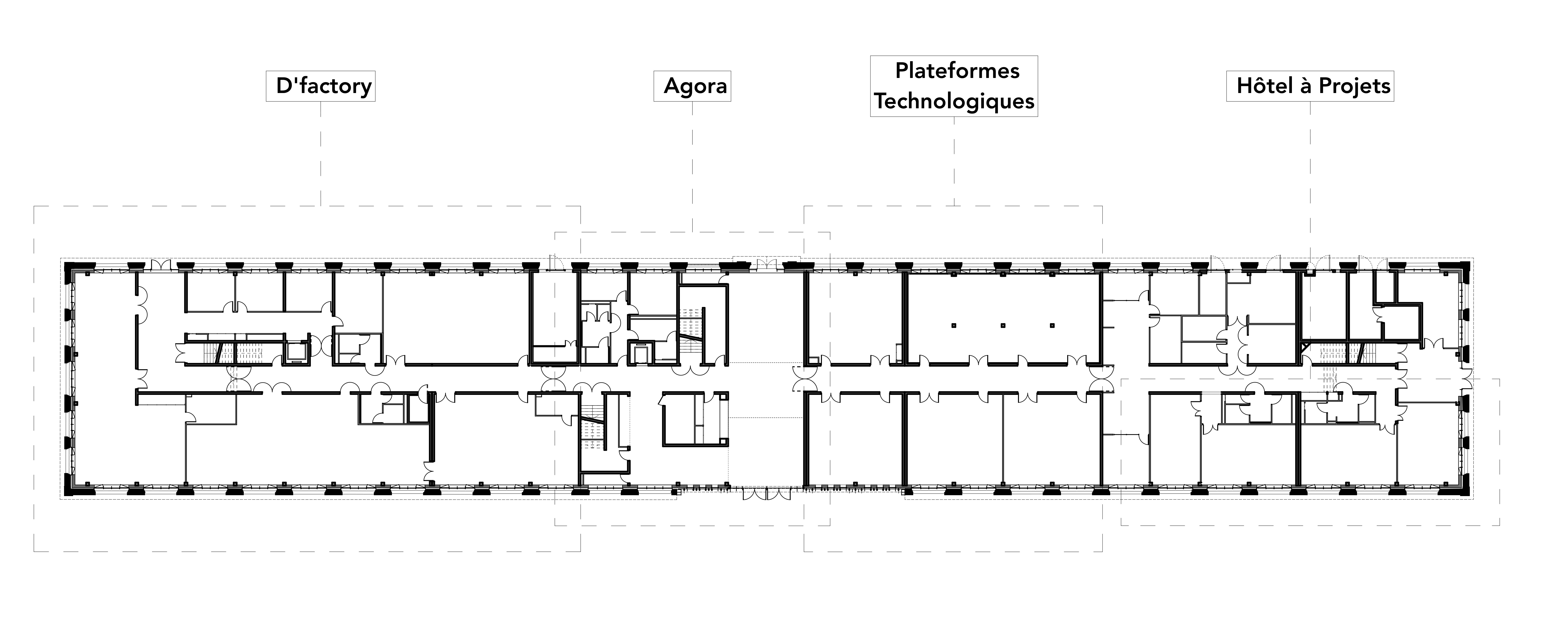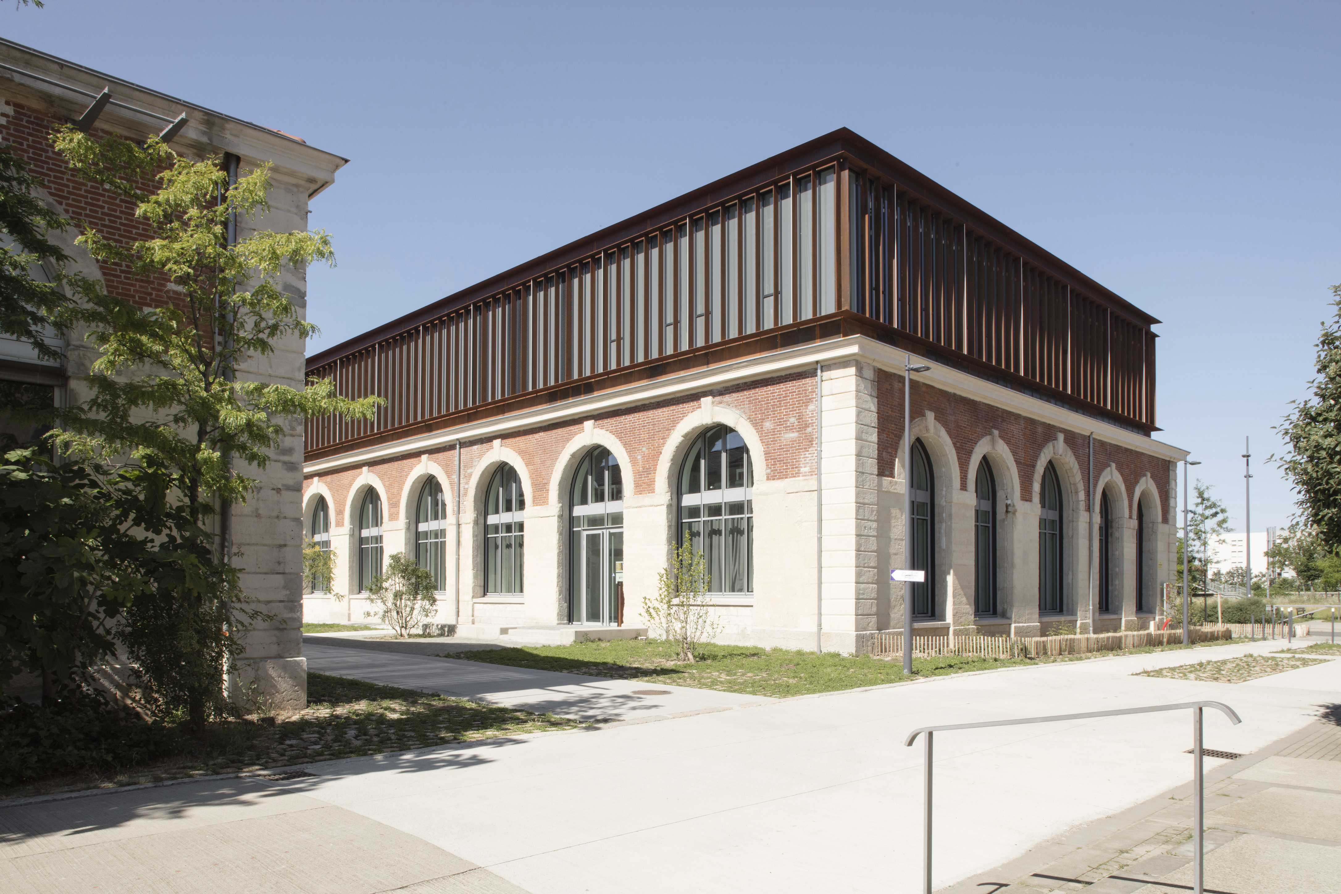 Three levels have been developed in the envelope of the former workshop. The ground floor is dedicated to the Innovation Centre, which consists of new workshops that house high-tech machines for applied research. The first floor is divided between a Learning Center (resource centre), a business incubator and innovative teaching. Finally, the top floor is entirely occupied by a teaching centre. The interior architecture is sober and bright. The muffled ambiences combine whites and matt minerals with raw concrete. The agora sets the scene for this theme on a triple height. The roof is covered with zinc and oriented in an impluvium to make it disappear into the urban landscape and to reduce the depth of the skylights intended to naturally light the central axis of the floors. No unsightly machines such as air handling units were placed on this roof. All these elements have been integrated into the built volumes. Finally, the structural stone of the remains was restored and integrated into the overall static scheme. A singular complex, interposing a wood-frame wall and concrete porticos to the stone, was designed especially for this operation.