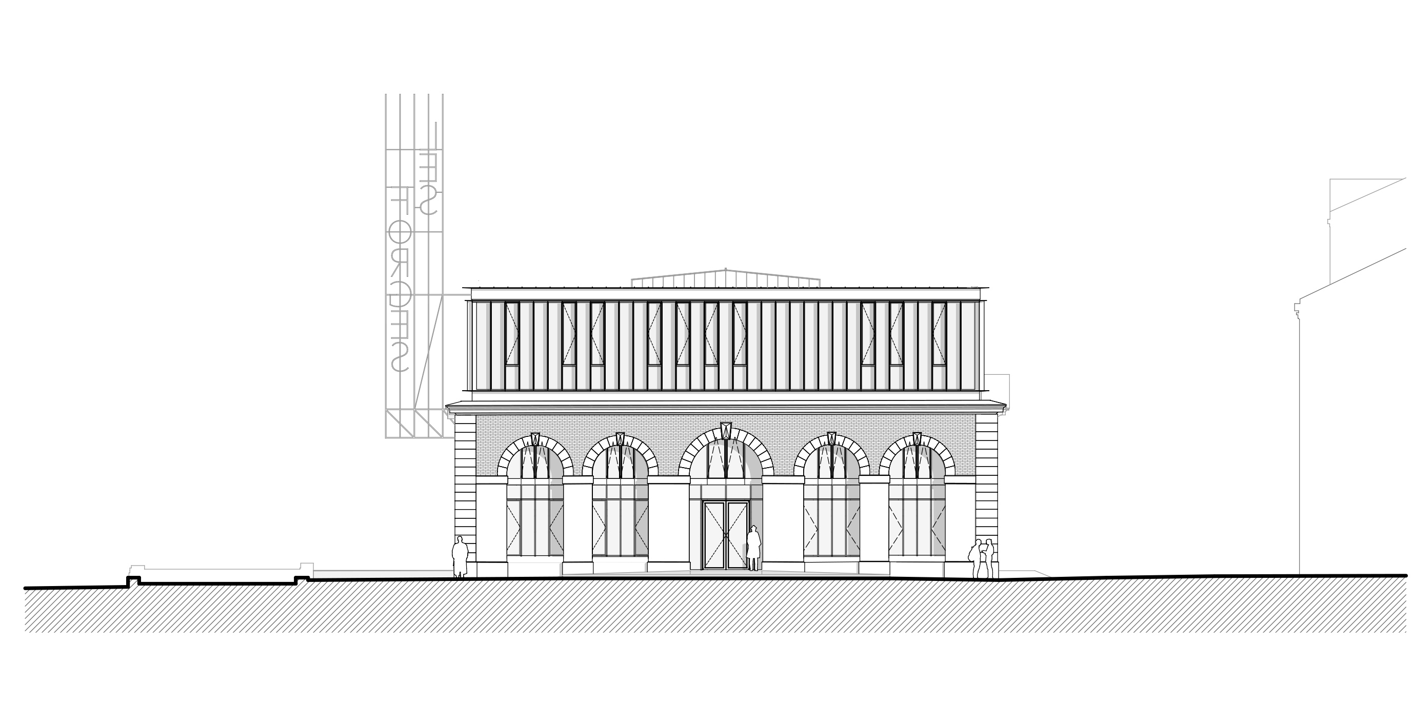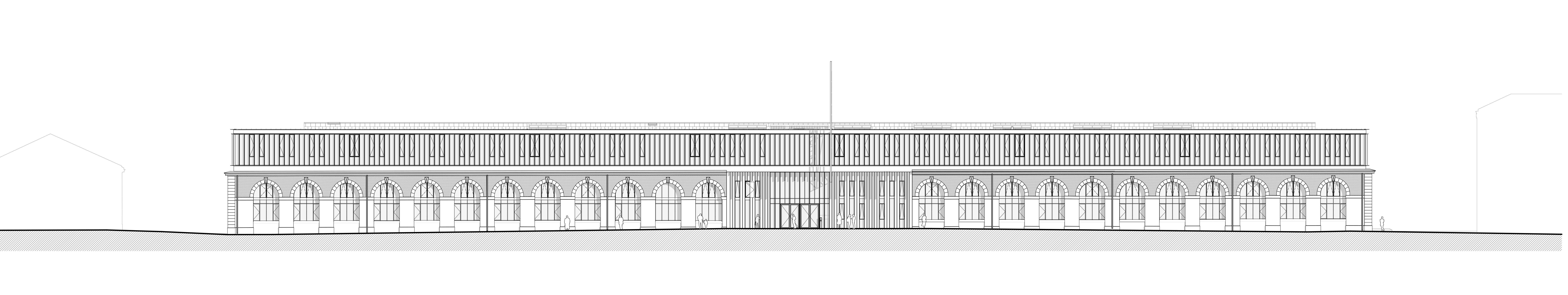 It was a time when natural light was a must and the facades of the workshops vied with each other to capture it. It was a time when Romanticism was slowly moving towards modernity. With this in mind, the extension building volume was designed as a glass abstraction with a timeless pre-weathered metal. The object is materialised by a systematic repetition of vertical bands alternating glass and metal. These graphic lines follow one another in an inflexible rhythm and run across the four façades of the project. Seen from the front, the rusty steel strips hide from view and give a transparent massiveness. Seen in profile, the steel blades quickly hide the thin openings and give the impression of opaque massiveness. Thus, those who walk along this façade will see it become more opaque the further they look. The six bays of arcades, formerly destroyed in the central part after the building was abandoned, have been reconstituted in this spirit of atemporal abstraction. Here, the steel blades are densified on the traces of the stone arches to evoke their disappeared contours.