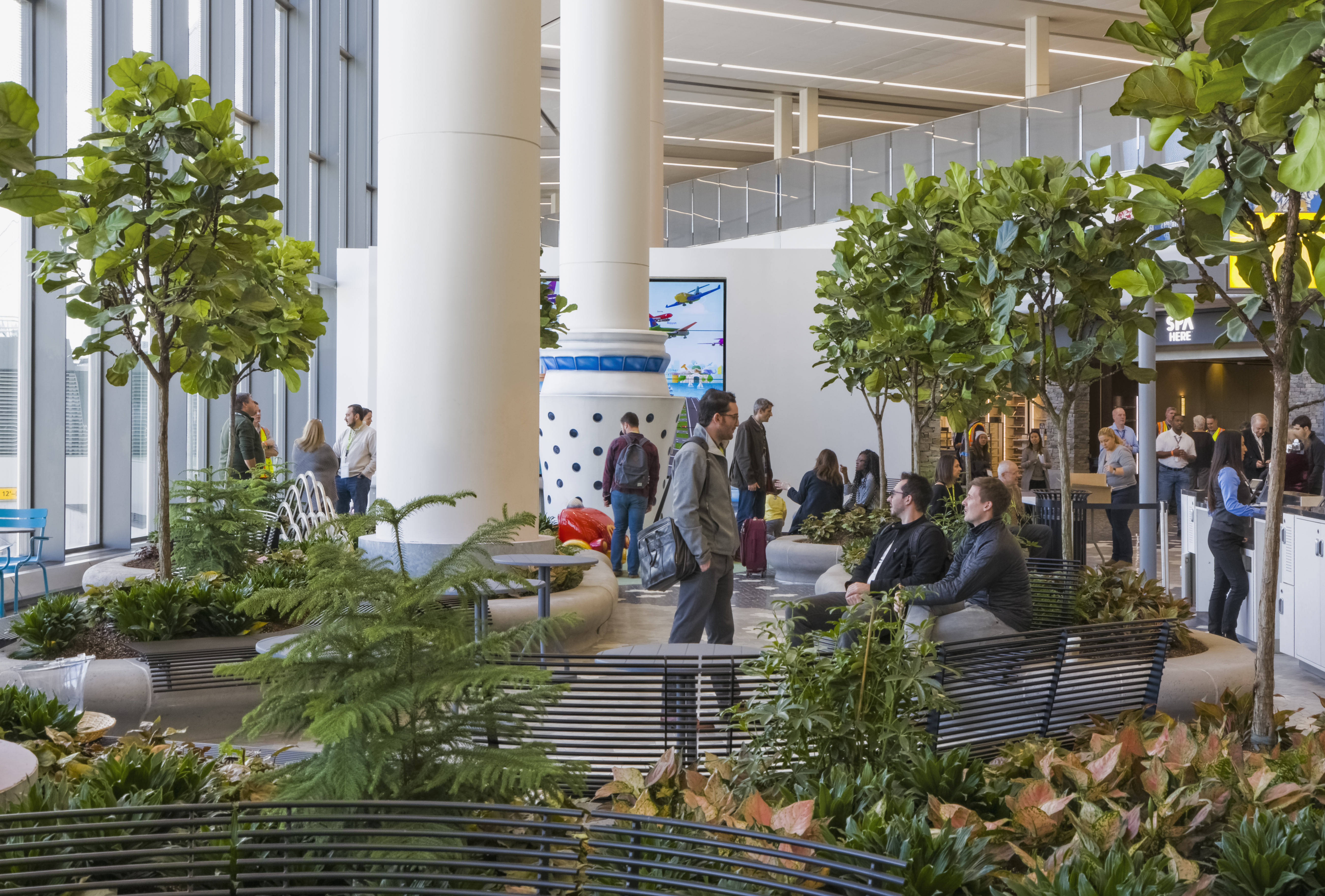 LaGuardia Airport’s new Terminal B symbolizes the top-to-bottom transformation of one of the nation’s highest-profile airports. The design draws on the architecture, history and geography of New York. Grand-scaled sequences—reminiscent of Grand Central Station—include 60-foot-high ceilings and floor-to-ceiling windows. Majestic pedestrian bridges connect the Arrivals and Departures Hall to island concourses and free up valuable taxiway for aircraft. The bridges double as a metaphor for New York, a city of islands and bridges, and provide stunning, panoramic views of Manhattan. Retail and dining ‘neighborhoods’ include New York originals such as Brooklyn Diner, Gotham Newsstand, FAO Schwartz and Shake Shack. Indoor green space are modeled after New York’s urban pocket parks with lush landscaping and sculptural benches.