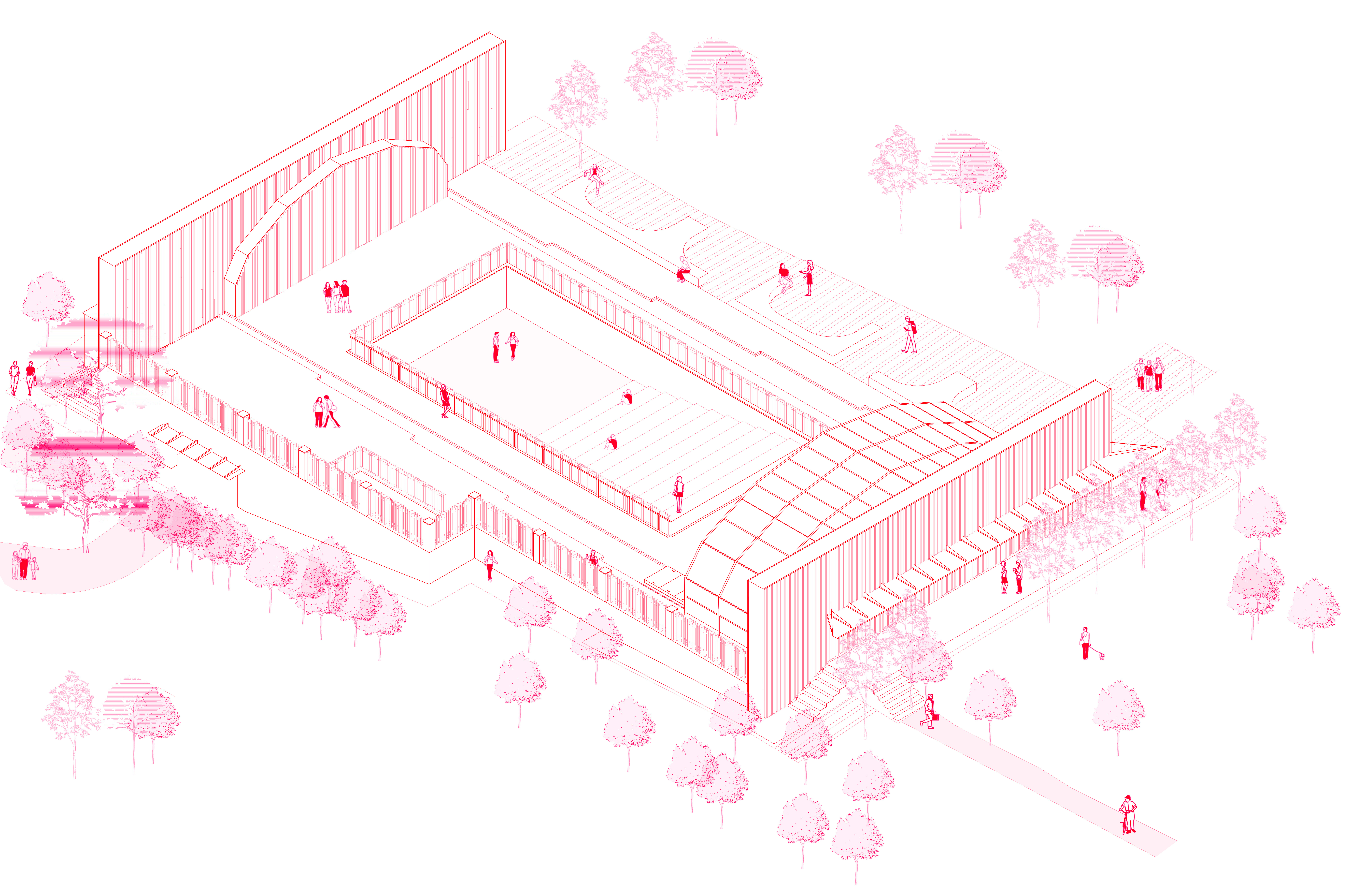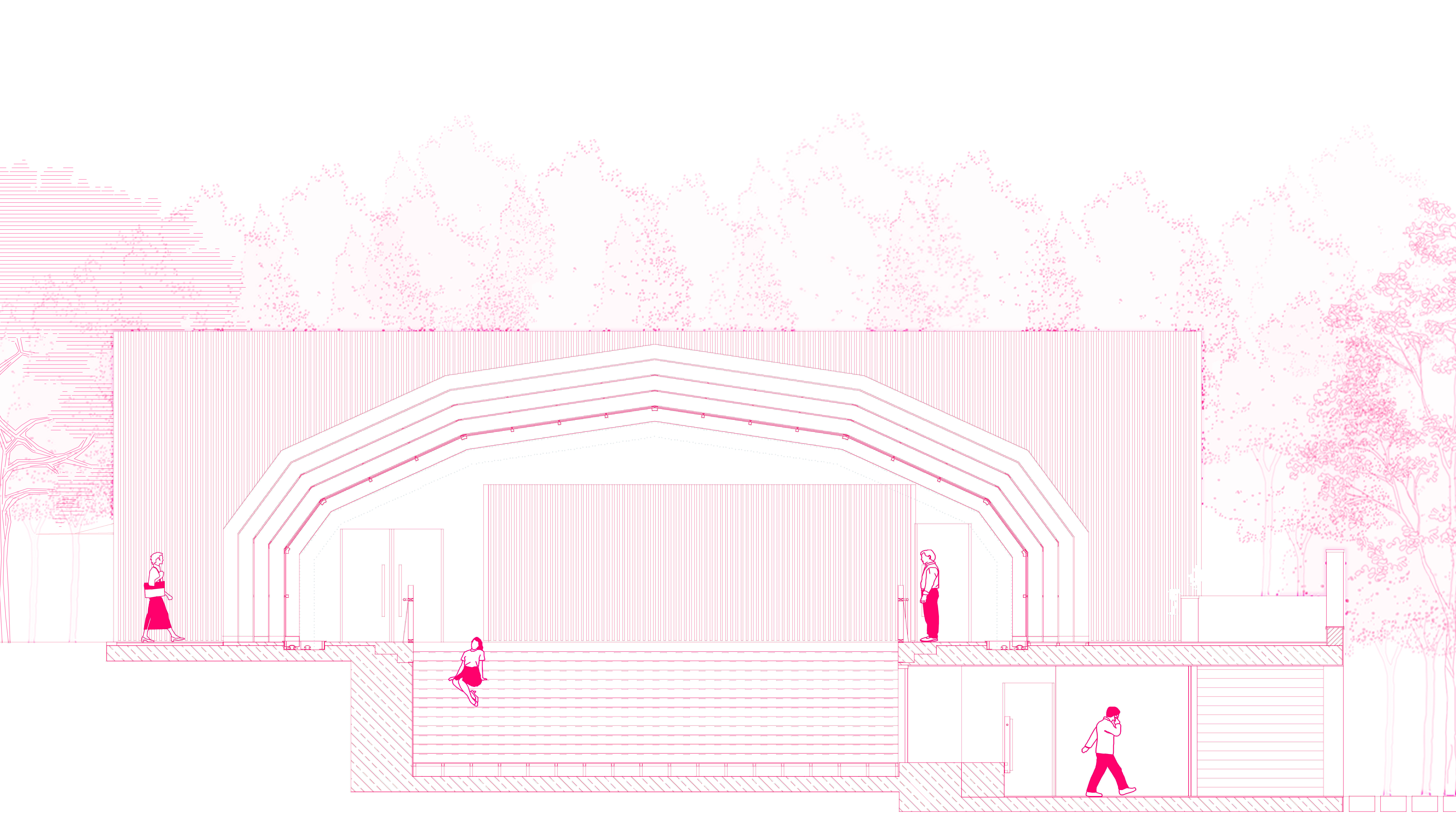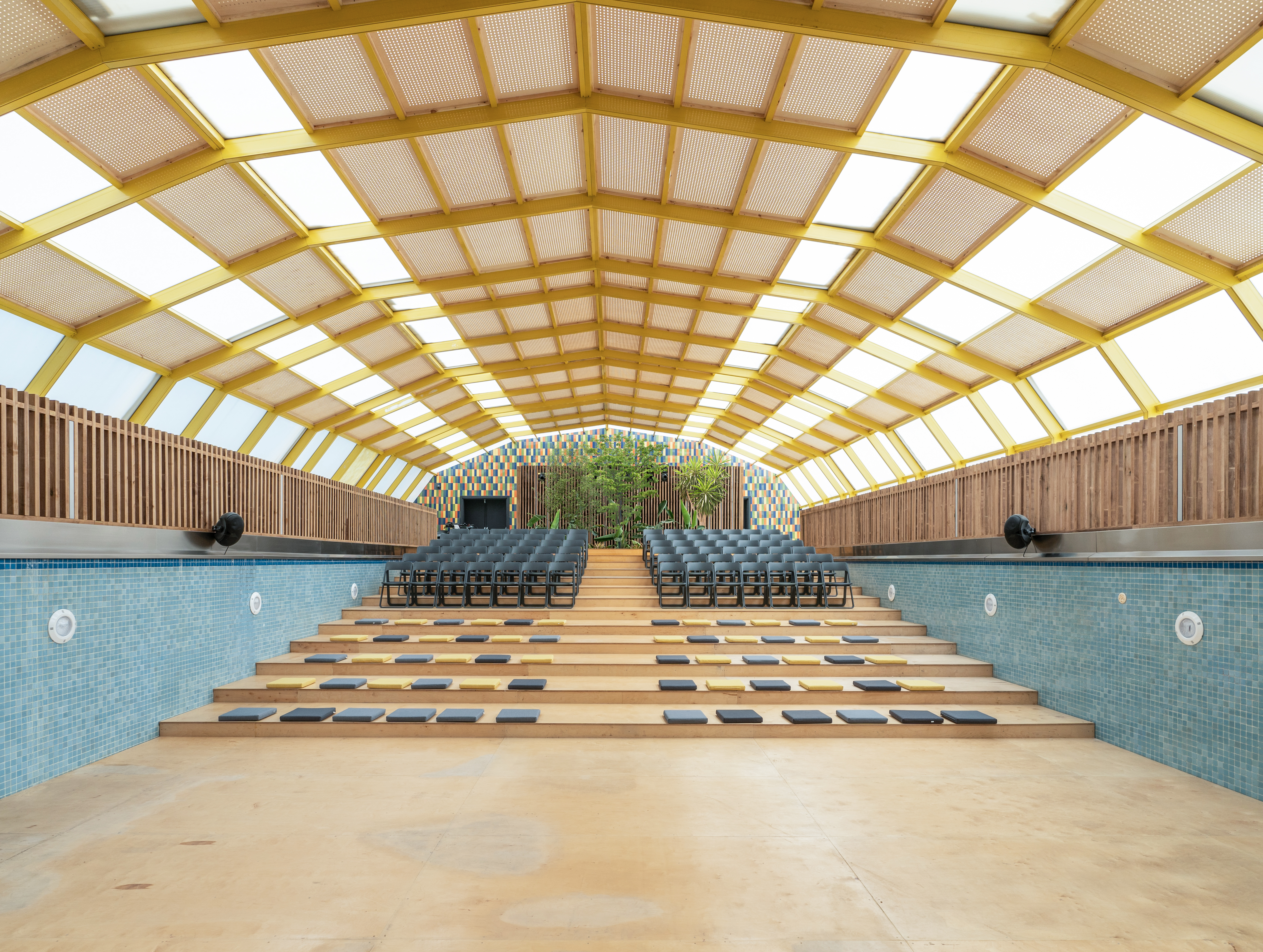 For the functioning of the pool as a public hall, the void of the pool is filled with plywood Amphi seating, while the kid's pool is now used as a winter garden as part of the foyer of the new hall. Mechanical rooms of the pool that were downstairs are refunctioned and designed as the backstage rooms. In order to provide acoustics, timber panels are anchored on the existing polycarbonate sheets of the folding cover.