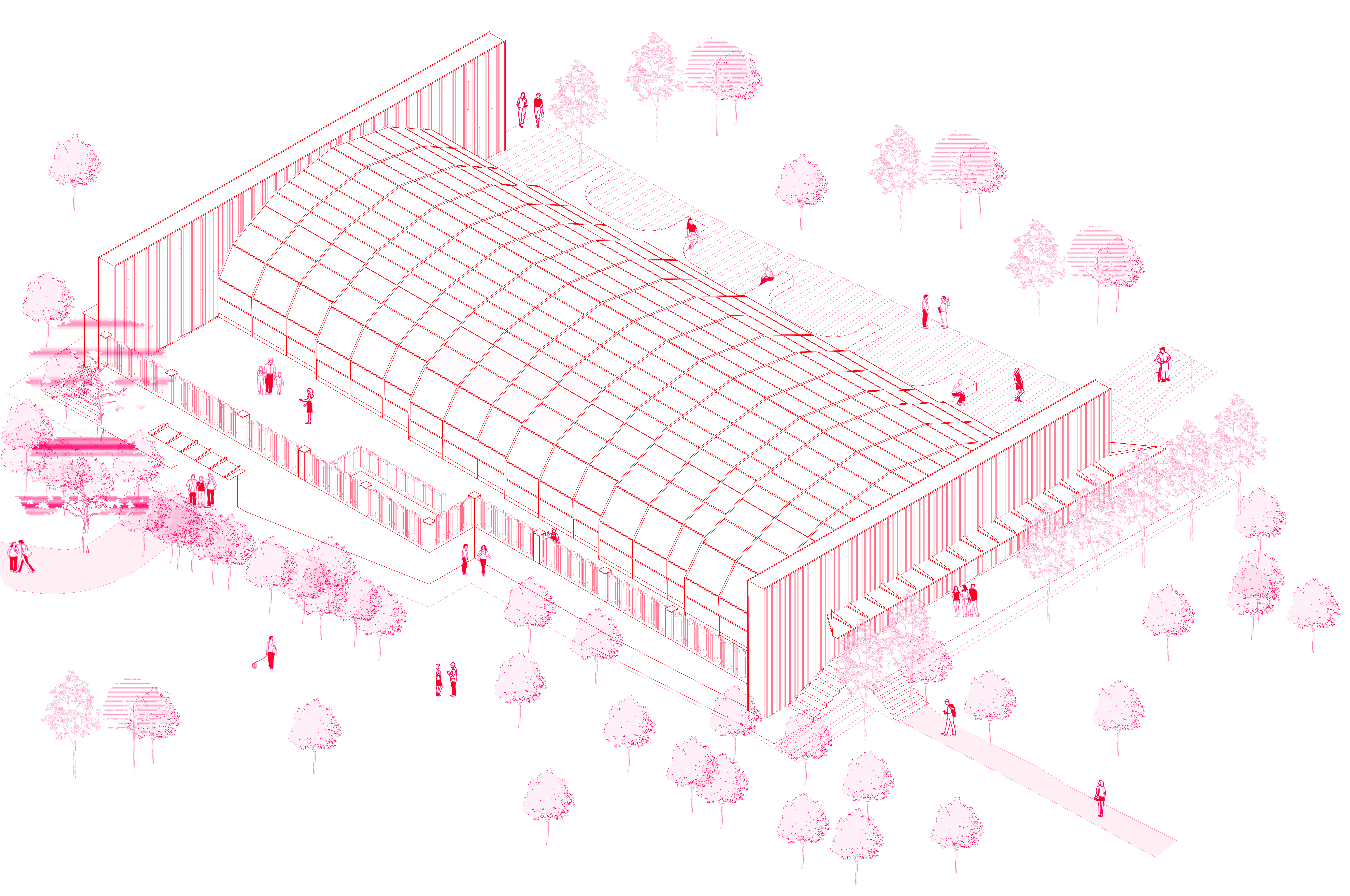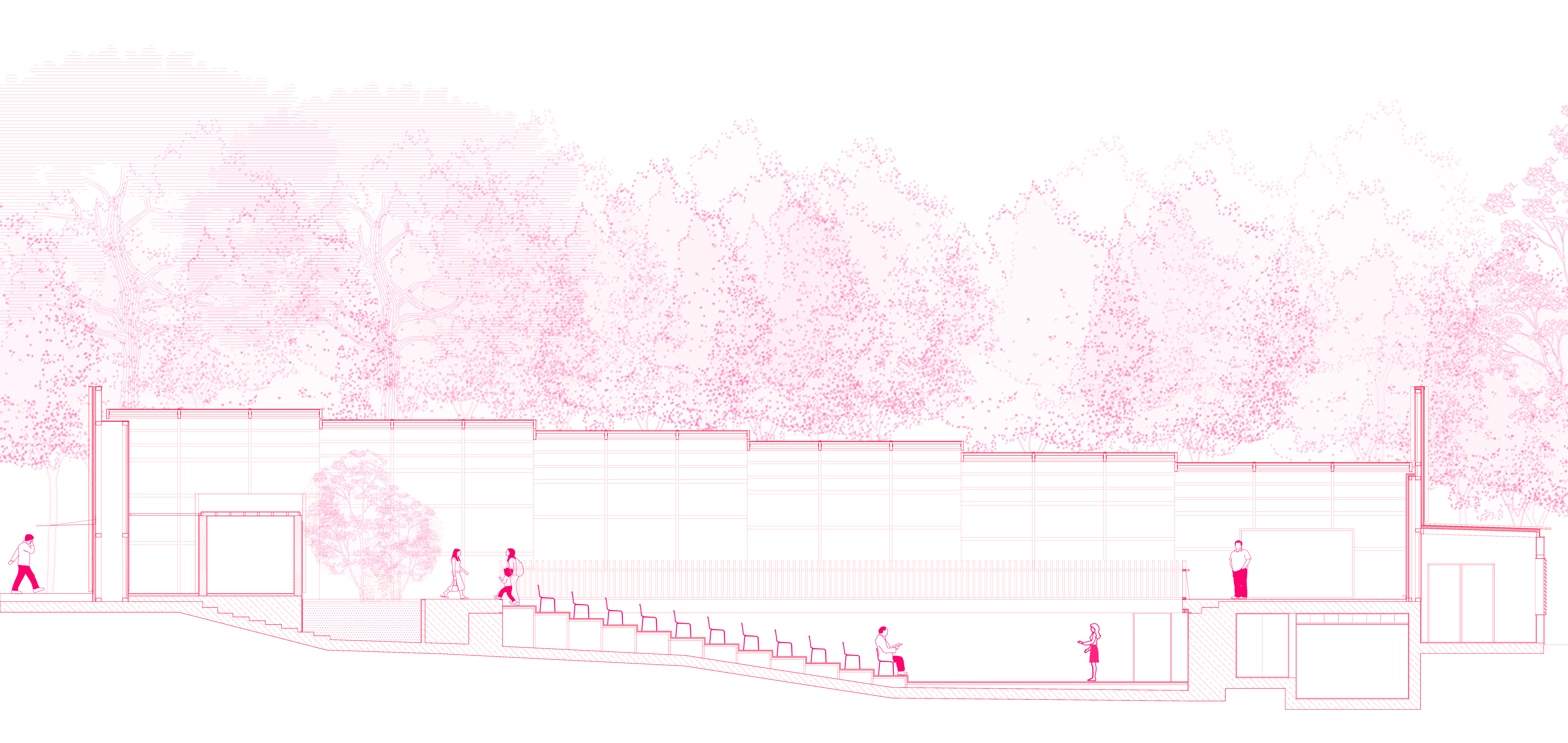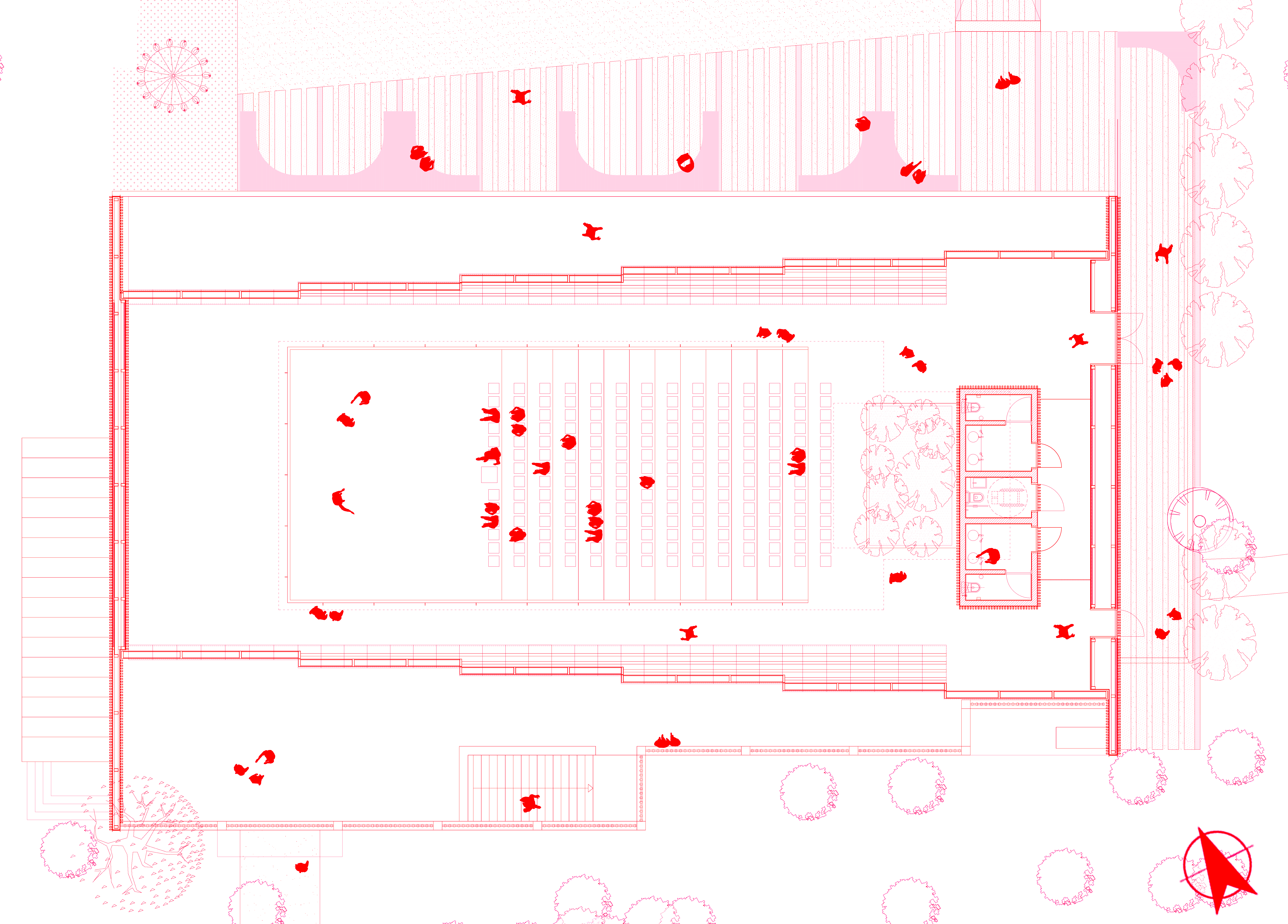 For the functioning of the pool as a public hall, the void of the pool is filled with plywood Amphi seating, while the kid's pool is now used as a winter garden as part of the foyer of the new hall. Mechanical rooms of the pool that were downstairs are refunctioned and designed as the backstage rooms. In order to provide acoustics, timber panels are anchored on the existing polycarbonate sheets of the folding cover.