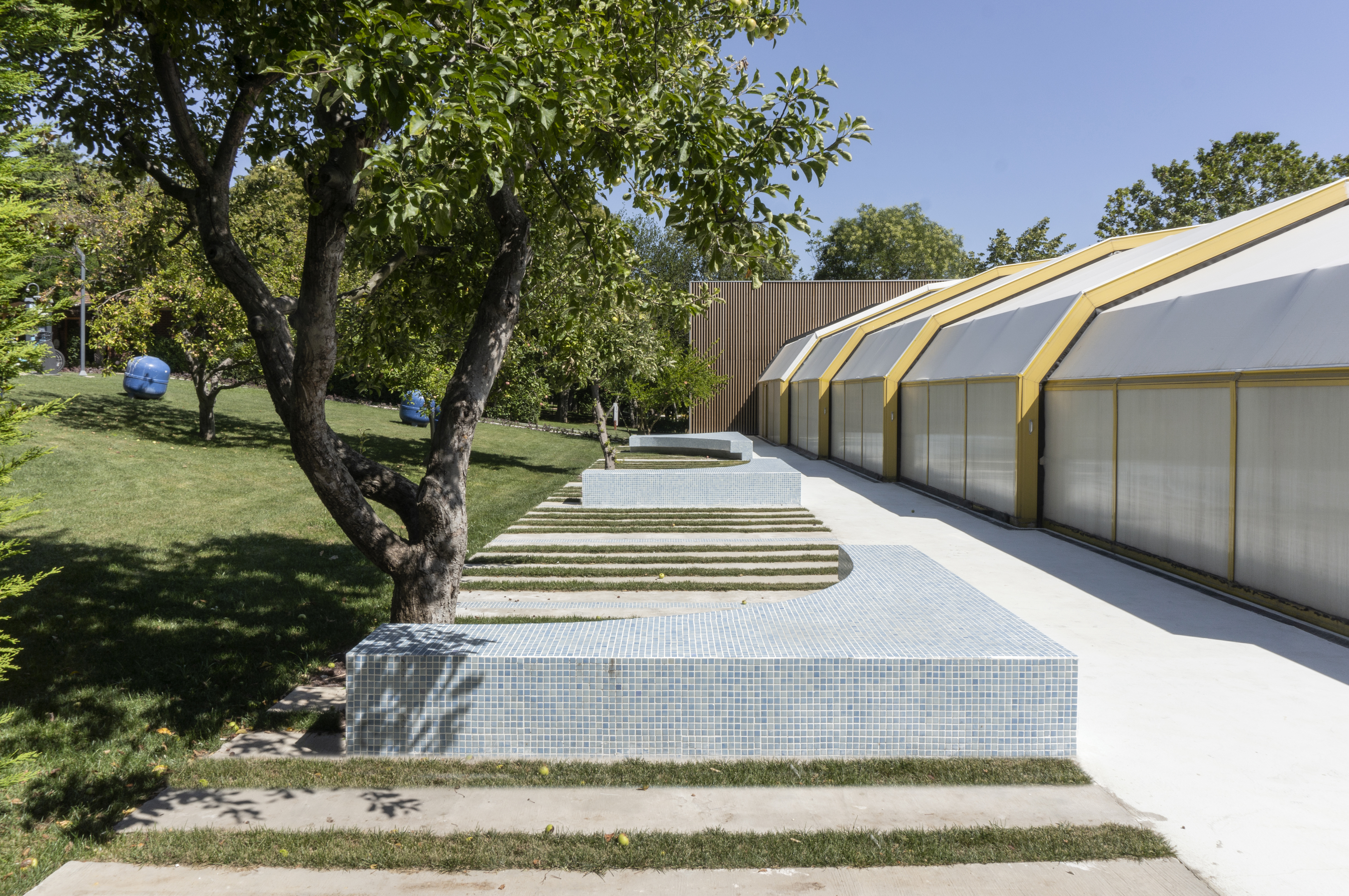 The pool is now used as an open-air event space in summer while it becomes an auditorium for 400 people in winter, when the covering structure wraps the building in bad weather conditions. As an adaptive reuse project, our starting point was to transform the existing with minimum budget and intervention by utilizing actual amenities, rather than making an elegant building starting from scratch. While IPA Florya Campus now serves as a public spot including urban research institutions as well as public event spaces, the reconfigurations of the campus.