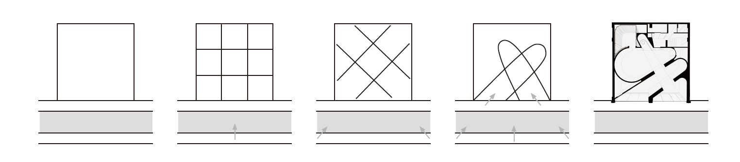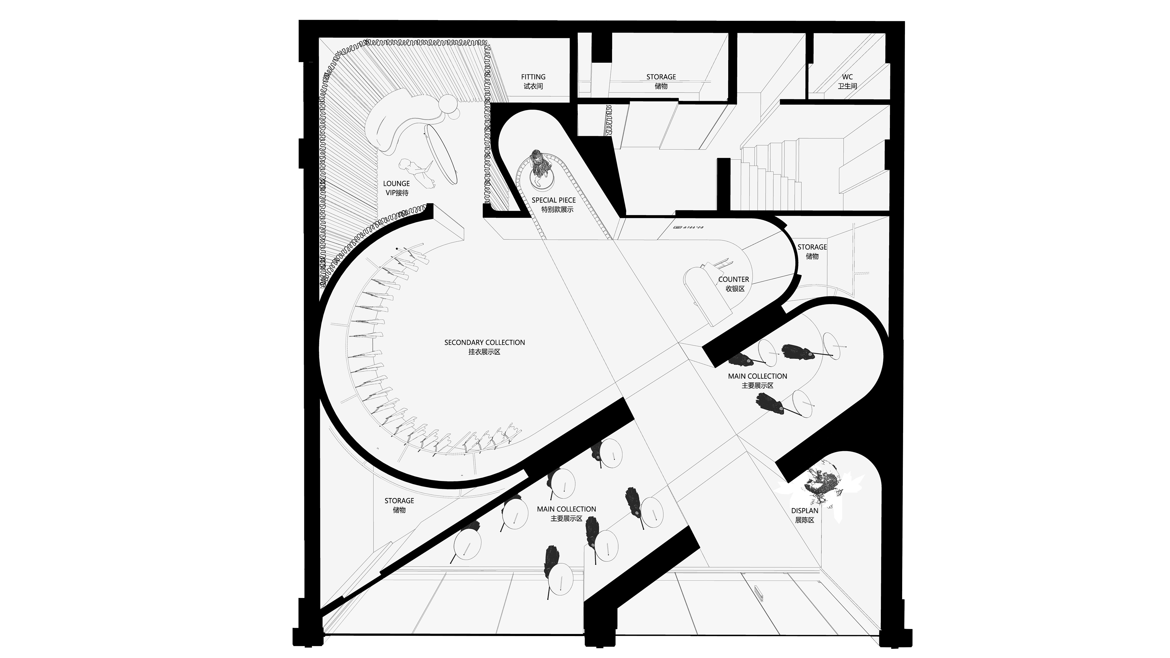 옷은 자신이 생각하는 이미지를 투영하여 보여주는 존재다. 상점 유리창 너머로 옷이 전시되는 방식은 거울 속 무대이다. 고객들은 쇼윈도를 지날 때 거울에 비친 자신의 모습을 본다. 시각적 반사는 또한 도시, 거리, 나무 및 햇빛에 대한 고객의 관심을 포착하여 흥미로운 사람과 물체의 상호 작용을 생성한다. 사람, 사물, 도시, 자연의 다중 반사는 현실과 반사의 상호작용적 관계를 불러오는 것이다. 이렇게 이 상점에 사용된 거울은 고객들이 더 가까이 다가갈 수 있도록 만드는 요소다. 휘어진 벽과 옷걸이와 메탈 소재의 가구는 뚜렷한 대조를 이룬다. 디자이너는 곡선과 부드러운 터치감을 더하기 위해 곡선 건축물처럼 접히는 벨벳 커튼을 설치했다. 중앙에 있는 큰 거울은 예술적인 매력을 발산 하며 아주 은밀하고 개인적인 공간을 만들어 낸다.