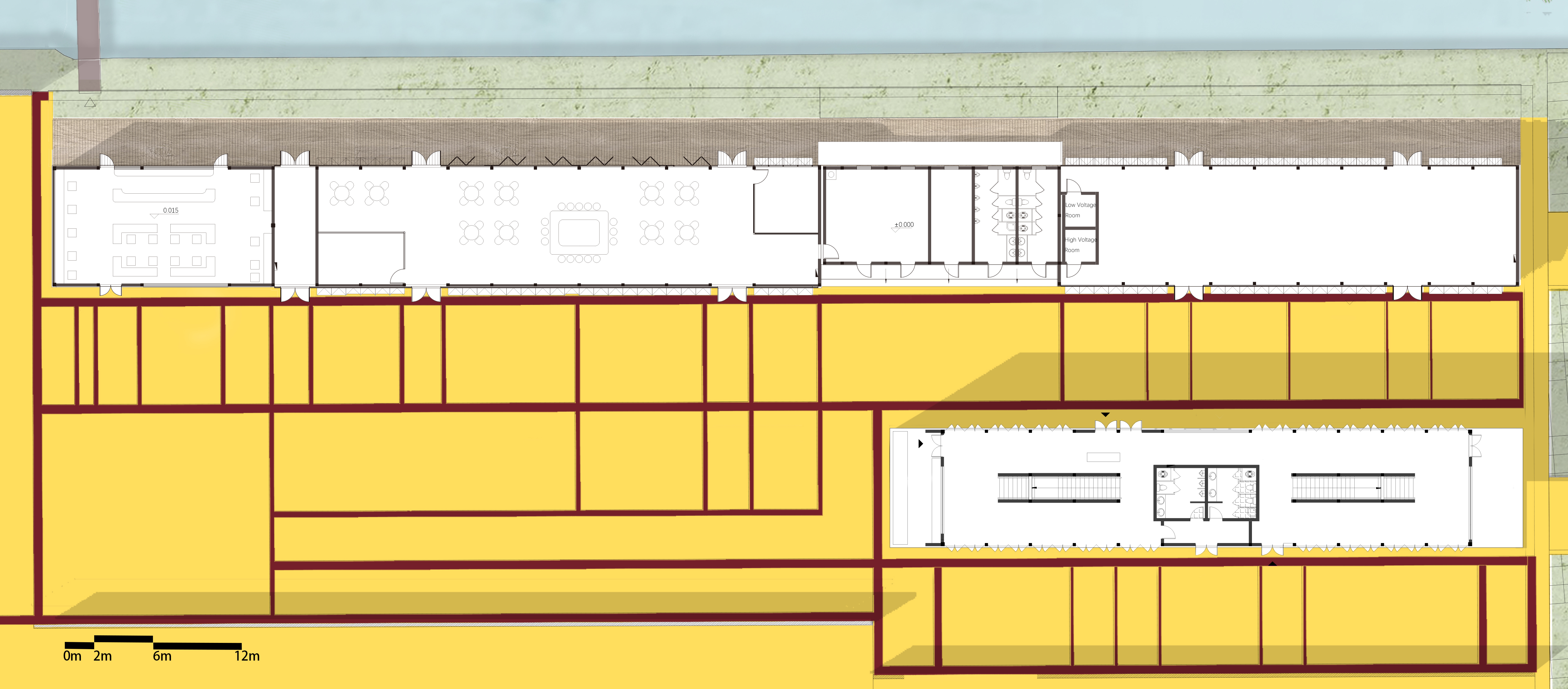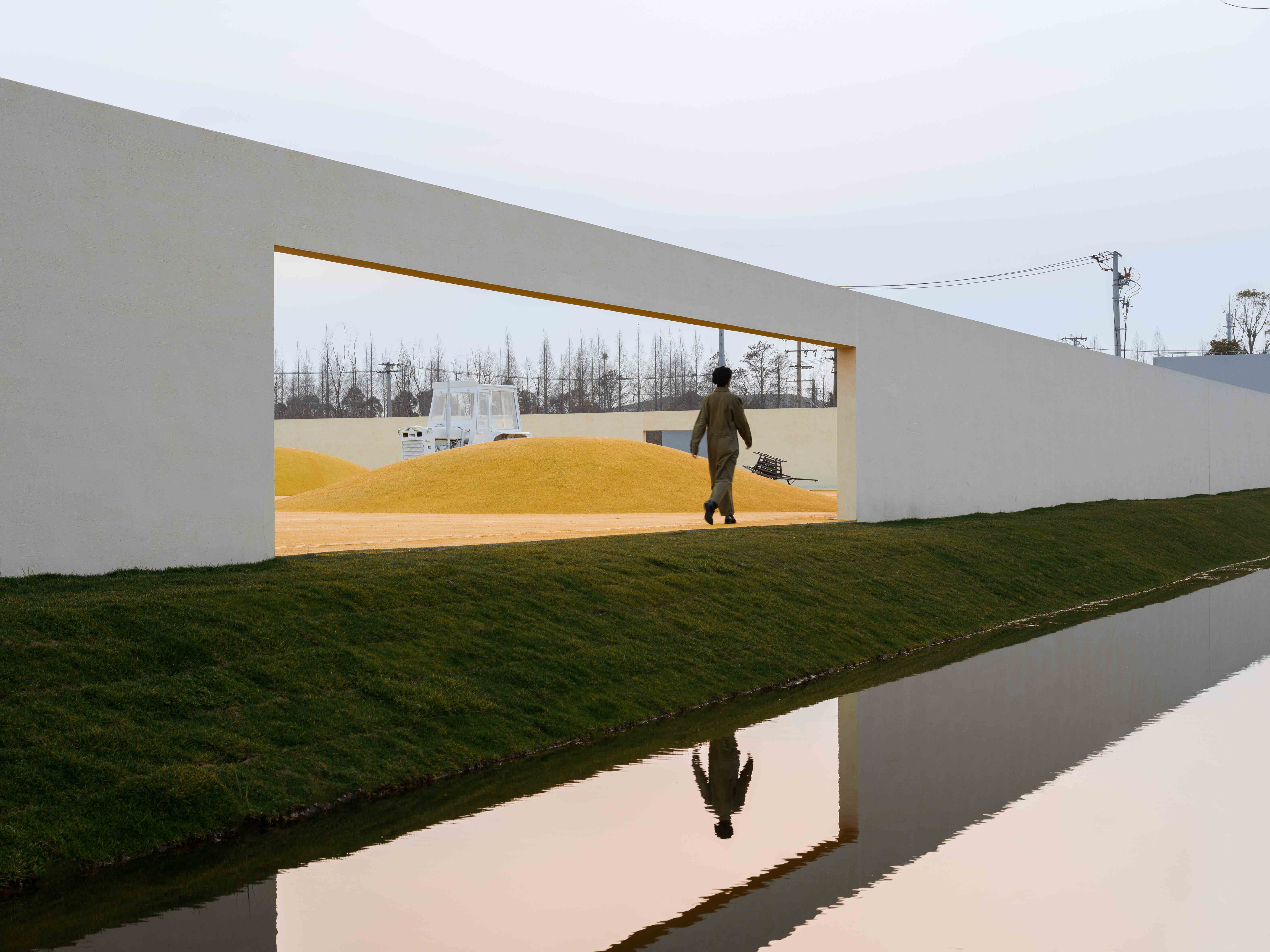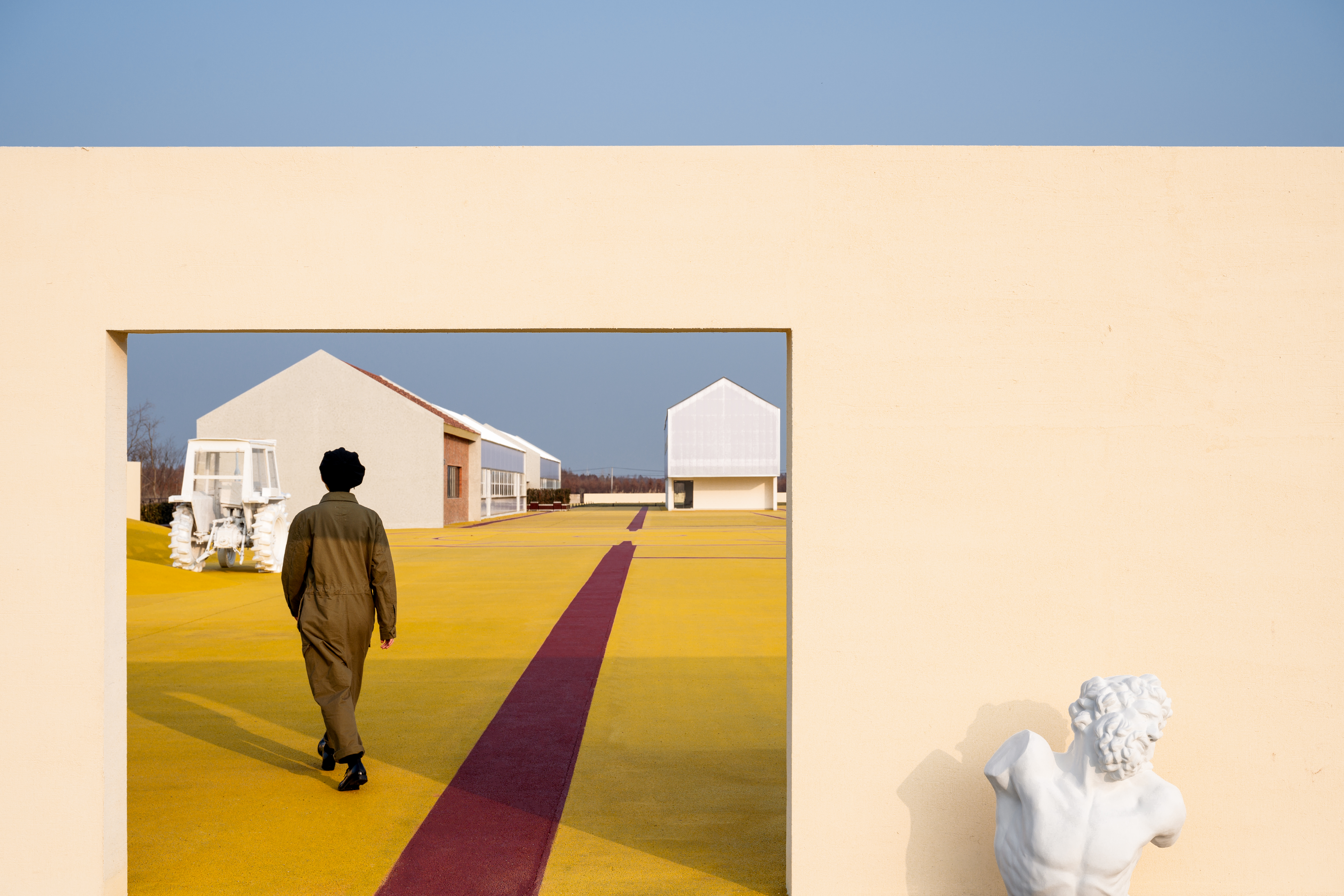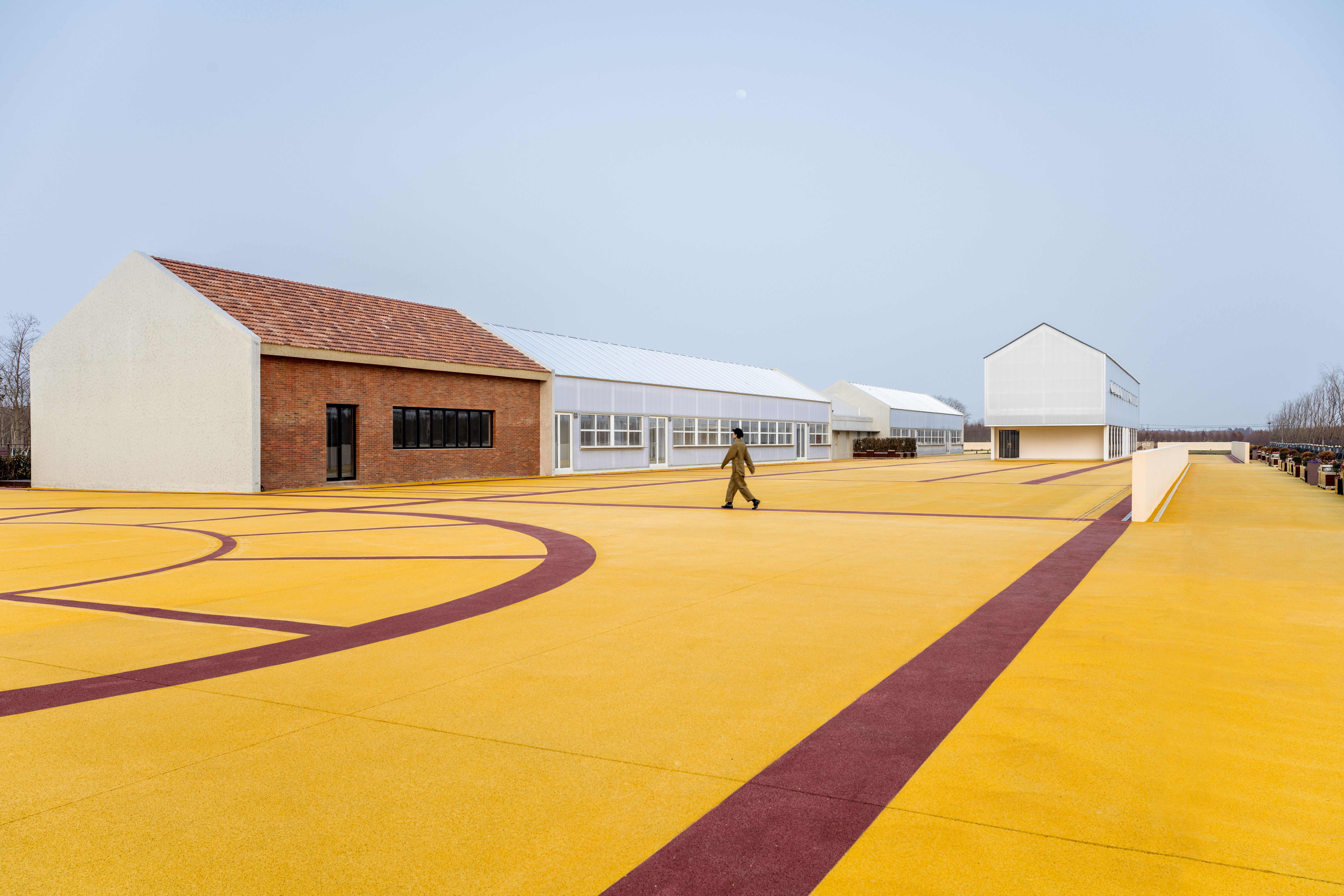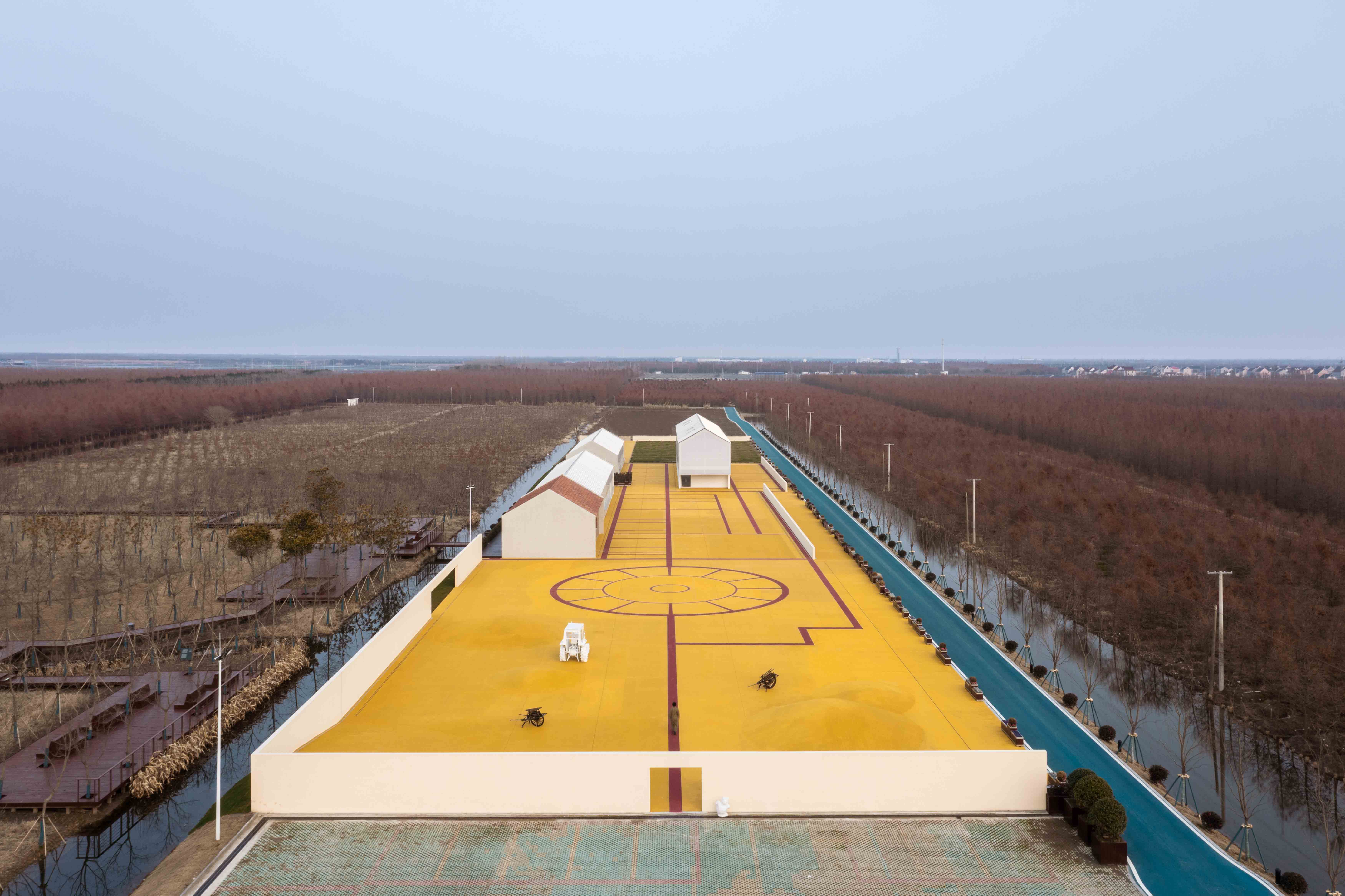 The abandoned barnyard at Dongtanyuan Outpost has been transformed into Cockaigne for all. The golden color of Golden Barnyard symbolizes the harvest and endless bounty. The designer wanted this paradise to represent "eternal leisure" and become "the best food and eatery space." This paradise is made of concrete in a golden yellow color similar to autumn paddy fields, and the use of a dark red line creates an eternal garden landscape. Some parts are divided into blocks, some are shaped like a scallop, and the open area rises slightly in terrain. Such undulating land forms a "grain heap."