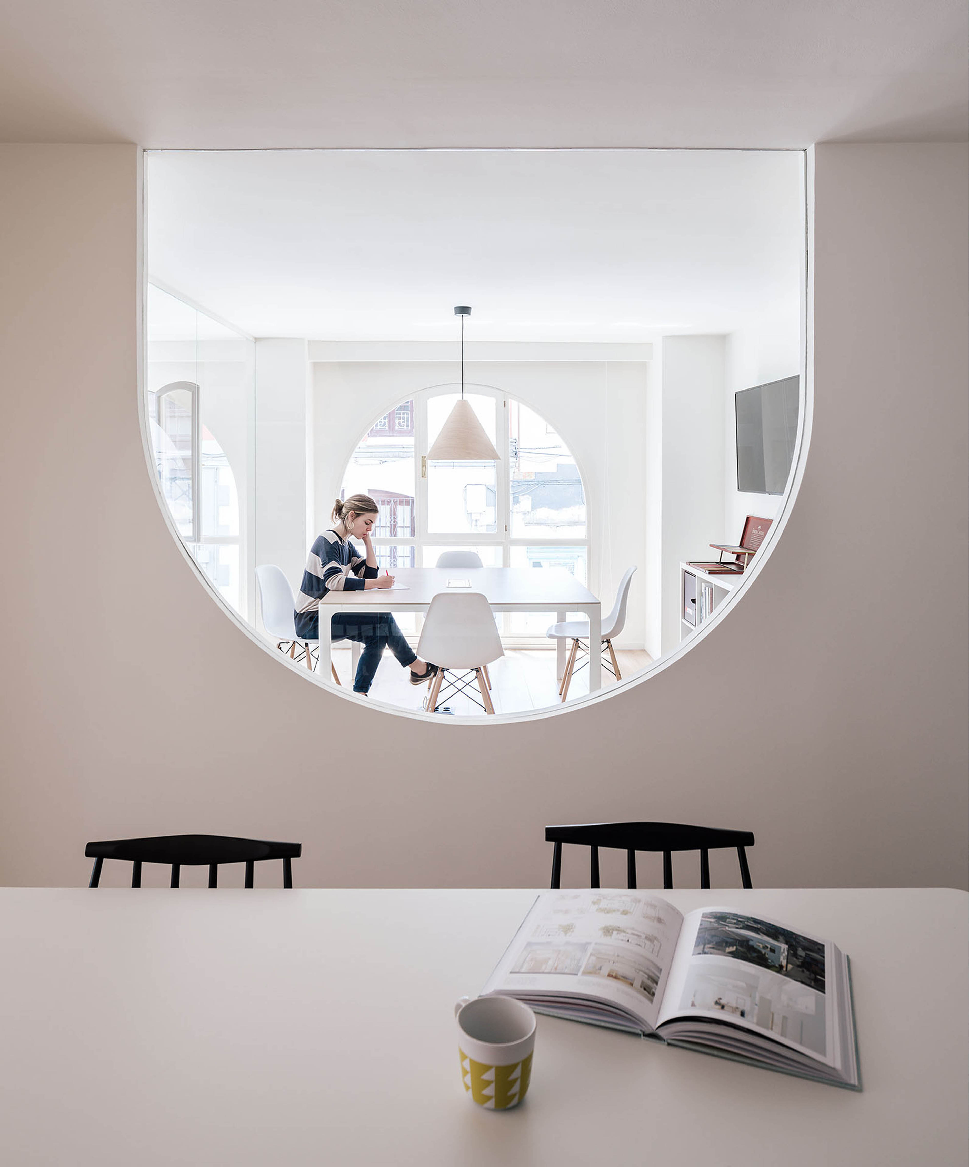 The place is located in a corner and it has two facades with a strong rhythm of windows with a semicircular top shape. This gives the space a great personality. These elements are so strong that it is going to be the leitmotiv of the local morphology itself. To solve the functional needs, the rounded arch is used as the only geometry, giving continuity and enhancing the pre-existing spatial language. In a completely diaphanous place, two elements are inserted in a way that organize the space to adapt it to the needs. The first of these elements contains all the services (toilet, office-kitchen, room for facilities and storage), while the other defines the two existing meeting areas, independent of each other, but visually connected. The rest of the space is conceived as a common room where work areas, relax and relationship are mixed. It is the distribution of the furniture itself, which establishes the circulations and stays, generating a flexible space that allows multiple configurations. The natural oak material is present in the holes of the arches and the floor. This material turns paramount due to the absence of color of the rest of the furniture and furnishings, creating a pleasant feeling of harmony.