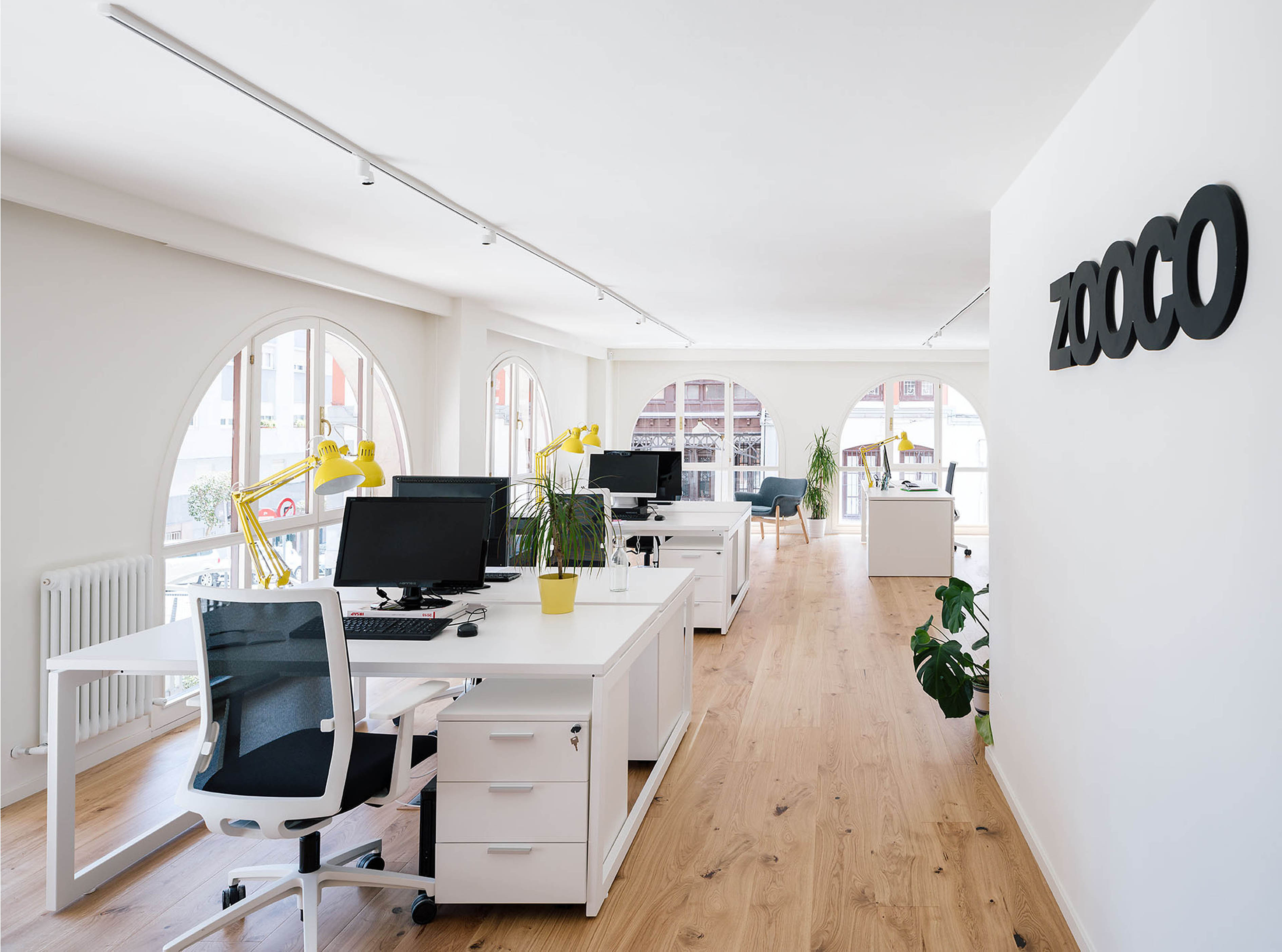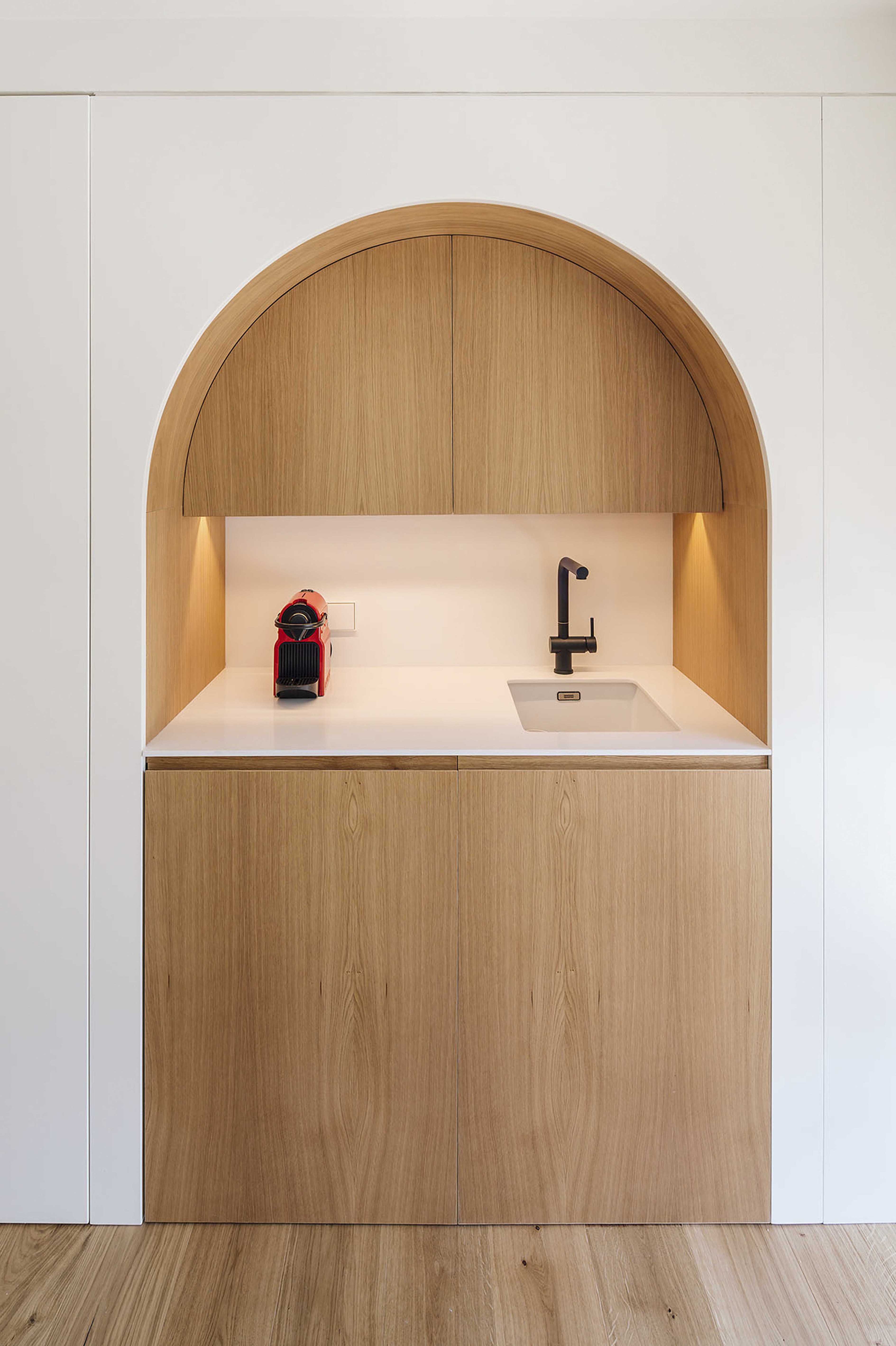 The place is located in a corner and it has two facades with a strong rhythm of windows with a semicircular top shape. This gives the space a great personality. These elements are so strong that it is going to be the leitmotiv of the local morphology itself. To solve the functional needs, the rounded arch is used as the only geometry, giving continuity and enhancing the pre-existing spatial language. In a completely diaphanous place, two elements are inserted in a way that organize the space to adapt it to the needs. The first of these elements contains all the services (toilet, office-kitchen, room for facilities and storage), while the other defines the two existing meeting areas, independent of each other, but visually connected. The rest of the space is conceived as a common room where work areas, relax and relationship are mixed. It is the distribution of the furniture itself, which establishes the circulations and stays, generating a flexible space that allows multiple configurations. The natural oak material is present in the holes of the arches and the floor. This material turns paramount due to the absence of color of the rest of the furniture and furnishings, creating a pleasant feeling of harmony.