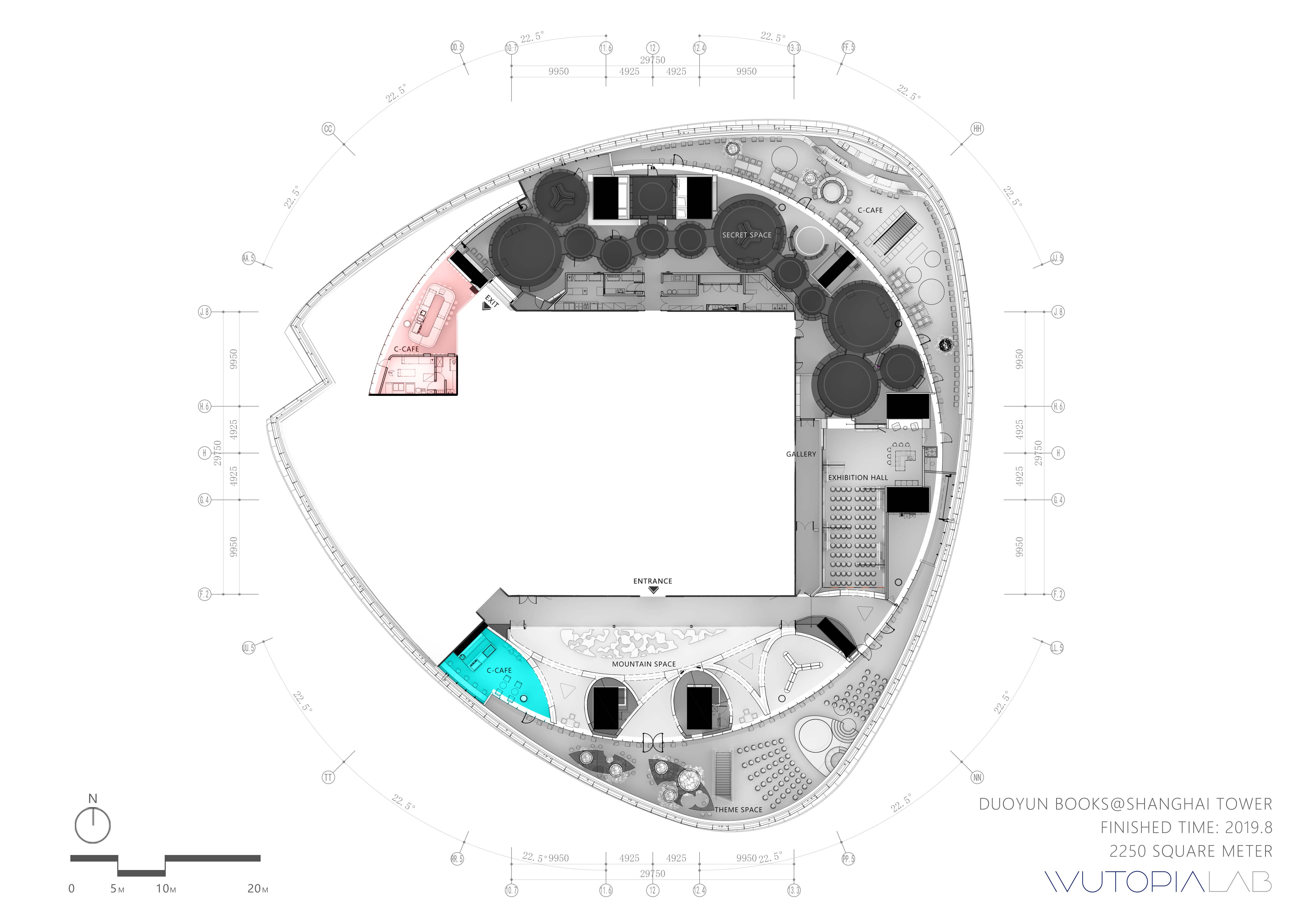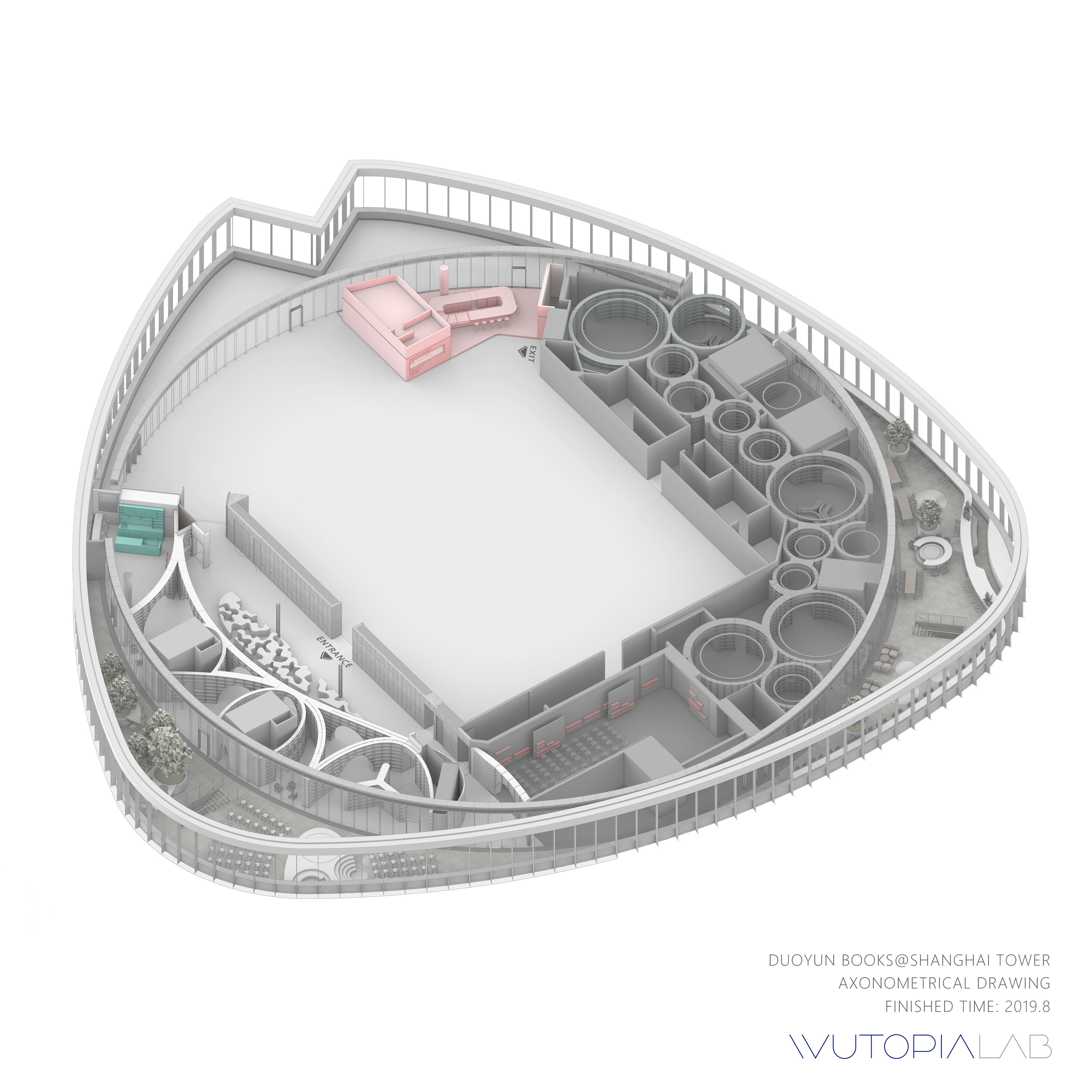 두오윤 북스(Duoyun Books)는 상하이에서 가장 높은 건물인 상하이타워 52층에 자리하고 있다. 이 플래그 스토어는 서점, 강의실, 전시실, 카페를 포함하여 7개의 기능이 모인 소규모 문화 단지다. 2,259m2 규모의 면적에 60,000권의 책과 2,000개의 제품이 진열되어 판매되고 있다. 239m 높이에 있는 이곳은 중국에서 가장 높은 곳에 있는 서점일 것이다. 이곳은 상하이의 수직적인 도시의 중요한 공공 문화 장소이며, 문화적 랜드마크다. 남측에 있는 정원에서는 구불구불하게 모습이 변화되는 후앙푸(Huangpu) 강의 장관을 감상할 수도 있다.