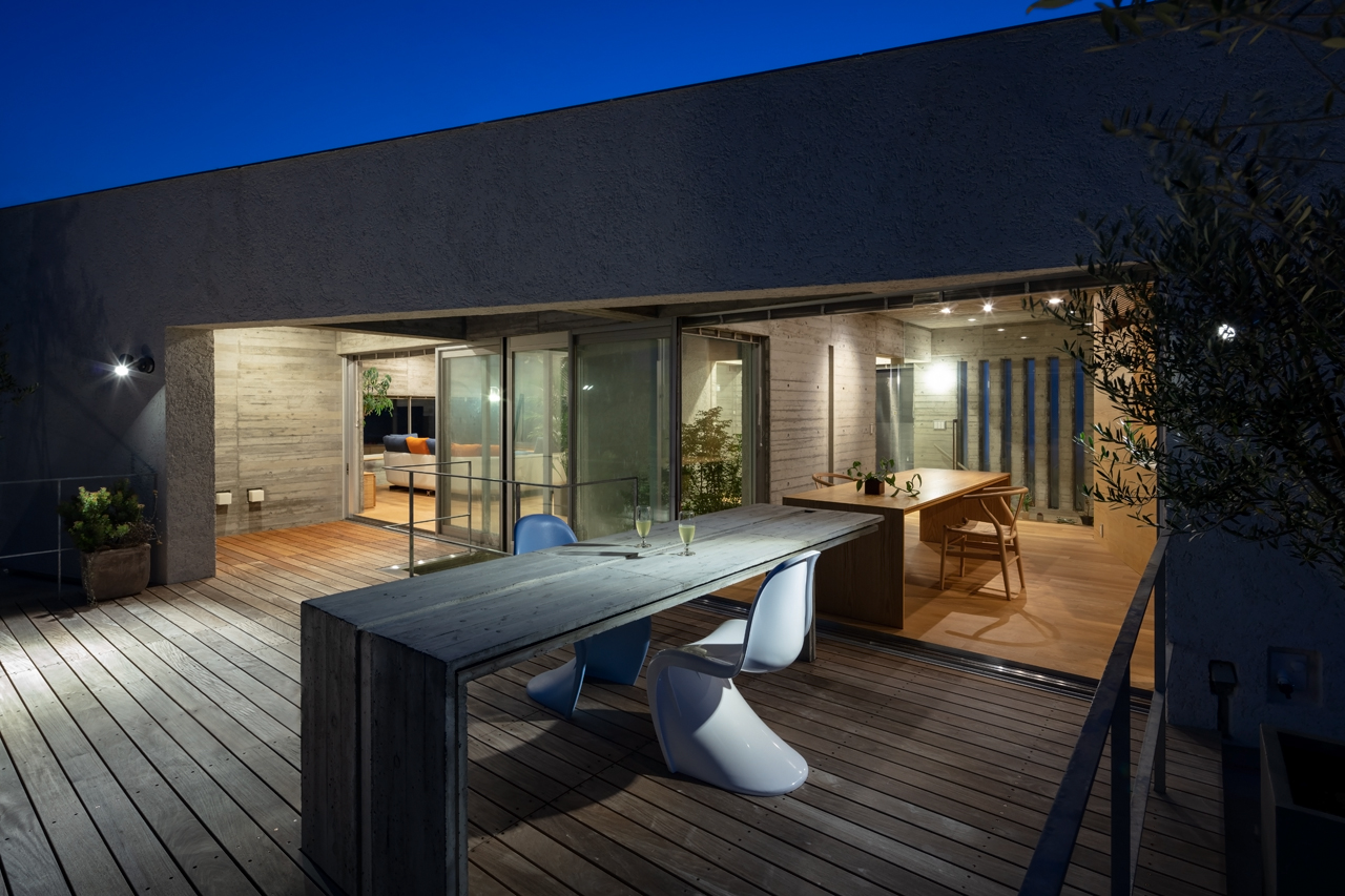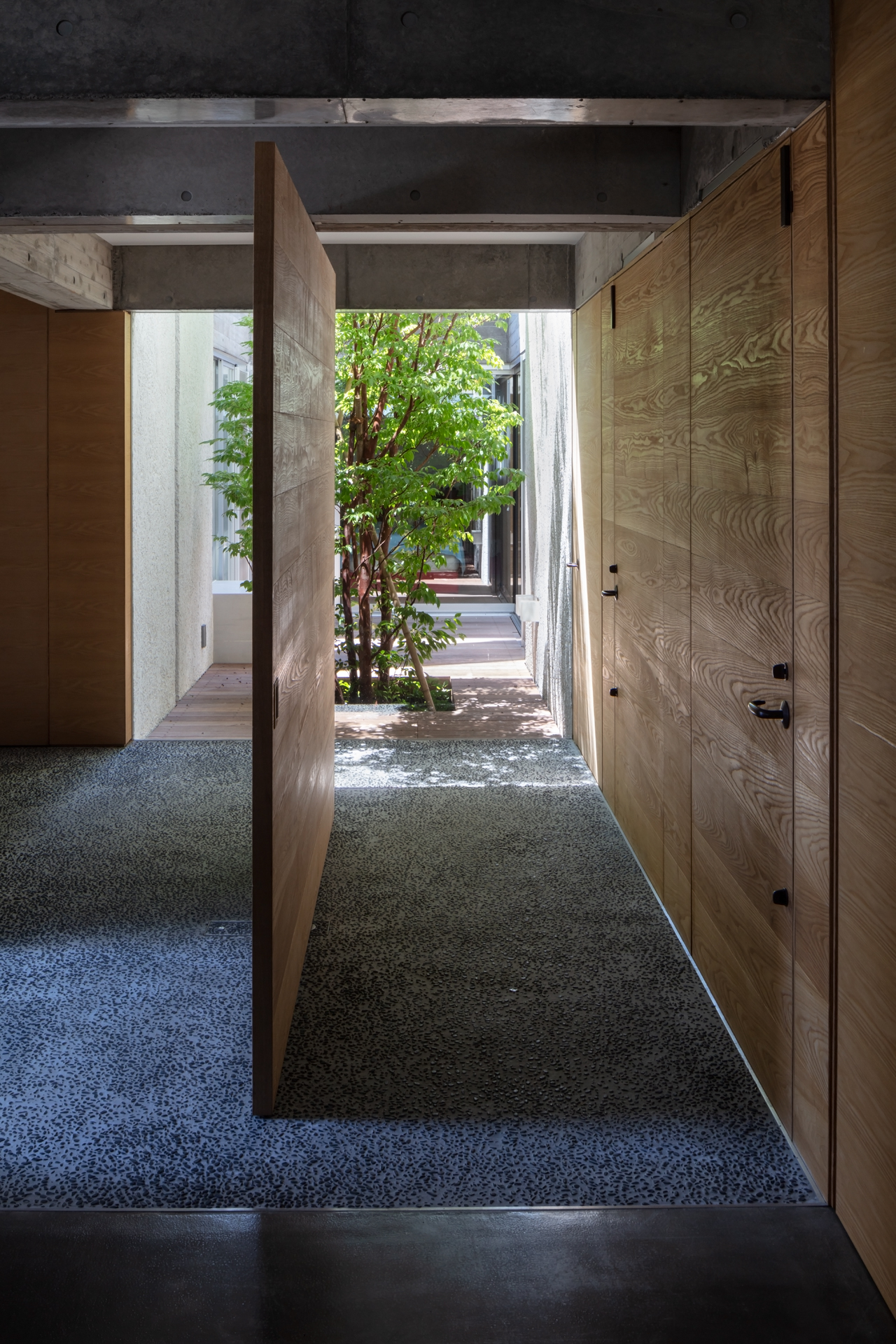 The site is located in a residential area with a view of Mt. Fuji, and has an area of about 310 square meters in a rectangular shape. The site also faces a river on the road side. The courtyard, which connects the three blocks of a private house, an apartment house, and a fitness studio, creates an important interaction and depth to the space of the house. The iconic wall, built along a diagonal axis towards “Mt. Fuji” within the rectangular frame, provides a sense of space and generous coziness throughout the house through the second floor deck adjacent to the river.