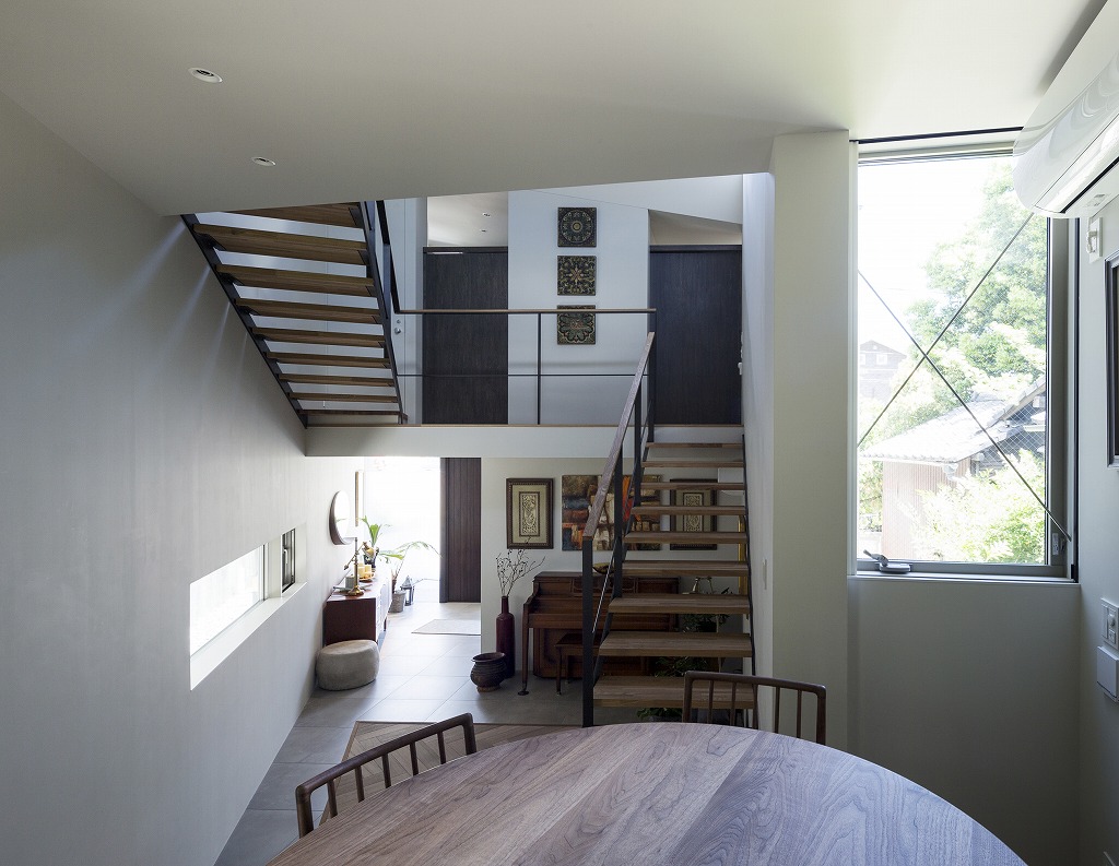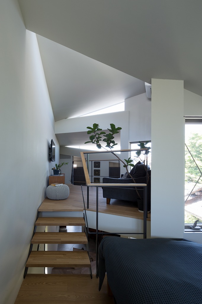 The house is built on a plot of land on a winding road that runs north-south. With a minimum width of less than two meters, it captures an afterimage of a disproportionate landscape. At the back of the site, four small masses are built in a row along the winding narrow site boundary, with sloping roofs that wave along the east-west axis for rain protection and ease of use. The small gable side, formed by uneven blocks, are openings through which light and wind enter. The narrow, winding space to the rear promotes visual diffusion.