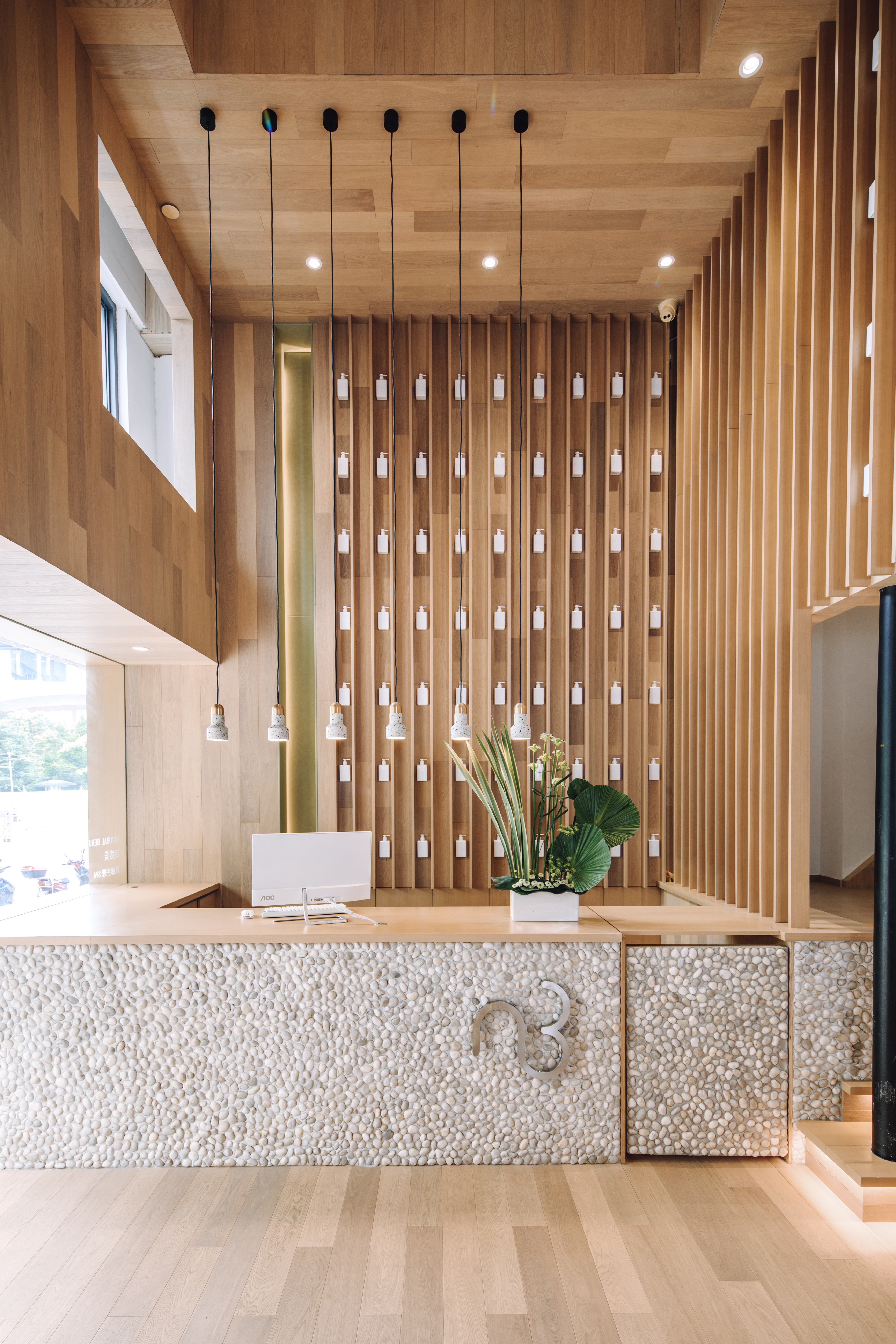 This project is to remodel the existing hair salon into a beauty salon. Creating a quiet, personal, and comfortable environment in a busy street store was the first key question of the project. As a solution to this, a space like a 'cave' was created. This space varies in size and material depending on the degree of privacy required. It was the first to expand the existing middle and double-decker area by utilizing the ceiling height of the building. Passing through here and following the corridor, which is finished with dark wood, you will find a "cave of water" covered with ivory-colored limestone. This is the waiting room, and people stay here for a while before and after using the skin care room. Every space is deliberately broken and stretched along a long stretch of aisles, trying to awaken the memories of the body that may be connected to the intimate experiences of cave dwellings in primitive times. Natural materials such as stone and wood were applied to each space, and through this space and material composition, it was intended to provide calmness to the body and mind.