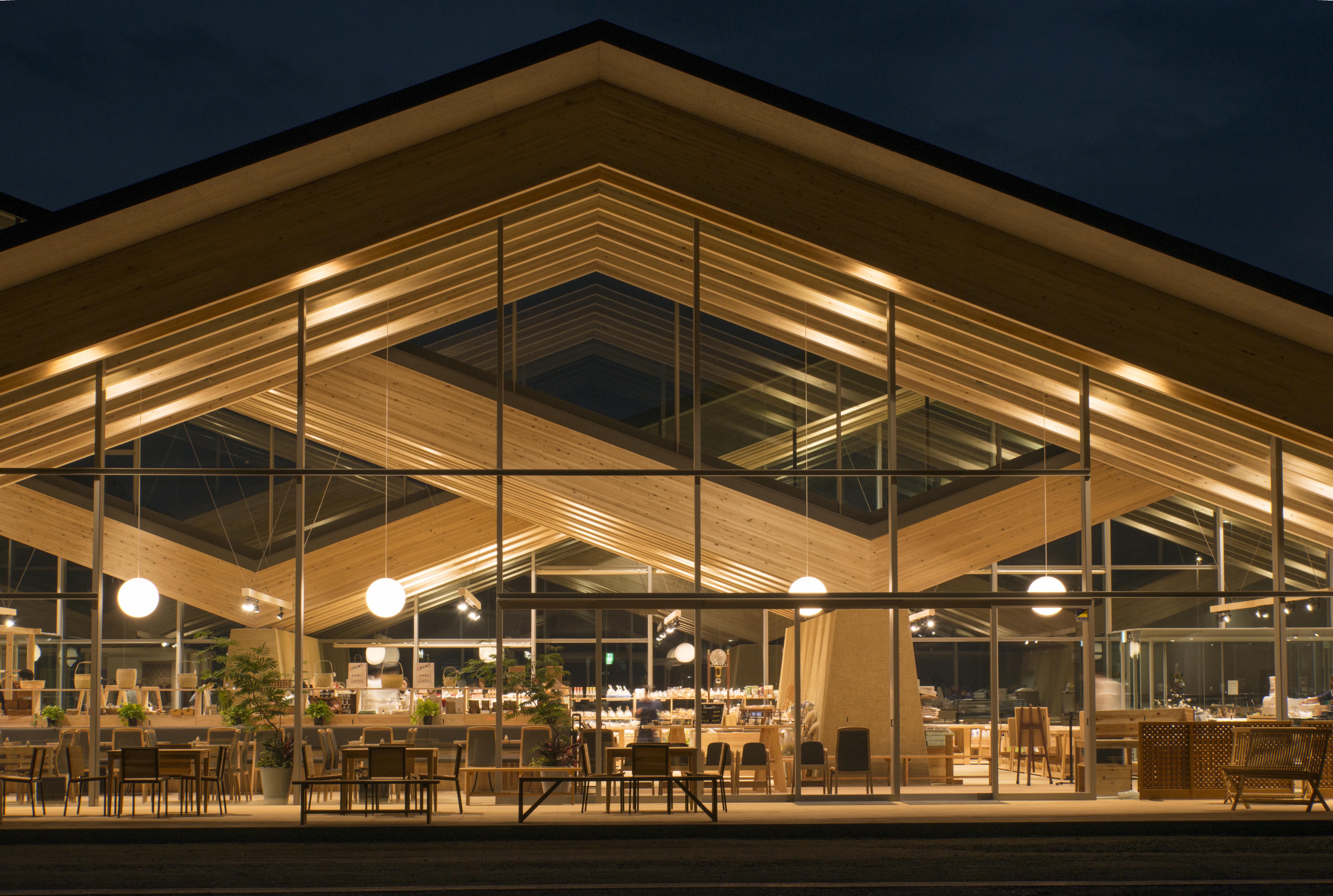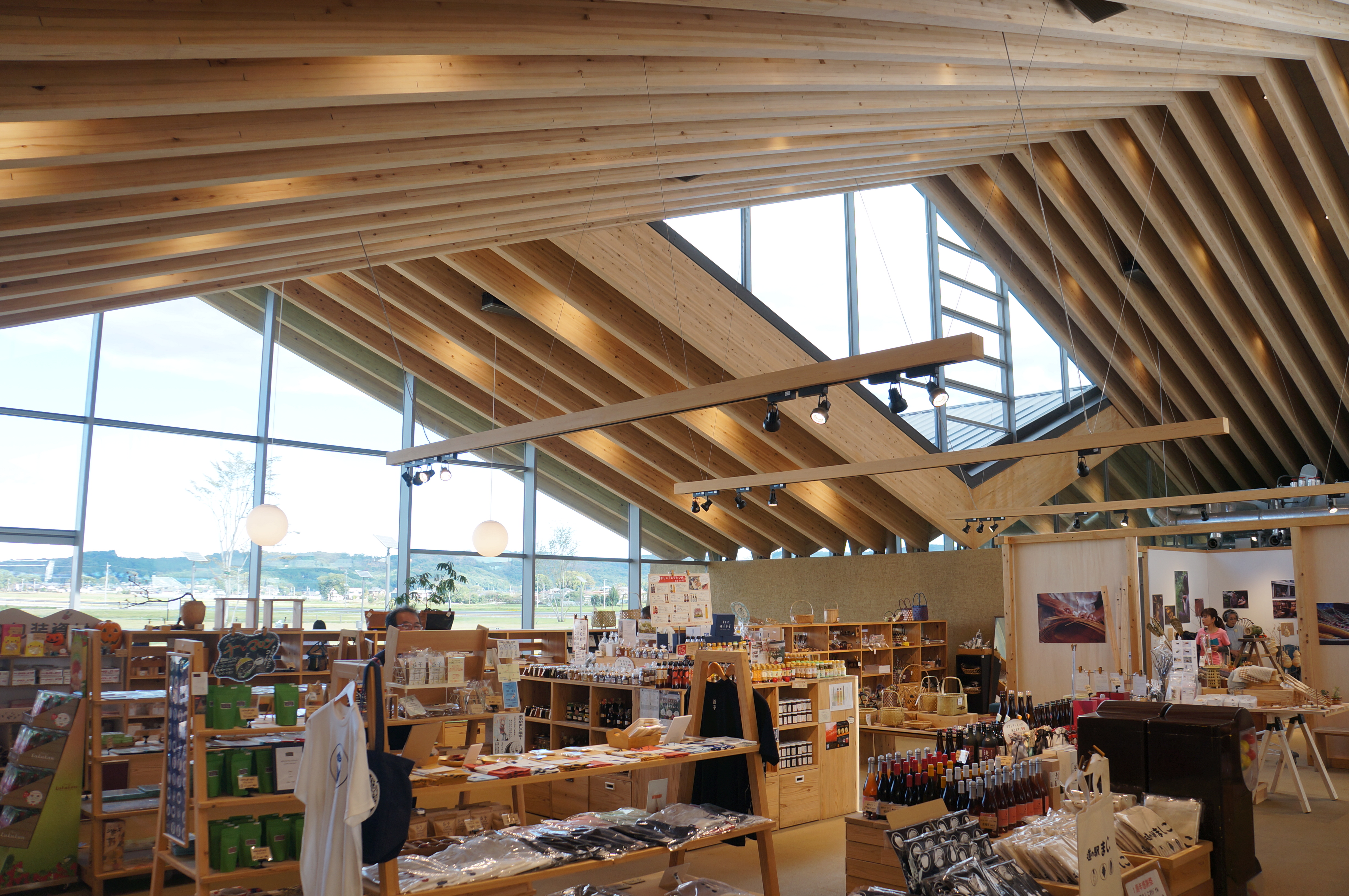The land was surrounded by vast rural landscapes and farms. As a local public relations facility, the roadside station had to be able to clearly express its local appeal to outsiders, and at the same time, it had to function as a local landmark to locals. We designed the building inspired by the shapes and materials found in the landscape to establish locality. The design was adjusted and understood through the roof structure covering the entire space. The doma(the floor of the soil) and the walls are connected by soil, and the roof lines originate from the surrounding mountains. The material that enabled a large roof structure reaching 32m was also local wood called Yamijo cedar, which went through the process of a local lamination wood material factory. The interior was defined by the rhythm of the mountain and the wooden structure in line with the supporting wall to properly divide the space. It is precisely what we sought to pursue to design buildings from local landscapes to create a single landscape.