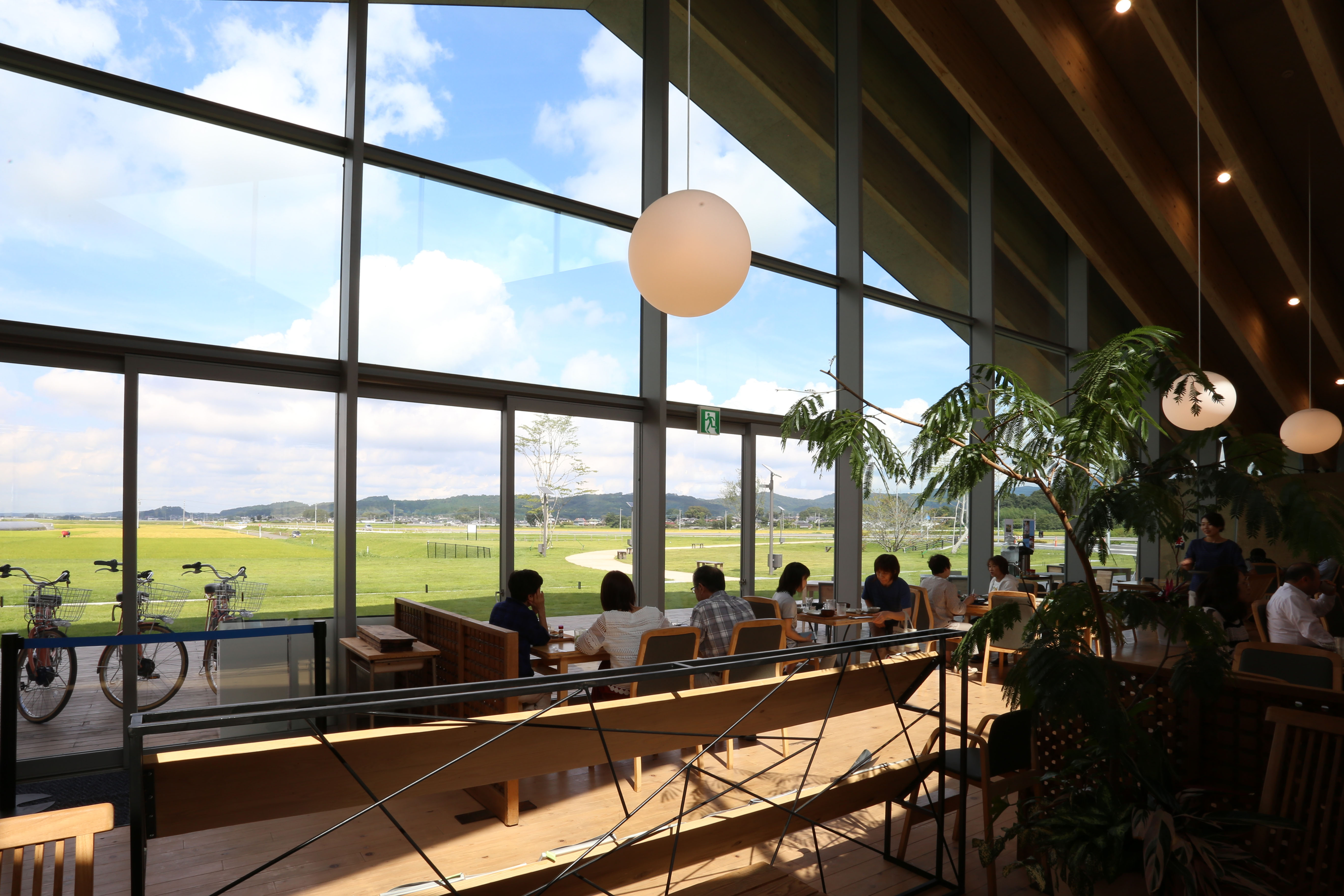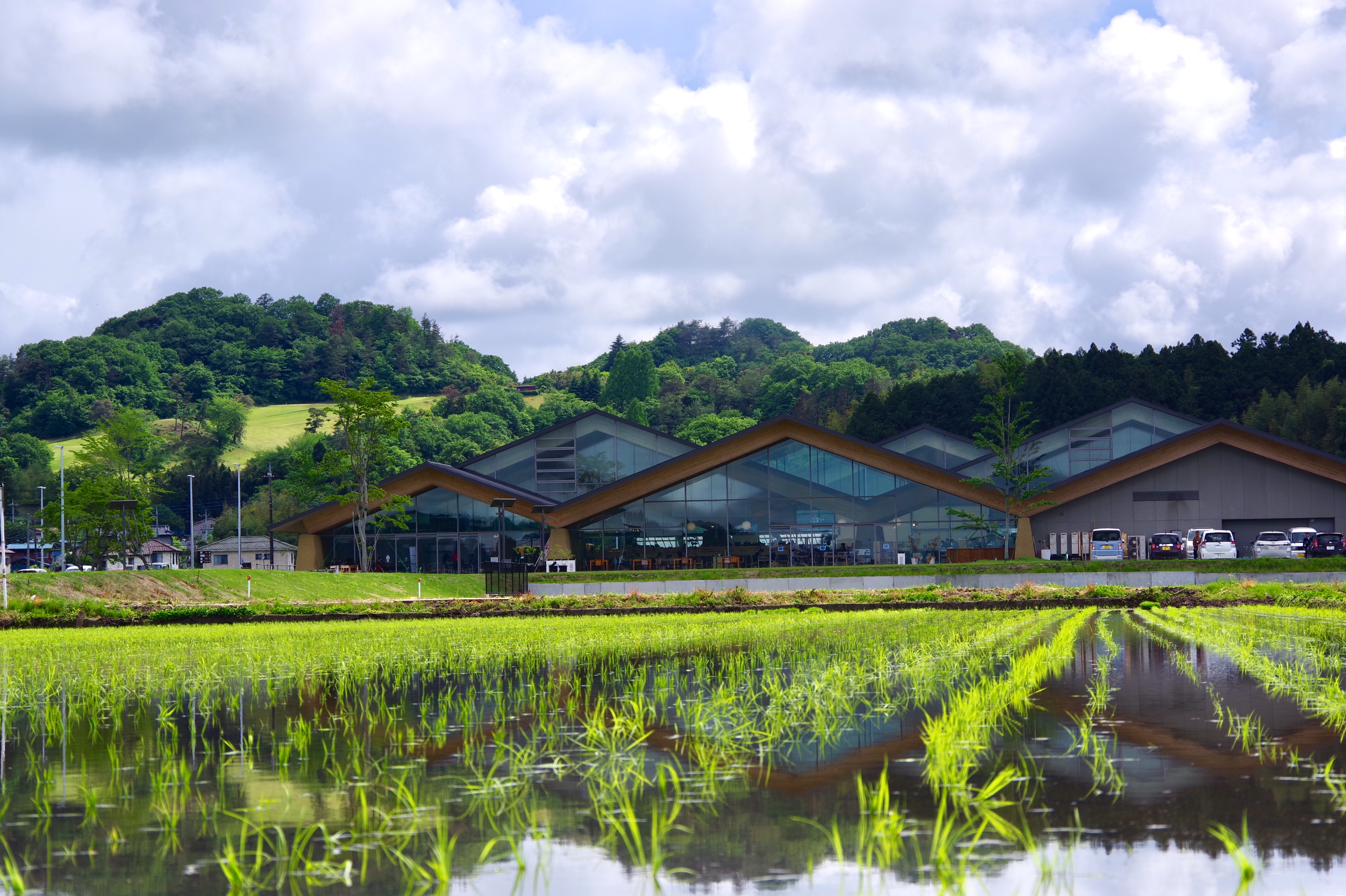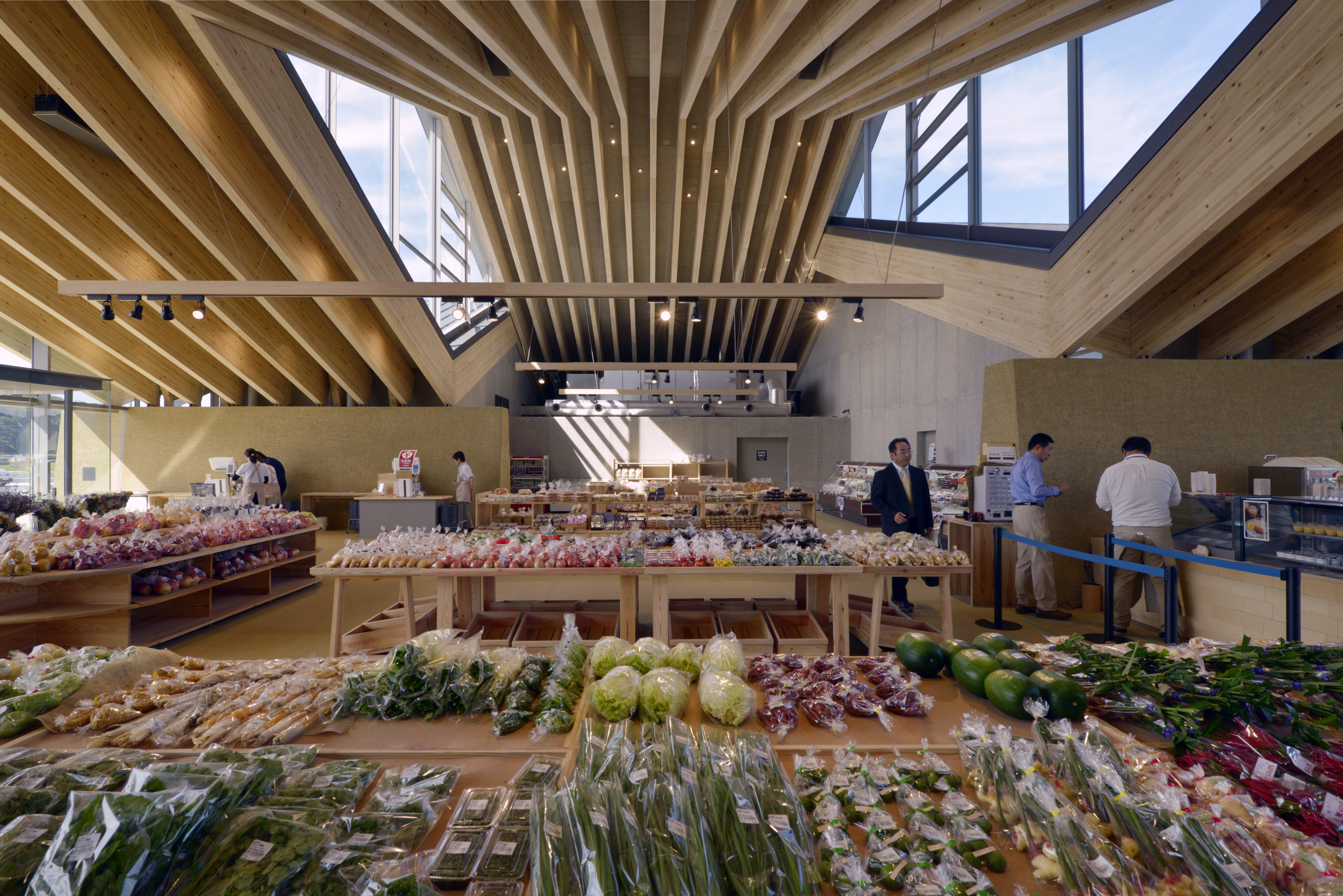 The land was surrounded by vast rural landscapes and farms. As a local public relations facility, the roadside station had to be able to clearly express its local appeal to outsiders, and at the same time, it had to function as a local landmark to locals. We designed the building inspired by the shapes and materials found in the landscape to establish locality. The design was adjusted and understood through the roof structure covering the entire space. The doma(the floor of the soil) and the walls are connected by soil, and the roof lines originate from the surrounding mountains. The material that enabled a large roof structure reaching 32m was also local wood called Yamijo cedar, which went through the process of a local lamination wood material factory. The interior was defined by the rhythm of the mountain and the wooden structure in line with the supporting wall to properly divide the space. It is precisely what we sought to pursue to design buildings from local landscapes to create a single landscape.