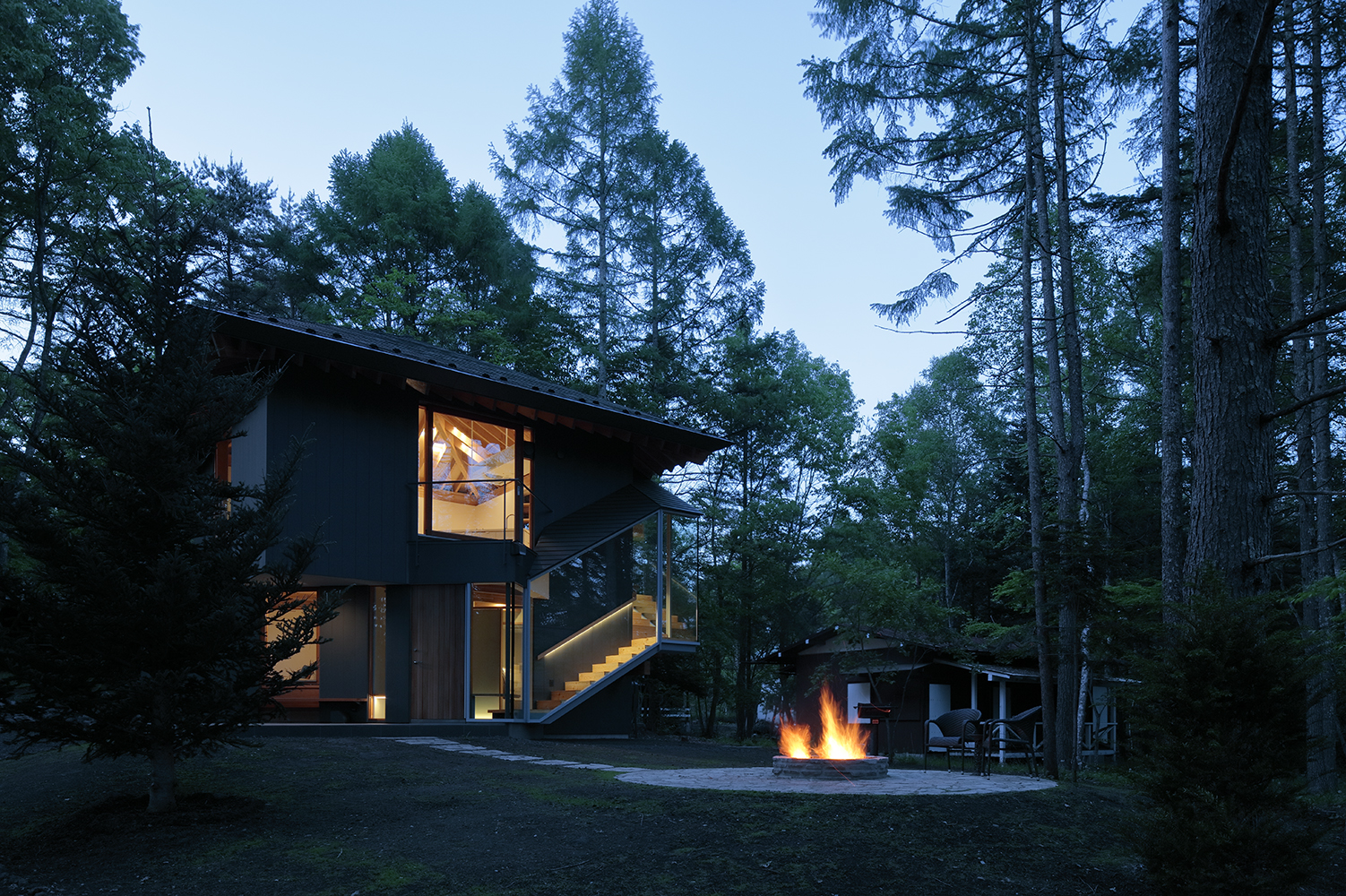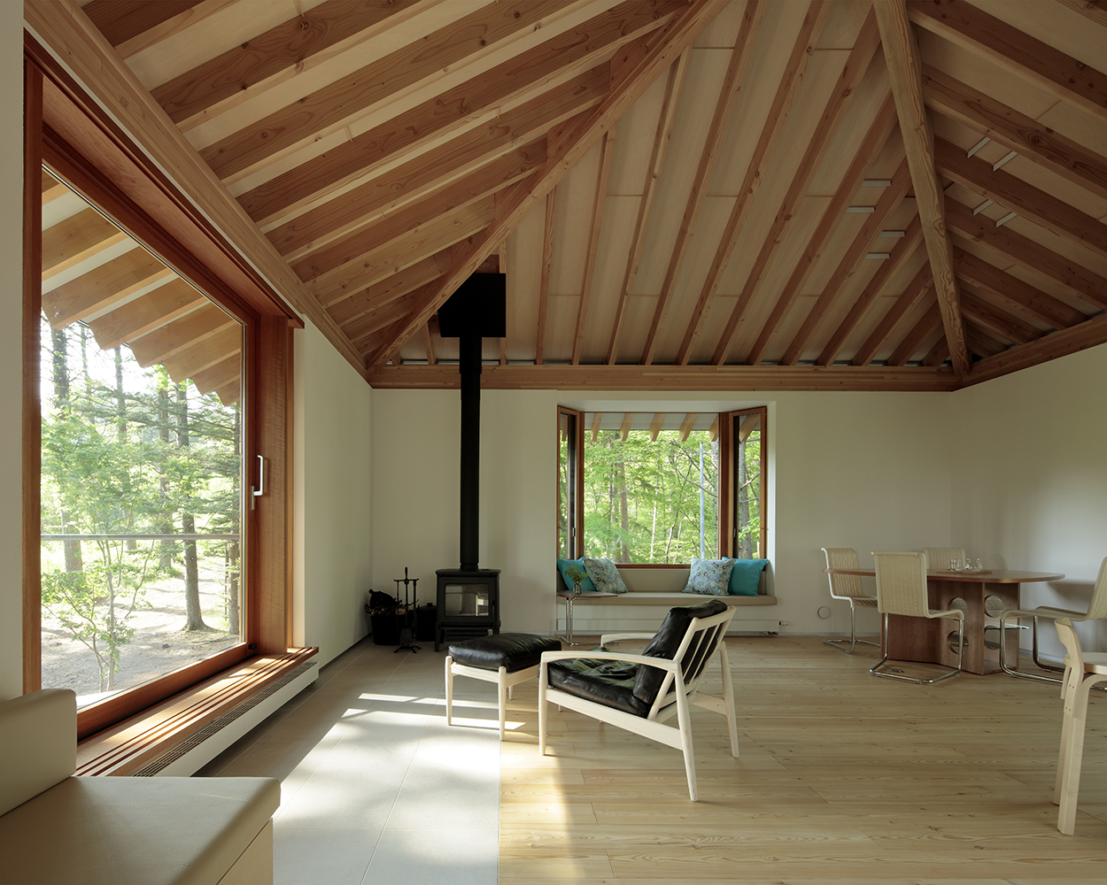 The small two-story villa is located on the site of an old villa at the foot of Mount Asama. A plane of 6.2㎡ rotates at an angle of 45 degrees between the first and second floors. On the first floor, you can enjoy the green scenery of nature through the space between the neighboring houses. Mount Asama appears on the second floor, beyond neighboring houses, behind a nearby national park forest. The second floor is a studio with huge windows symmetrically arranged in the center of each wall. Each corner is arranged differently, providing a space for cooking and eating and relaxing in front of the fireplace. In addition, you can sit on the frame of the bay window with a small triangular balcony, and you can enjoy nature closer by using the door frame as a small table. An oven was built in the garden for barbecue, which provides a place for families to gather outdoors.