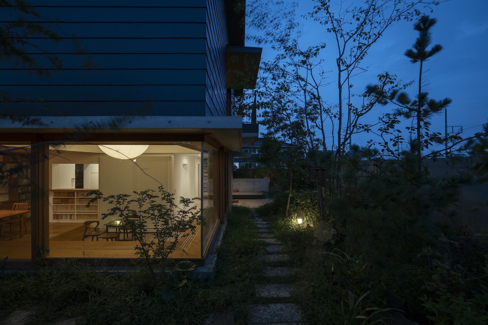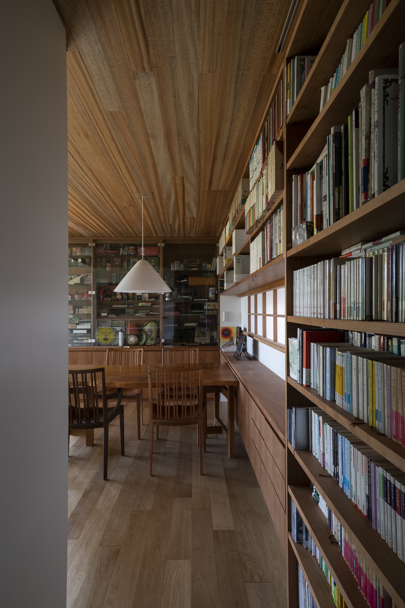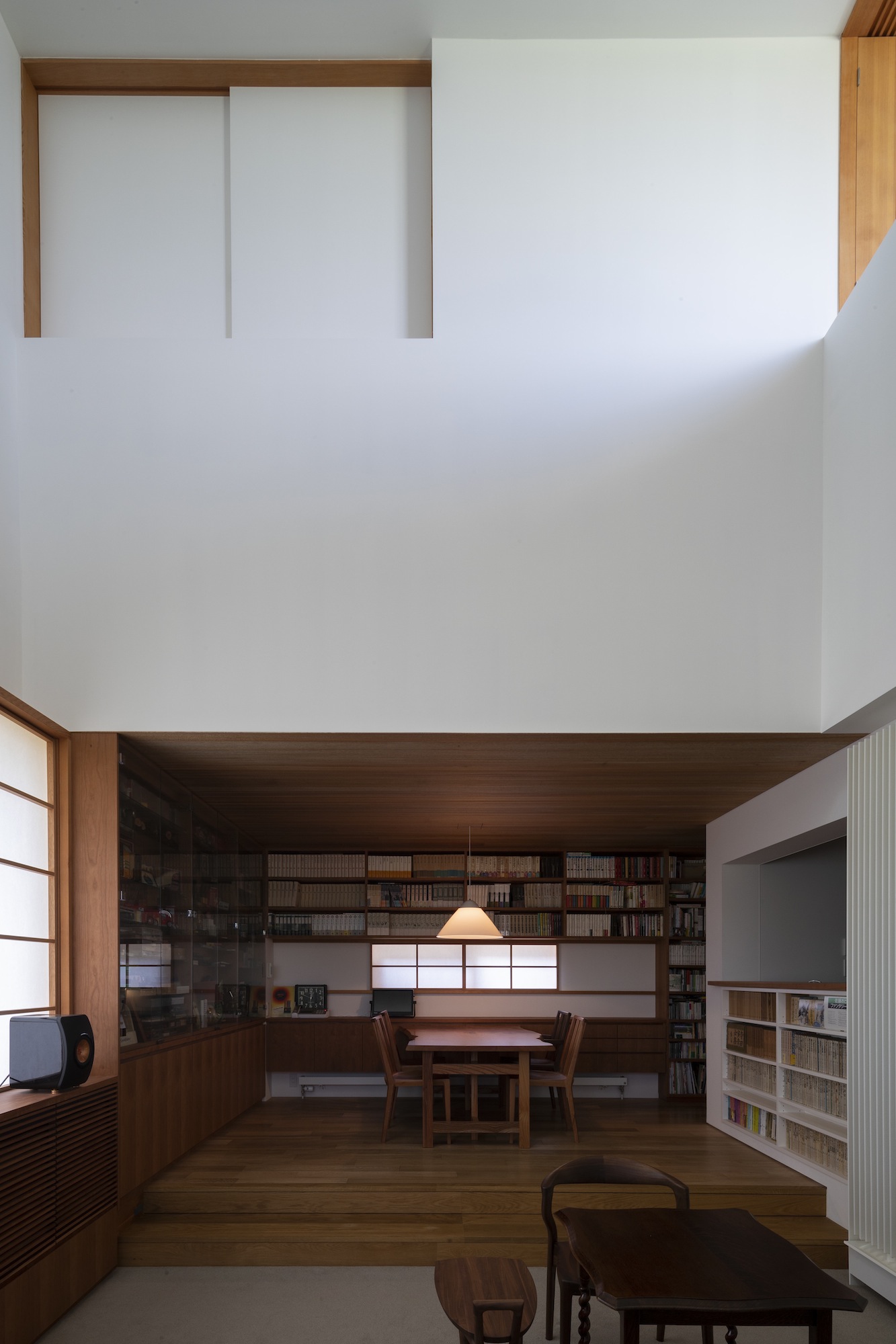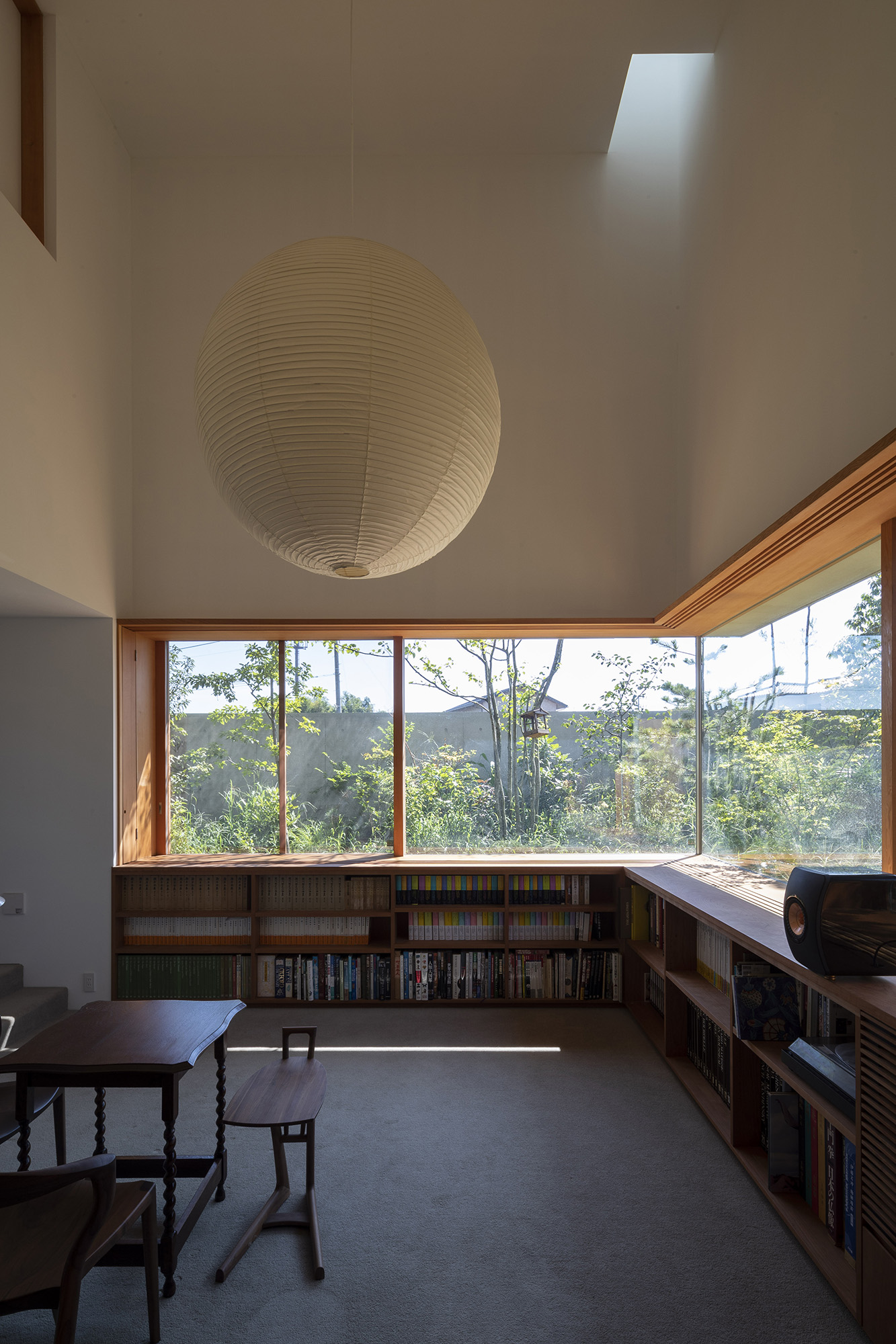 The owner wanted a house that could hold many of their books and observe wild birds in the garden, which reminded him of the image of a "forest library." This meant that when designed, large windows were needed in the living room and drawing room so that residents could observe nature from within through long, narrow gardens made for birds. However, since the land is located in a residential area, a large window without considering privacy will not create a comfortable atmosphere. Accordingly, the location of the window was lowered by partially allowing the building to be buried on the ground, and the area around the ground was surrounded with low walls to ensure both good view and privacy. The kitchen and storage space are designed to be concentrated in the center. The living room, the drawing room, and the study are arranged around it, and a corridor lined with bookshelves is connected to create a circular movement and provide enough space for book storage with an open feeling.
