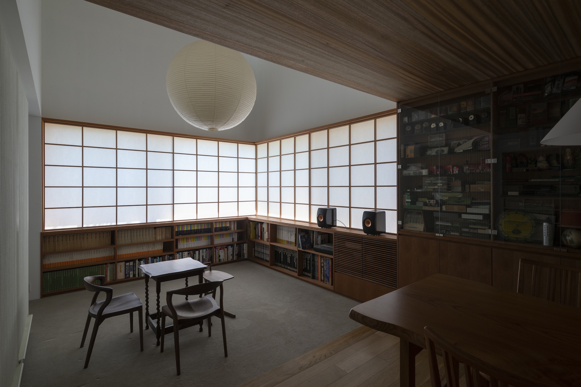 The owner wanted a house that could hold many of their books and observe wild birds in the garden, which reminded him of the image of a "forest library." This meant that when designed, large windows were needed in the living room and drawing room so that residents could observe nature from within through long, narrow gardens made for birds. However, since the land is located in a residential area, a large window without considering privacy will not create a comfortable atmosphere. Accordingly, the location of the window was lowered by partially allowing the building to be buried on the ground, and the area around the ground was surrounded with low walls to ensure both good view and privacy. The kitchen and storage space are designed to be concentrated in the center. The living room, the drawing room, and the study are arranged around it, and a corridor lined with bookshelves is connected to create a circular movement and provide enough space for book storage with an open feeling.