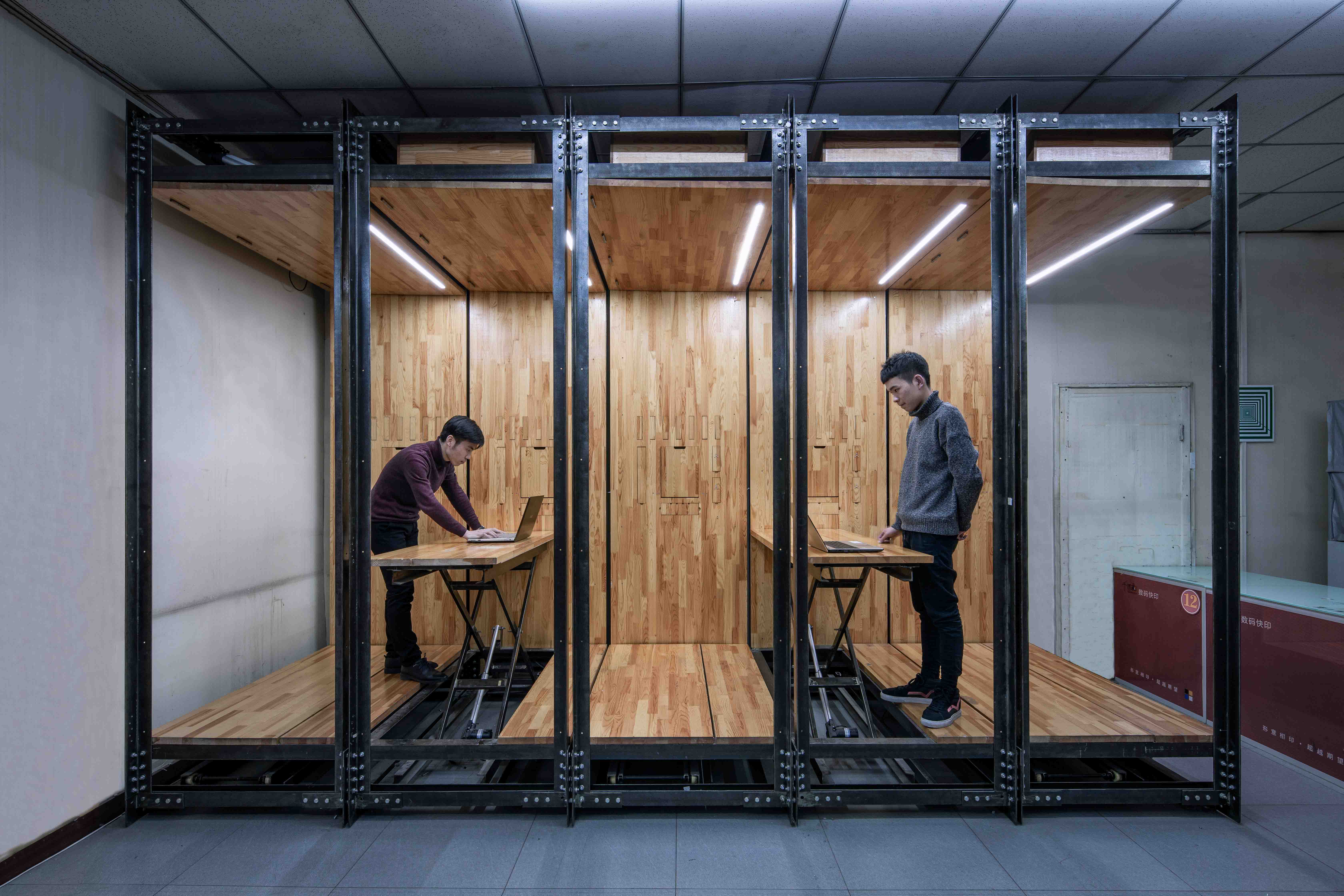 대지 조건을 고려해 LUO 스튜디오는 대지 한쪽에 새 사무실을 만들기로 했다. ‘인쇄 + 디자인’ 서비스업은 고객과 그래픽 디자이너 사이의 일대일 소통이 필수이기에 계획했다. 두 사람이 함께 앉아 대화를 나눌 수 있는 가장 작은 워크스테이션이 초소형 사무실은 길이와 폭, 넓이가 각각 1.53m, 0.9m, 1.377㎡인 소형 모듈 여러 개로 구성되어 있다. 각 모듈은 의자, 책상, 수납장, 전등, 콘센트 등 업무를 위한 기본적인 지원 요소를 포함하고 있고, 이들은 상부와 하부, 측면에 적당한 높이로 설치되어 있어 인체공학적 필요를 충족한다. 9.639m2라고 하면 일반적인 침실 면적보다 작은 셈이다. 하지만 업무, 회의, 소통, 전시, 이동, 조명, 수납 등과 관련된 요구를 충족하는 사무실은 초소형 건축물로 볼 수도 있고, 거대한 가구나 커다란 전자기기로도 볼 수 있다. 그러나 LUO 스튜디오의 관점에서 이곳은 도시 문제에 초점을 맞춘 공간적 실험과 탐구의 산물이다.