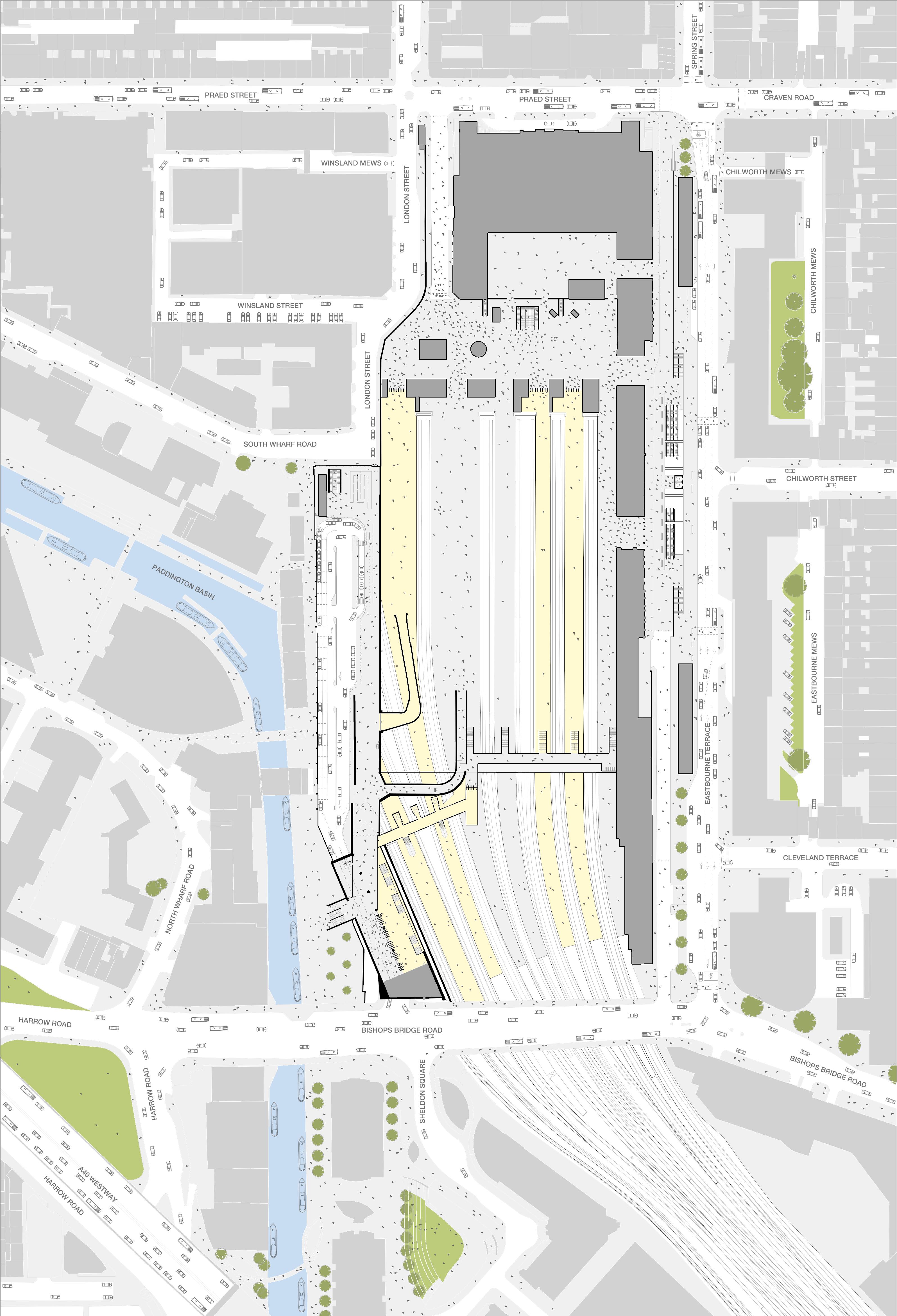 Weston Williamson + Partners’ Elizabeth Line station at Paddington is the culmination of over ten years’ work by the practice at the station, transforming the passenger experience by radically improving routes to and through the station, and opening up new connections. It occupies the site of the station’s former taxi rank, which was a gloomy, fume-filled canyon – difficult to access, and an unattractive and unfriendly start to travellers’ journeys in London. In 2012 Weston Williamson + Partners used the future arrival of the Elizabeth Line as a catalyst for moving taxis to the north of the station alongside a new underground station, thereby opening up new connections with the revitalised Regent’s Canal basin, and improving pedestrian and traffic flow to and through the station.