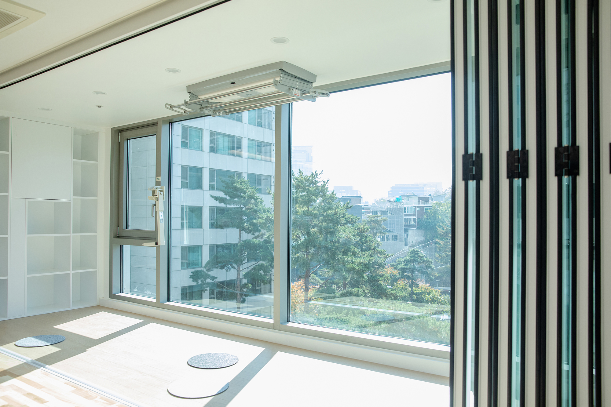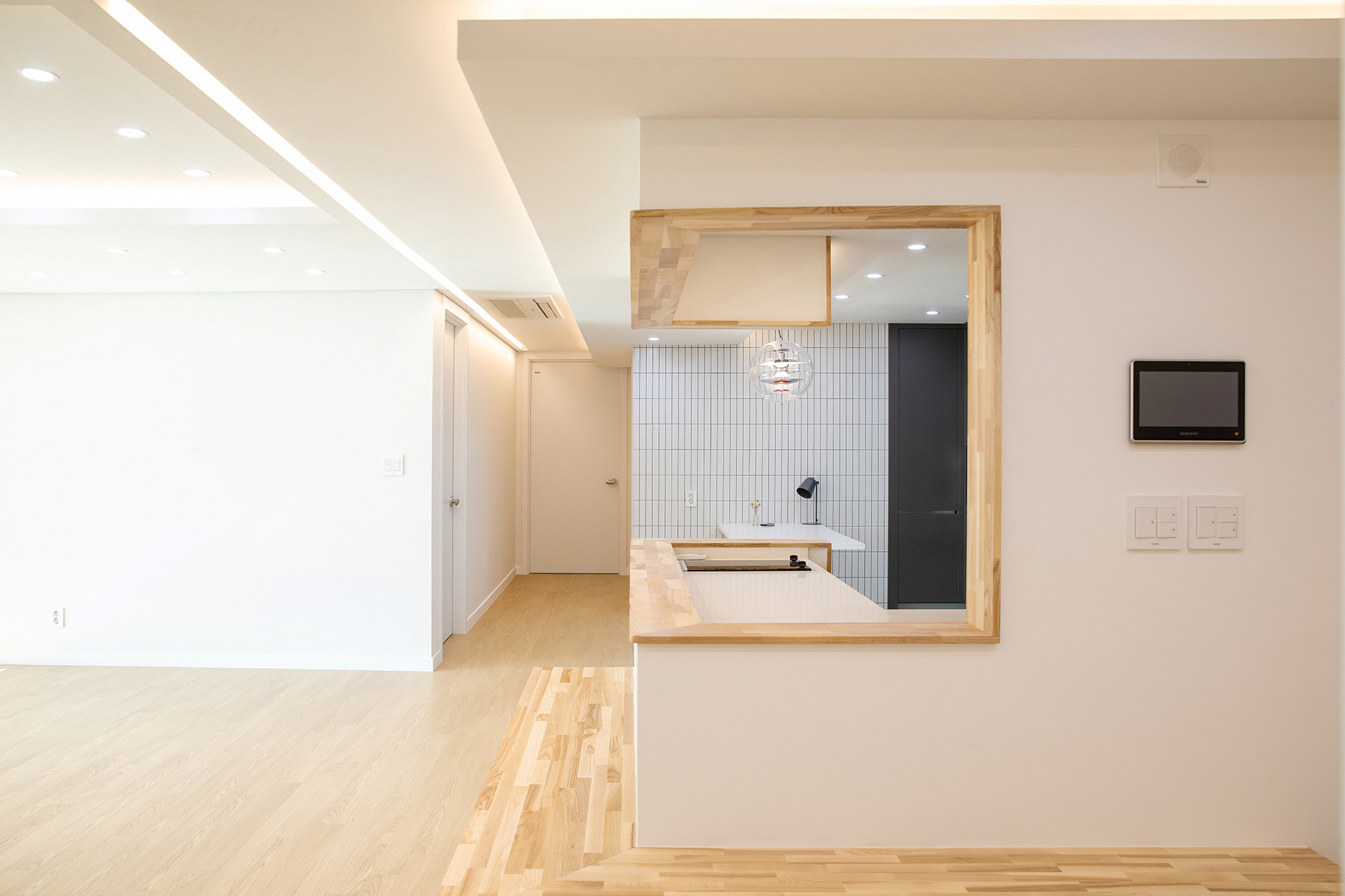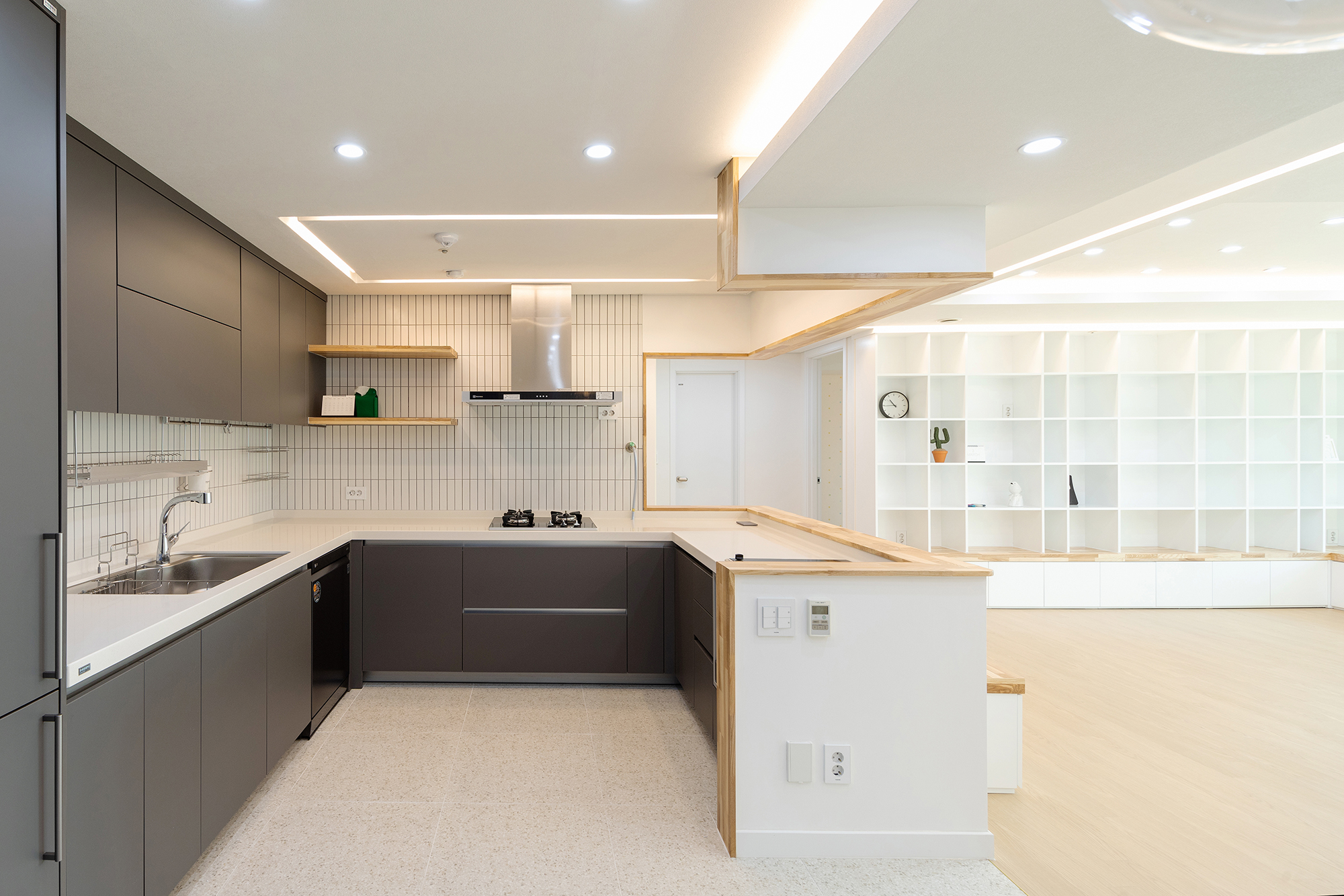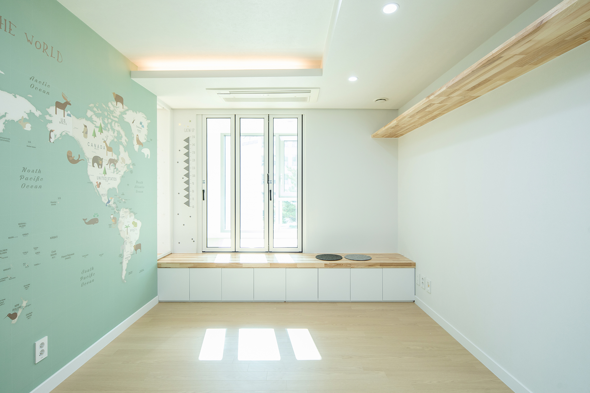 햇살이 하루 종일 따뜻하게 들어오는 남쪽의 창이 있지만 창가 공간은 베란다로 창고의 역할을 하고 있었다. 짐을 쌓아두던 공간에서 아이들이 햇살이 가득한 공간에서 놀 수 있는 평상이 있는 공간으로 변했다. 가족의 중심공간이 소파와 텔레비전이 아닌, 책과 평상이 있는 따뜻한 공간이 되길 바란다. 그 곳에서는 아파트의 일반적인 일상이 아닌 조금 더 많은 대화와 다양한 아이들의 놀이가 가능한 풍부한 일상이 되길 바란다. 넓은 평상 같은 공간의 하부는 수납장으로 사용할 수 있다. 거실의 tv를 없애고 만든 책장과 자연스럽게 연결되어 아이들의 놀이 평상임과 동시에 거실의 확장이다. 이 거실의 한 벽면 전체는 화이트 톤의 책장이 있다.