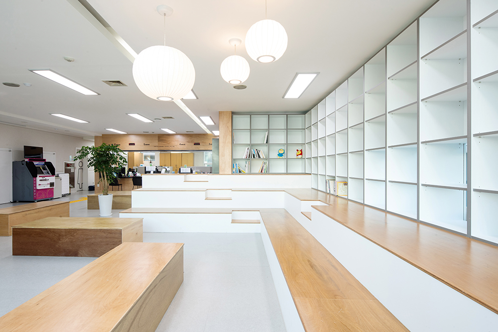 The public service office located on the second floor has many public spaces such as a hallway and elevator hall, which have been integrated with the public service office to expand the space. Public deck was created on this integrated space. Public Deck served as the resting place where residents can talk together while waiting for public service at the bookshelves, window desk and stair bench. The administrative office space and the public service office, which had been separated into the second and third floors, were placed in one space to enhance efficiency of the work.