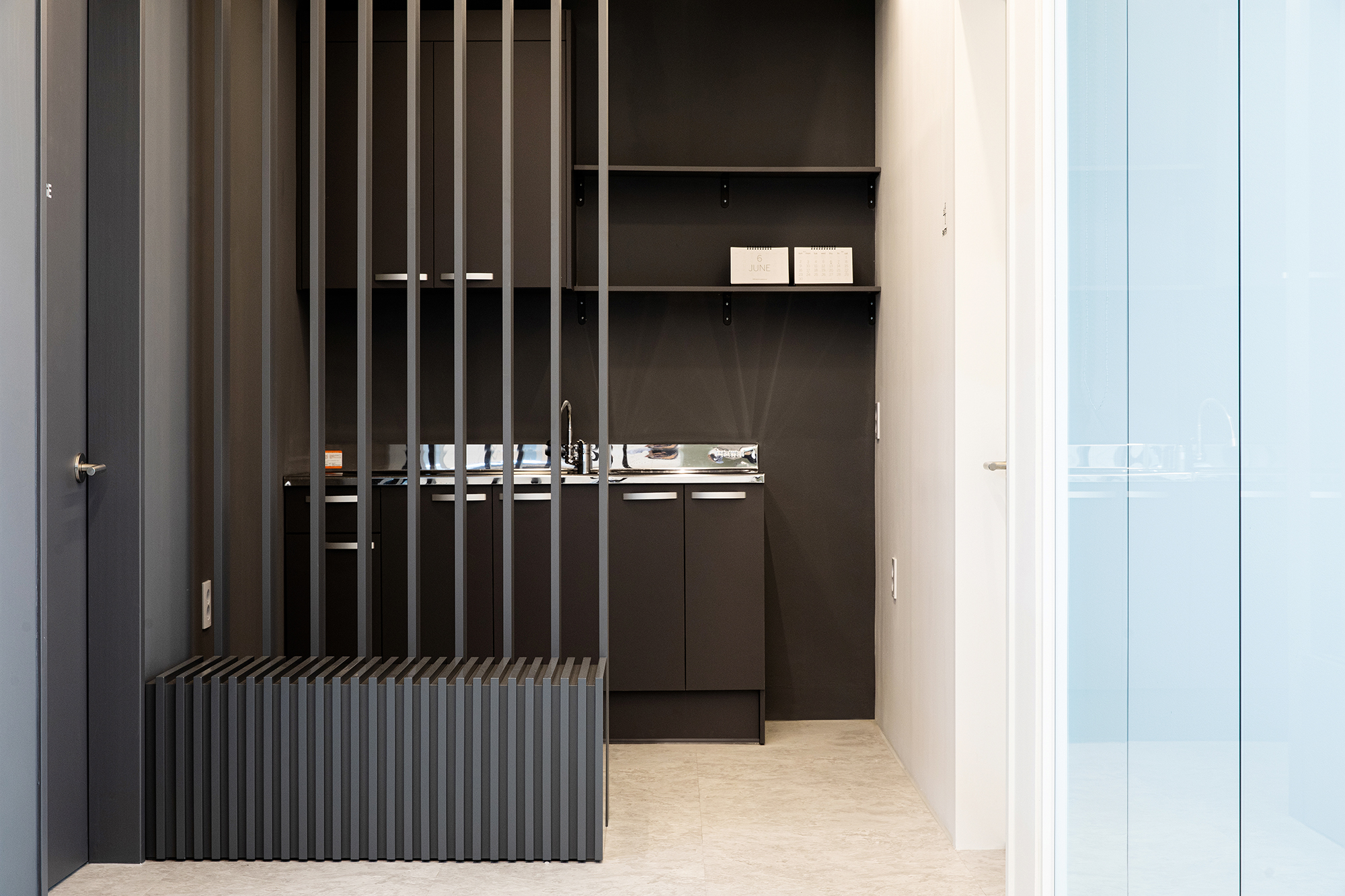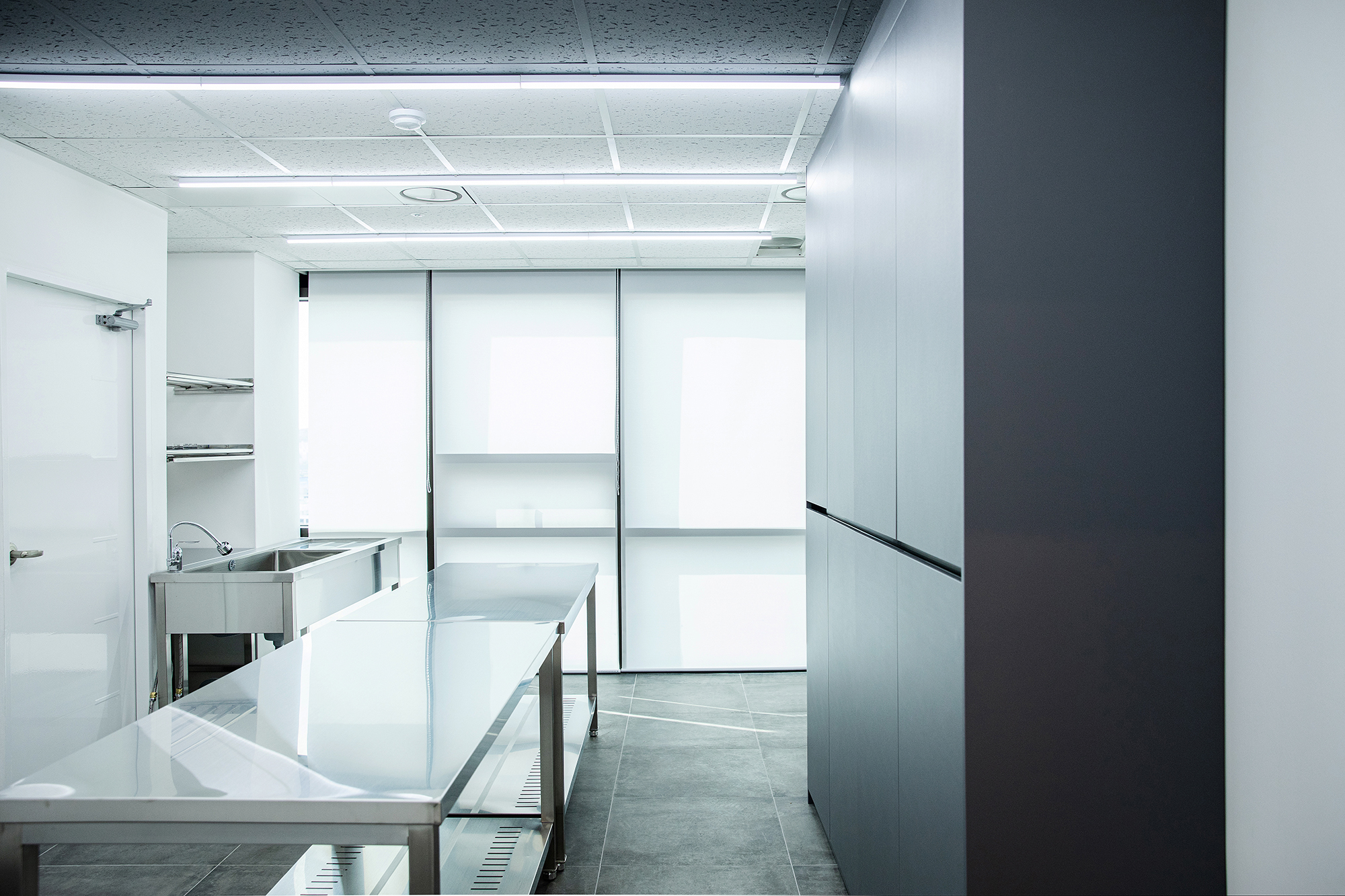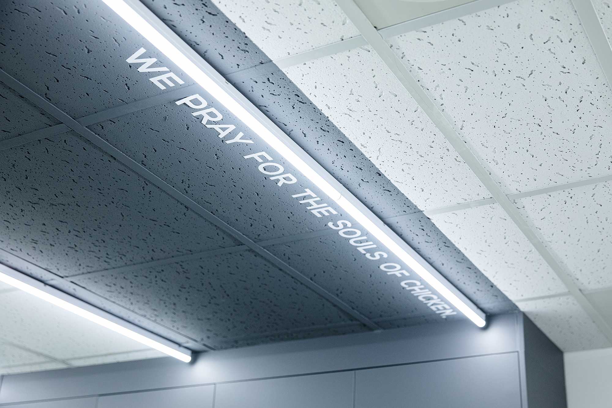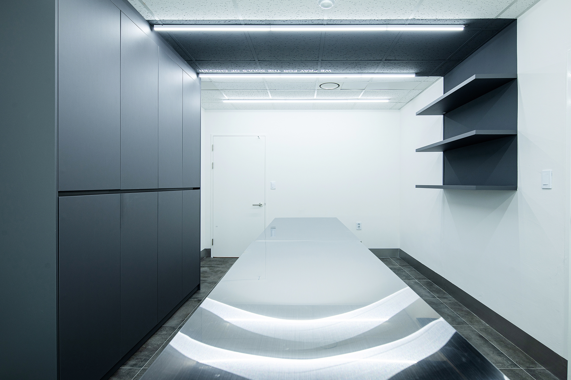치킨을 튀기고, 튀기고, 또 튀기고. 기름이 가득한 튀김기가 있는 튀김실과 주방을 분리하고 주방에는 가운데 길고 넓은 작업대를 배치했다. 넓은 공간이 필요하지는 않았지만, 하루종일 서서 일하는 이 곳에서의 짧고 밀집된 동선은 중요했다. 테스트한 제품을 여러 직원들과 함께 품평할 회의실과 직접 연결했다. 이 곳에서 테스트 되는 수많은 닭들의 영혼을 위로하며.