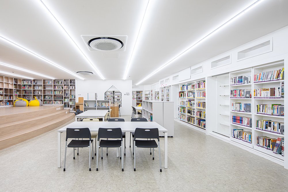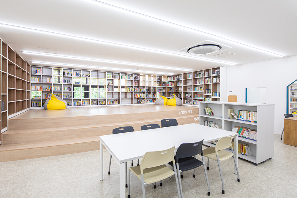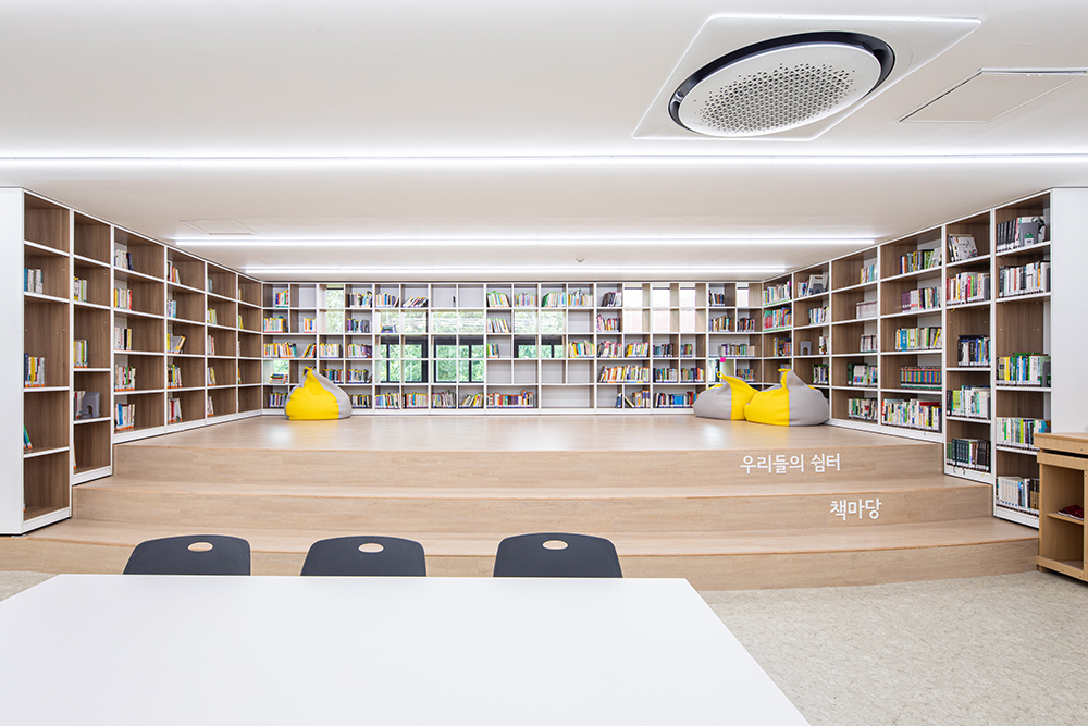 창을 가리고 있던 책장을 책수납을 위해 없애기는 어려웠지만, 책장 중간 중간에 채광과 조망이 가능하고 책장 뒤에 가려져 있는 창을 열고 닫을 수 있는 위치의 책장 부분을 오픈했다. 책장으로 어둡고 환기가 안 되는 도서관에 빛이 들어오고, 바람이 드나들었다. 동시에 책 수납 또한 가능한 The Lighting Bookshelves를 만들었다. 그 앞쪽 공간에는 아이들이 책을 보거나 쉴 수 있는 계단형 쉼터인 책마당을 배치했다.