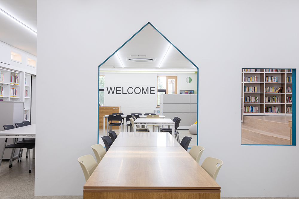 도서관의 전면 공간은 아이들이 쉬면서 책을 볼 수 있는 책마당이 있고, 가운데 공간은 6인용 책상들이 있다. 도서관 본연의 기능인 조용히 독서할 수 있는 공간 또한 필요했다. 작은 규모의 도서관이어서 실을 구획하기보다 오픈형 가벽을 설치해 시각적인 독립성을 확보하여 나를 찾는 독서 공간으로 구획하였다. 또한 그 뒤편에는 창가에 책상을 배치해 창밖을 바라보며 조용히 공부할 수 있는 공간을 마련하였다. 전체적으로 충분한 책의 수납을 기본으로 기존에 부족했던 자연 채광, 환기를 The Lighting Bookshelves를 통해 개선해 학생들이 딱딱한 학교에서 편안히 쉬었다 갈 수 있는 도서관이 되길 바란다.