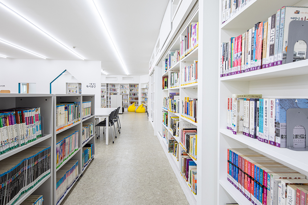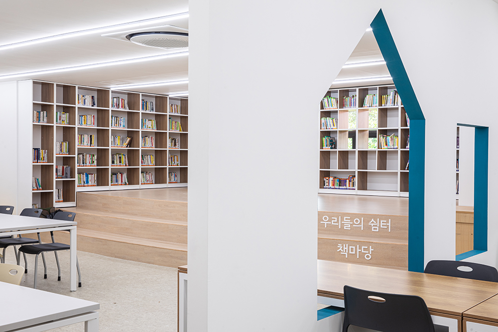 창을 가리고 있던 책장을 책수납을 위해 없애기는 어려웠지만, 책장 중간 중간에 채광과 조망이 가능하고 책장 뒤에 가려져 있는 창을 열고 닫을 수 있는 위치의 책장 부분을 오픈했다. 책장으로 어둡고 환기가 안 되는 도서관에 빛이 들어오고, 바람이 드나들었다. 동시에 책 수납 또한 가능한 The Lighting Bookshelves를 만들었다. 그 앞쪽 공간에는 아이들이 책을 보거나 쉴 수 있는 계단형 쉼터인 책마당을 배치했다.
