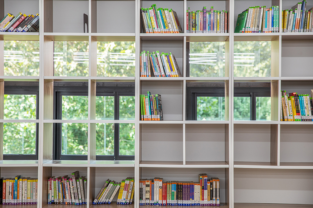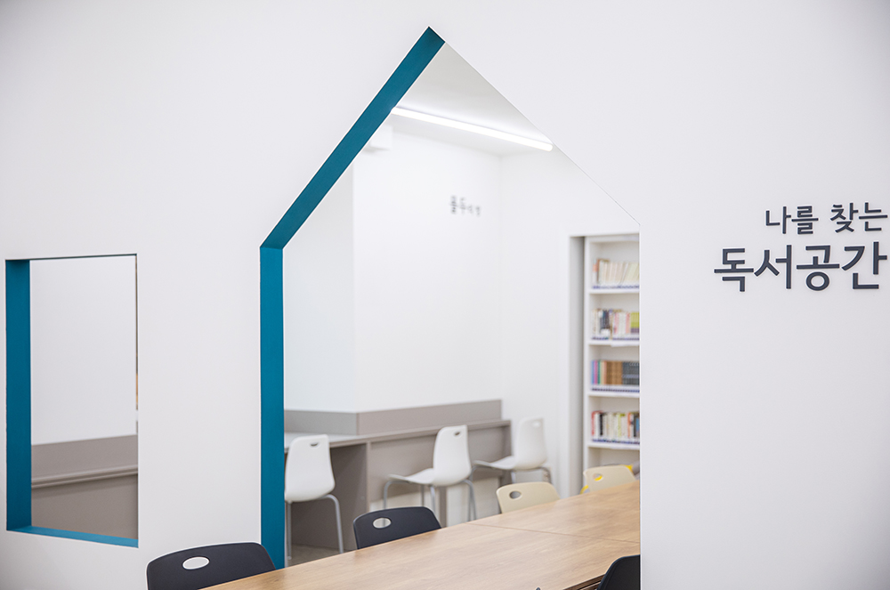 도서관의 전면 공간은 아이들이 쉬면서 책을 볼 수 있는 책마당이 있고, 가운데 공간은 6인용 책상들이 있다. 도서관 본연의 기능인 조용히 독서할 수 있는 공간 또한 필요했다. 작은 규모의 도서관이어서 실을 구획하기보다 오픈형 가벽을 설치해 시각적인 독립성을 확보하여 나를 찾는 독서 공간으로 구획하였다. 또한 그 뒤편에는 창가에 책상을 배치해 창밖을 바라보며 조용히 공부할 수 있는 공간을 마련하였다. 전체적으로 충분한 책의 수납을 기본으로 기존에 부족했던 자연 채광, 환기를 The Lighting Bookshelves를 통해 개선해 학생들이 딱딱한 학교에서 편안히 쉬었다 갈 수 있는 도서관이 되길 바란다.
