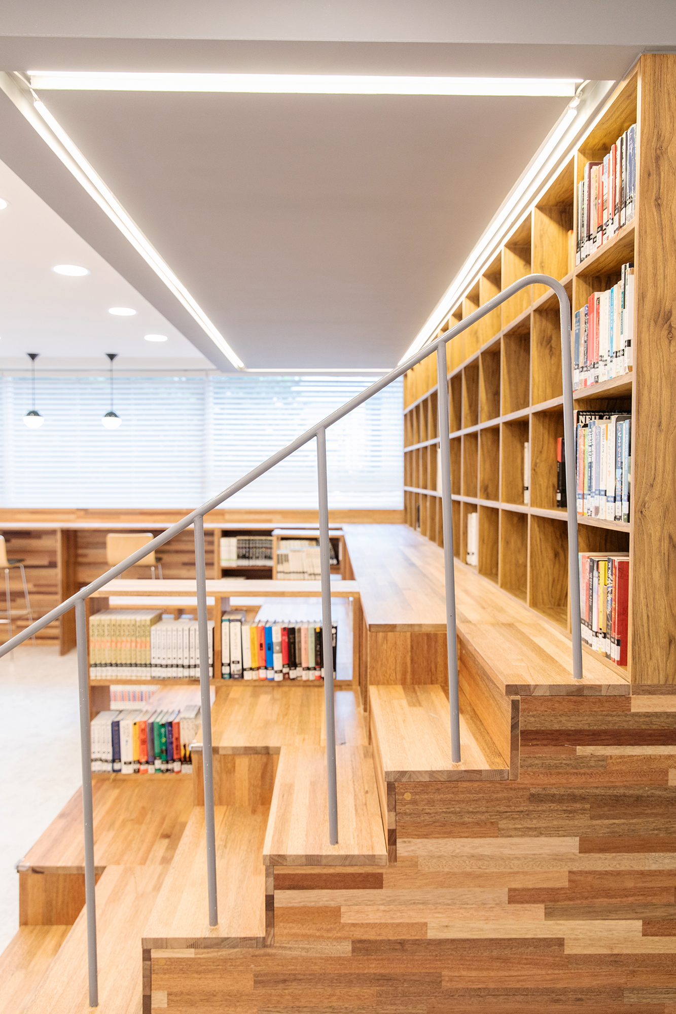 The existing small library in Suseo-dong was a place densely packed with books stacked on top of each other. It was a space where books were usually checked out. I believe that a neighborhood library should be a community space where people can read books, meet neighbors organically, and have conversations about books, rather than a quiet, focused space like a study hall. In addition to the existing purpose of book lending, we wanted it to be a space where people can enjoy books and meet people. It was a matter of changing the ownership of the space, from a space for books to a space for residents to enjoy books together. To this end, the corridor connecting the elevator to the workspace and the stairwell to the small library, which previously occupied a large area, was integrated with the small library to expand the library space. The library was planned as an open library without wall compartments or corridors. In order to accommodate the existing volume of books, we arranged the space in a way that allows visitors to interact with books and people in different ways; desks facing the window to sit alone, circular benches where people can sit in groups, and stepped benches for people to sit and read or select books. A pattern of oblique lines was designed on the floor to indicate the circulation of the former corridor. The wood and gray tones used overall create a calm and warm atmosphere, and the bench in the center is accented with a green color and lighting to serve as a central space. I hope for the public service space of the community center to be more than a place where you issue a certificate, and the library will not just be a place where you borrow books and leave, but a nearby space where residents who want to stay for a while can enjoy at least a minimum of cultural life.