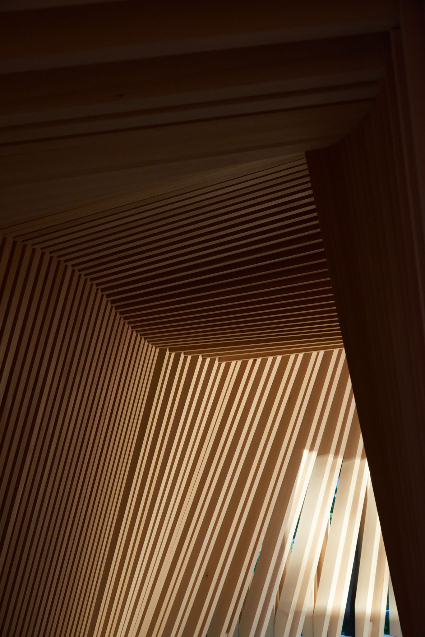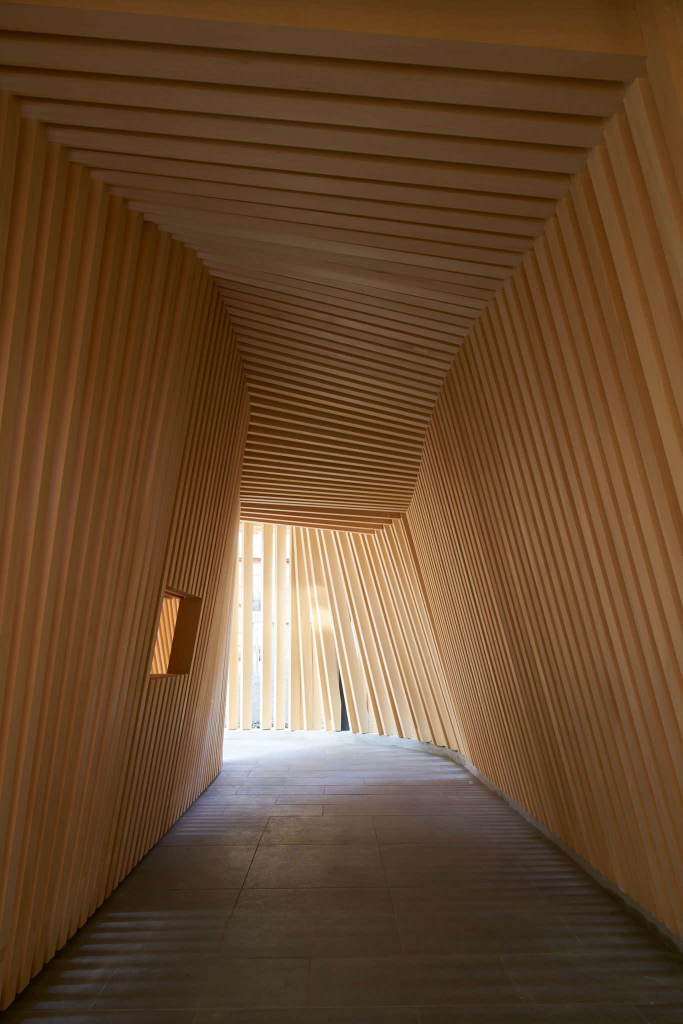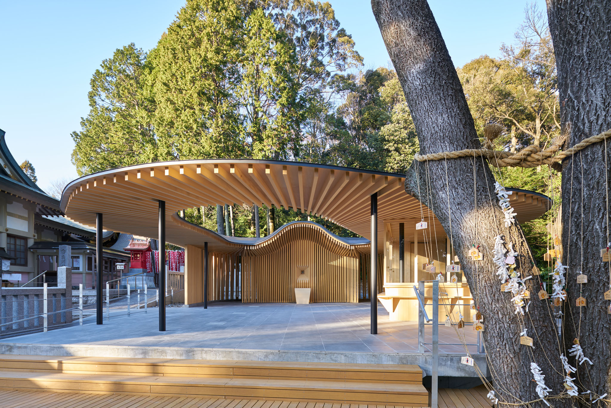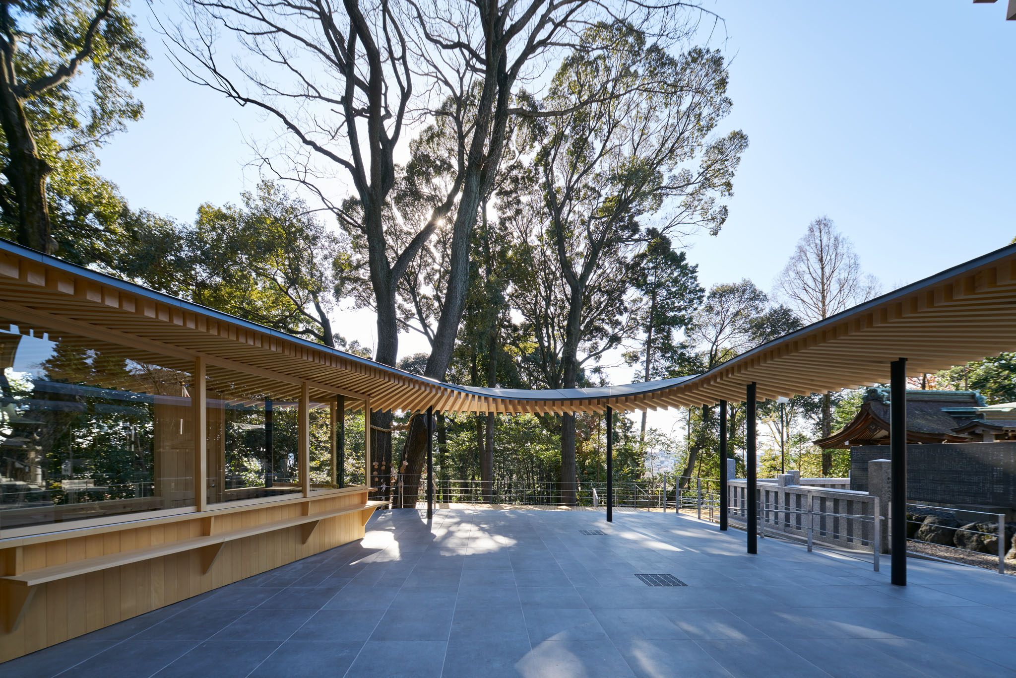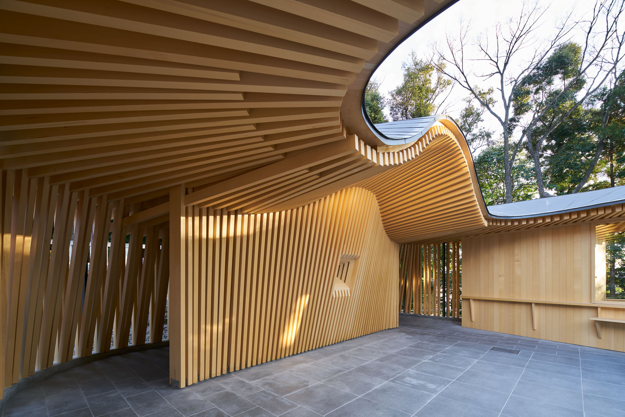 Hakusangū Shrine is located next to a small mountain shrine to the god Ashinazuchi of Legs. When designing this place, called Ashiosha, where the god of Legs is enshrined, the designer chose to create an open and free space allowing visitors to follow a curving path rather than forcing them to follow a fixed linear path, even though the shrine's foundation is oriented toward the north and south. The shrine was built by intertwining thin trees and it beckons visitors through the wind blowing between the trees dappled with sunlight. Visitors will feel a sense of unity with the shrine by walking through the "Hora no Sandō," (approach to the cave) filled with softly curved trees behind the shapes of light and the god, and by stroking the "Itamitorishi," a stone that heals pain originally located within the shrine. This shrine allows visitors to feel a sense of oneness with the god and to take one step closer to the divine. It embodies how visitors can relate to the god.