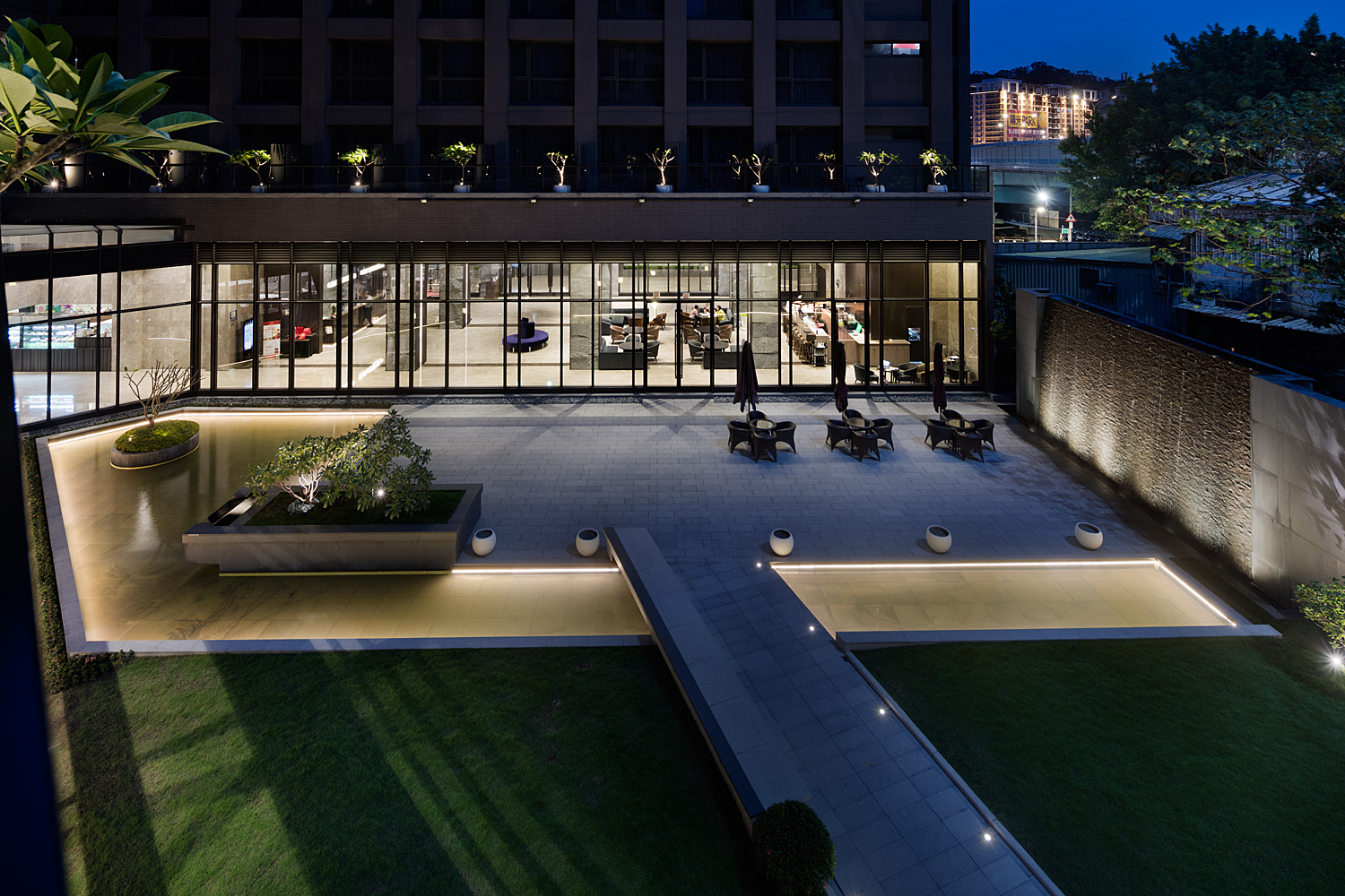This project was planned as a courtyard for a hotel located near a park and an eco-zone. The space is mainly used for weddings and serves as a cafe on other days. With this in mind, the designer focused on creating a lighting concept suitable for weddings. First, a row of lights was placed on each side of the hallway that crosses the swimming pool, combining the lighting design of an airport runway with the space. This creates a sense of layered areas between the "water" and "land" sections. During the day, the place is a modern garden with minimal design, and at night, the "land" area appears as a romantic tropical island. The main space for events is the courtyard located near the hotel lobby, specifically designed for hosting weddings. As a result, this project has become a place that provides enough light for activities even at night without losing the focus on the overall concept.