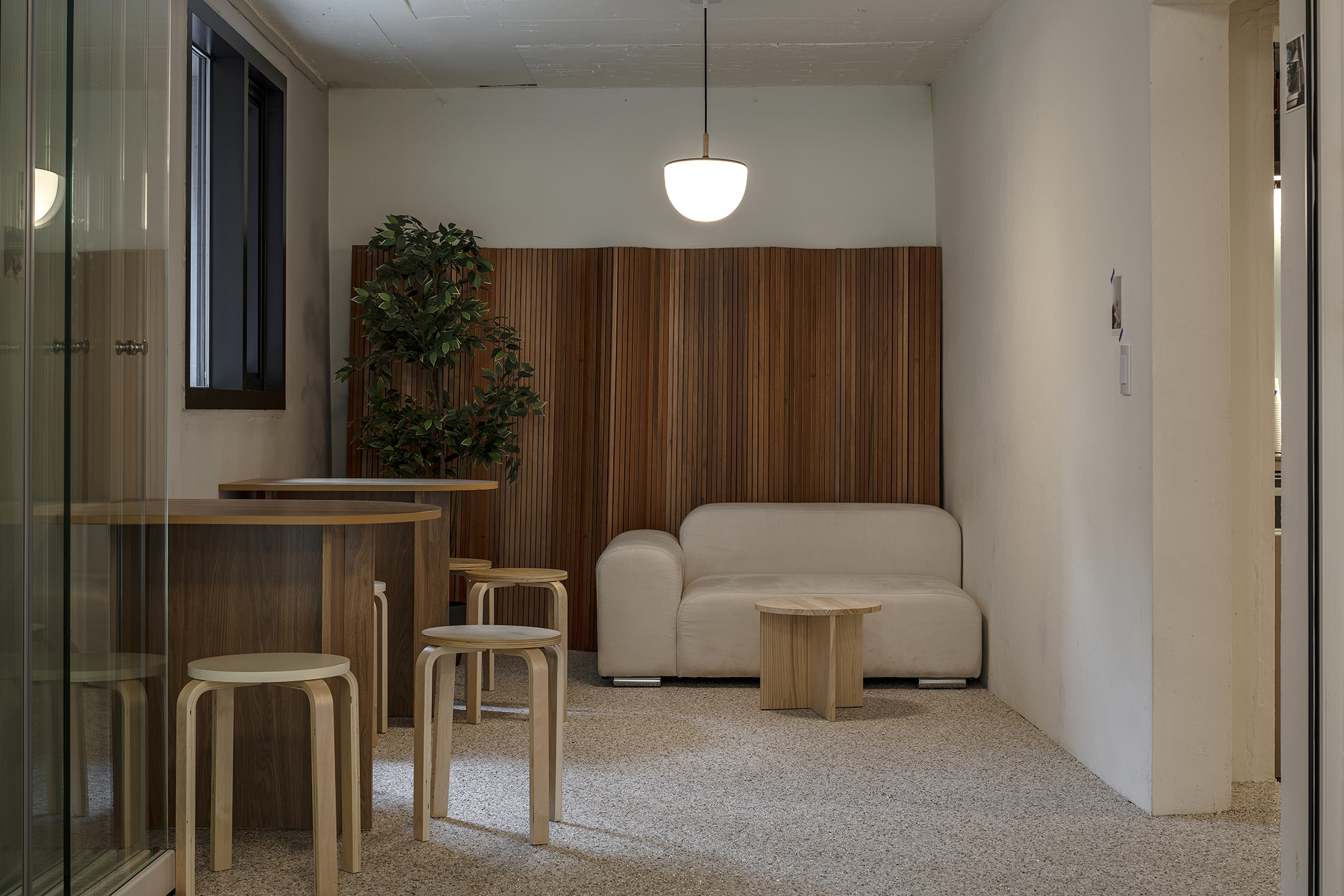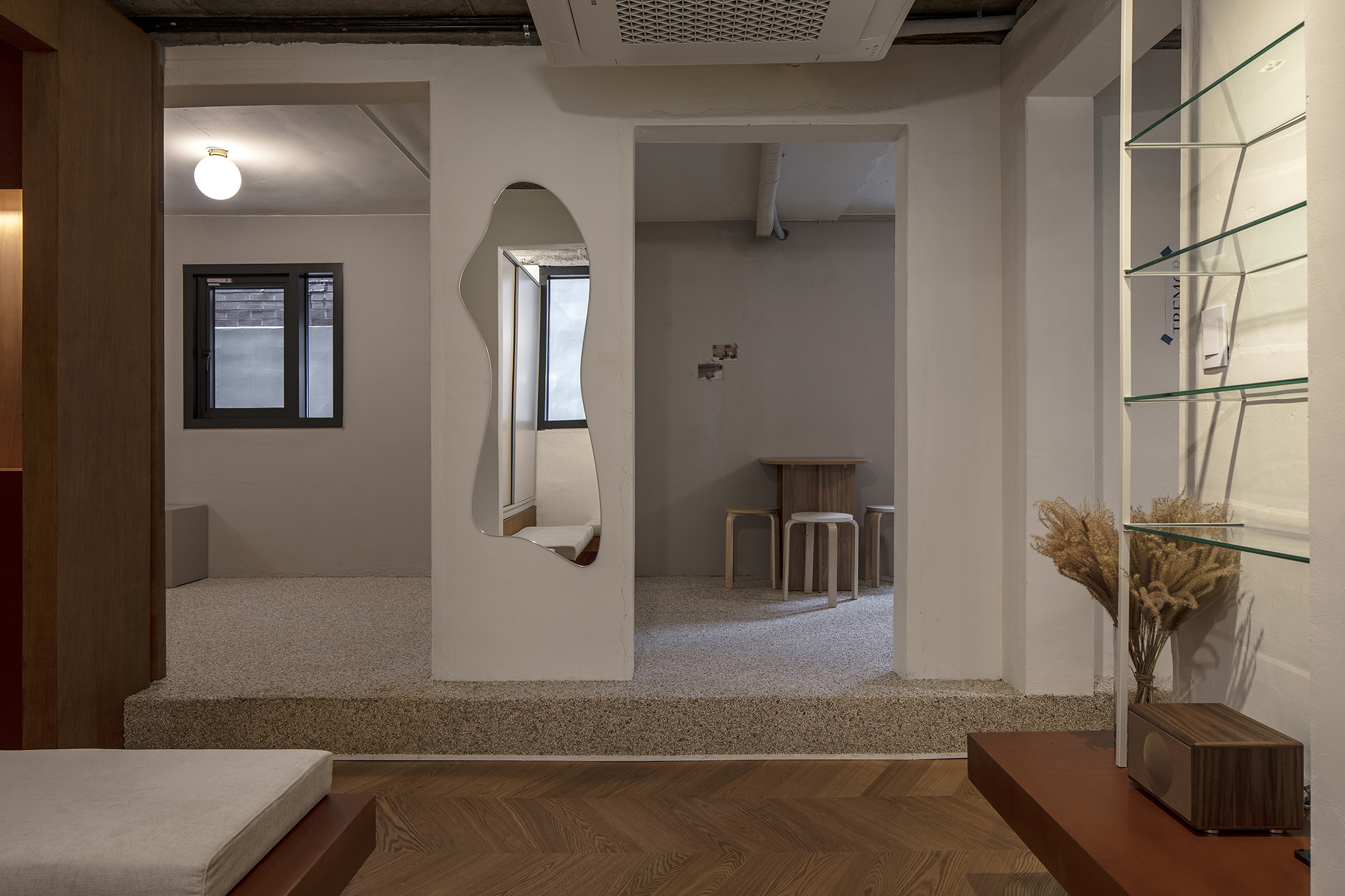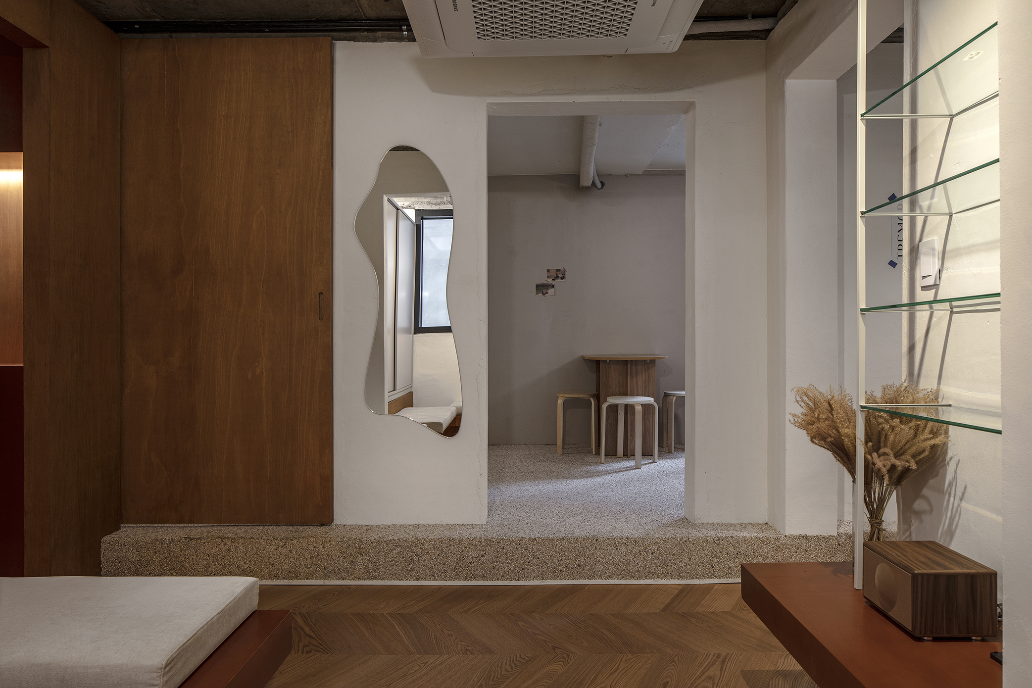 As if it is in contact with Daeheung-dong Park Road, you can see a tramer when you leave a signboard and enter the store after passing through a place covered with soft sand-like bean gravel. It was a space of 8 pyeong divided into small rooms and used as a family house. Accordingly, the concept of "home" went back in time and proceeded with the concept of coffee that was comfortably drunk at home. The largest room is a "kitchen" where you can order and a bar where you can talk to a barista who serves coffee. The "dining" space has a large storage space where guests can sit comfortably and store beans. A gate was built in the hallway leading to the bathroom to look like a front room leading to another 'room', and a wooden door made of molding used in homes in the 1990s was installed. The space connected to the outside is "terrace," which creates a more free atmosphere by arranging bean gravel and plants. Small and large sounds are expressed throughout the space, and the built-in furniture base, wave-shaped partitions located inside the terrace, and wavy mirrors seem to distort the space and look interesting.