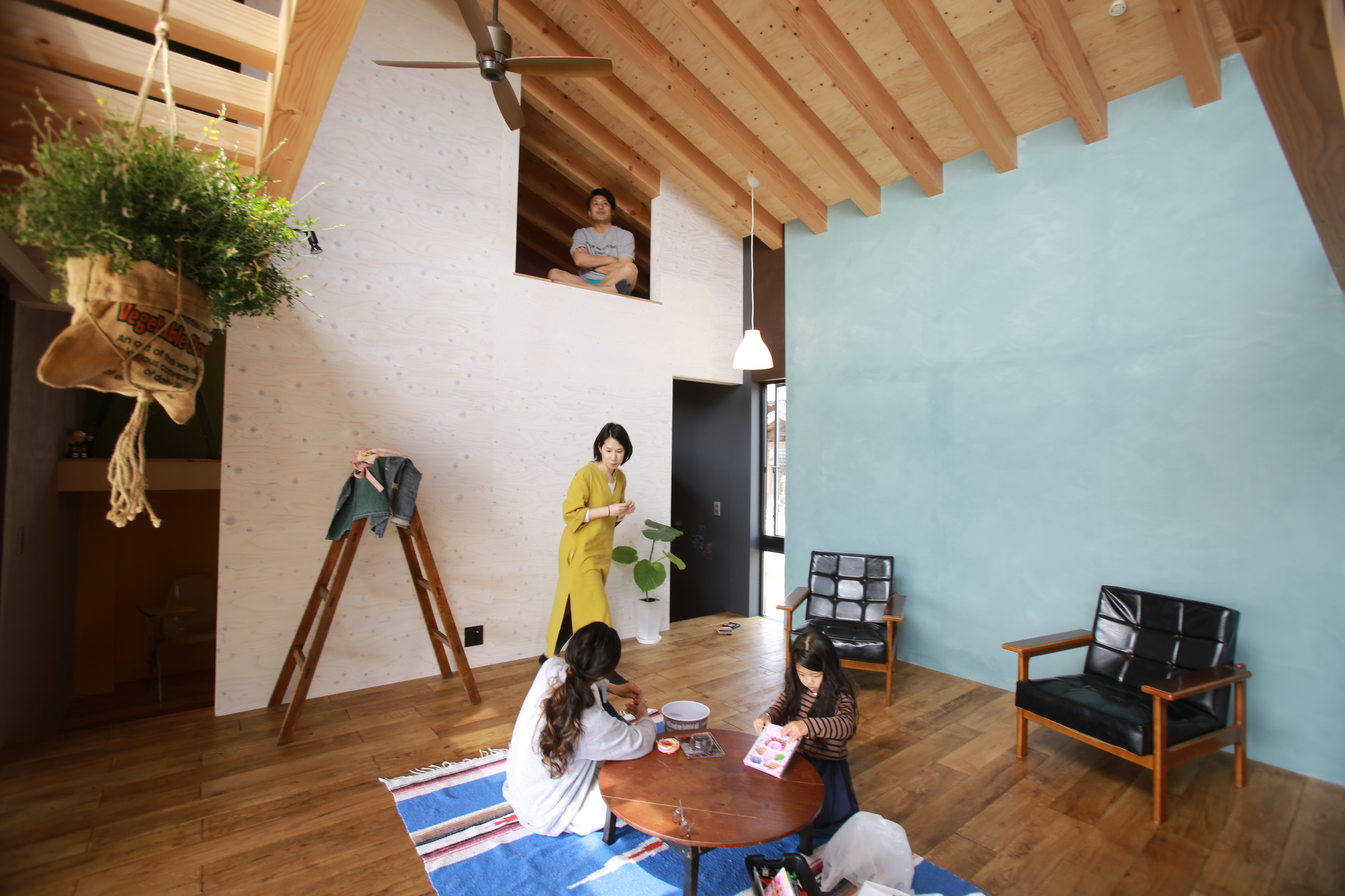This house is located in the warm southern region of Saga, Japan. The layout was planned around a central pantry to avoid the monotonous flow typically found in single-story homes. The variation in the flow provides flexibility and adaptability in the residents' daily routines. The architect designed a house with as many lifestyle options as possible, as the owner has various plans for the future of the house. The low roof that divides the house in half provides a deep covering for the terrace, and is low enough to allow access to the roof by stepping on a workbench. Additionally, a small bridge installed on the second floor connects the inside of the house with the roof, creating a path that connects the ground to the roof. Through this, a large playground for children was created.