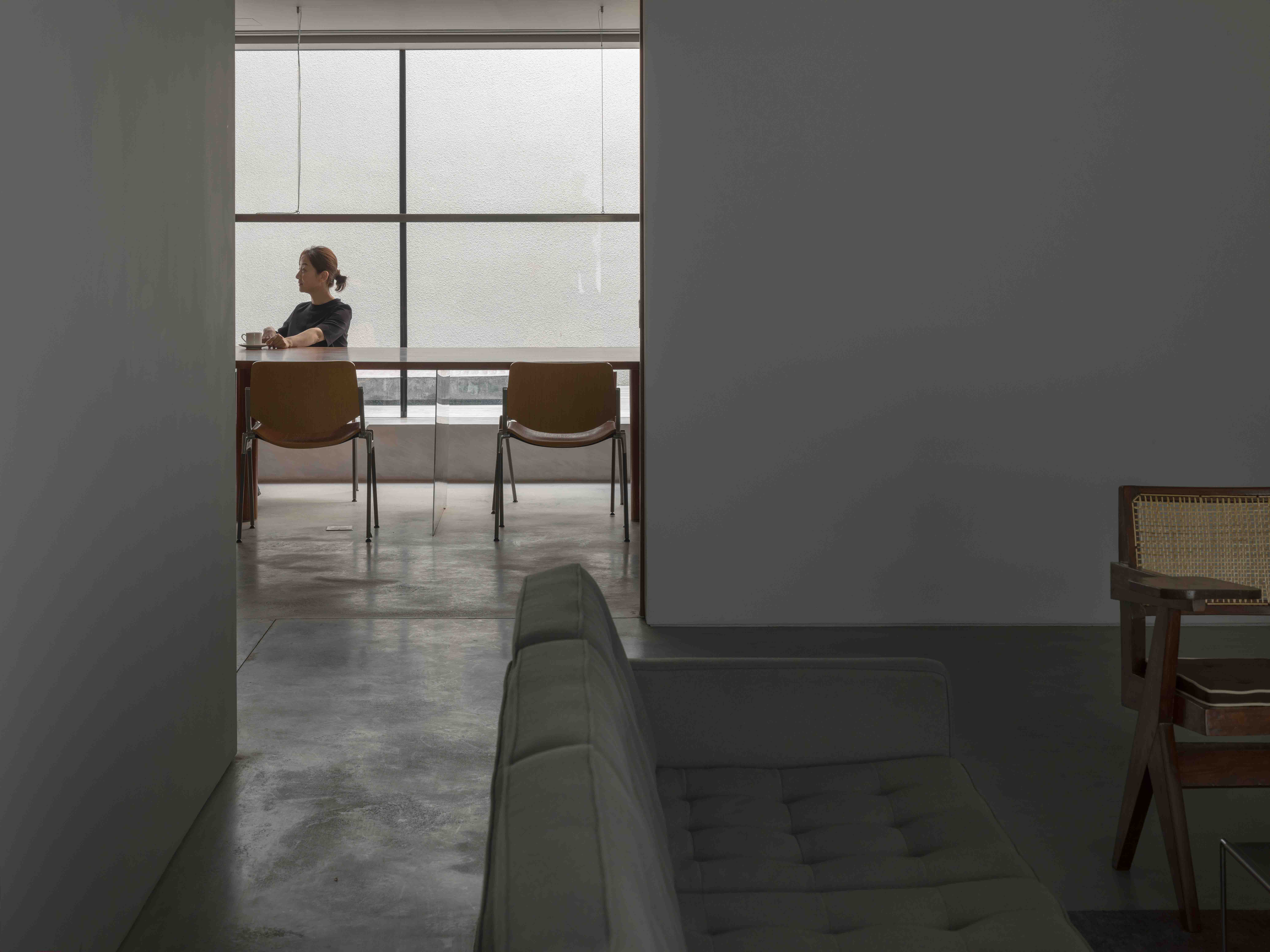 This three-story house, built on the top floor of a five-story building, is a residential space and studio for an artist who is also the owner. The remodeling project was carried out under the limited conditions of the existing structure, while preserving the existing courtyard and ensuring its functions for work, exhibition, and daily life. To ensure the privacy of the studio, a 5.6m-high curtain wall was installed in the courtyard. The resulting glass facade creates a space full of natural light while hiding the studio behind it. The flow from the public space on the first floor to the studio on the second floor and terrace on the third floor smoothly transitions through changing natural light. The dark-colored concrete and wood on the first floor absorb natural light to create a strong contrast in lighting. The gray and white walls that begin on the second floor bring a bright atmosphere to the studio with a sense of calm and purity. The terrace on the third floor is brightly illuminated at night by dispersed lighting, enhancing the urban landscape.