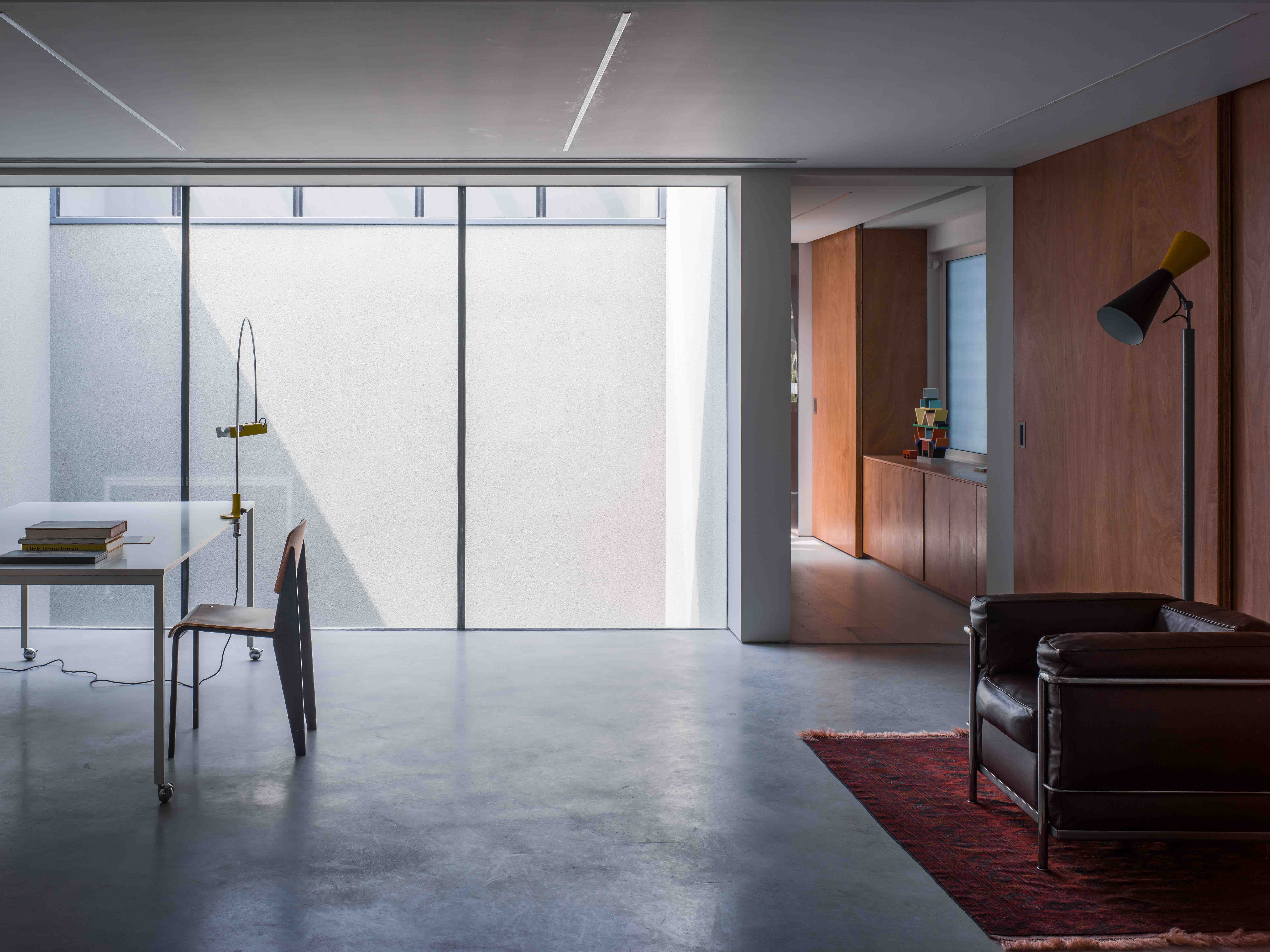 5층 건물의 최상층에 지어진 이 3층 집은 예술가인 건축주를 위한 주거공간이자 작업실이다. 기존의 안마당을 지키면서 작업과 전시, 일상의 기능을 보장하도록 진행된 리모델링 프로젝트는 기존 구조의 한정적인 조건 아래에서 진행됐다. 작업실의 프라이버시를 보장하기 위해 안마당에 5.6m 높이의 커튼월이 새로 설치됐다. 이를 통해 만들어진 유리 파사드는 자연광이 가득한 공간을 만들면서 작업실은 뒤편으로 숨길 수 있도록 했다. 1층의 공공 공간에서 2층의 작업실, 3층의 테라스까지 이어지는 동선은 부드럽게 변하는 자연광을 통해 의식을 전환시킨다. 어둡게 칠해진 콘크리트와 목재로 구성된 1층의 색은 자연광을 받아들이며 빛의 대비를 크게 느끼도록 한다. 2층으로 올라가며 시작되는 연회색과 흰색의 벽은 밝은 분위기로 작업실에 평온함과 순수함을 가져온다. 3층의 테라스는 커튼월에 의해 분산된 조명으로 야간에 도시 풍경을 풍성하게 한다.