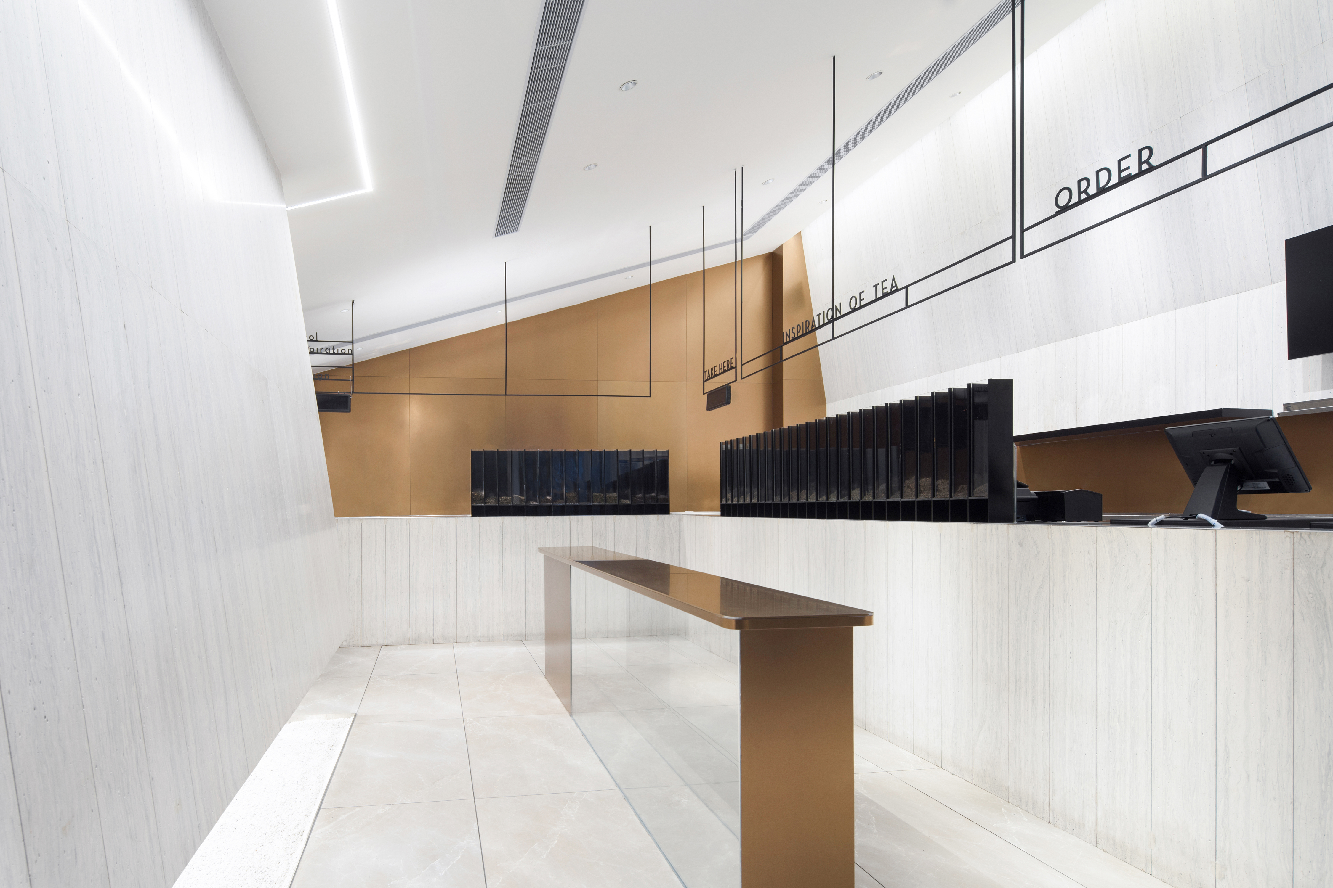 Located in the commercial hub of Xiamen Island, the project is a flagship store of HEYTEA, China's leading tea drink brand. Based on characteristics of the open two-storey architectural space, MOC DESIGN OFFICE created bottom-up oblique order within it, which accommodates various possibilities for urban life and socializing. The store is situated at the street corner, and is enclosed by two glass curtain walls which form a right angle. The transparent glass opens the interior to the outside and enhances its interaction with outdoor pedestrians. The overall space features modern geometric forms, simple, austere materials and hues, as well as an ambience that combines spirit and artistic style. Large areas of interior surfaces are covered with concrete and gold stainless steel, which present strong contrast of textures. Black baked finish is applied to details, helping to strike a balance and add a modern touch to the space. Besides, gold stainless steel is extended to the staircase installation, which appears more flexible and dynamic under the soft light and becomes a visual highlight in the space.