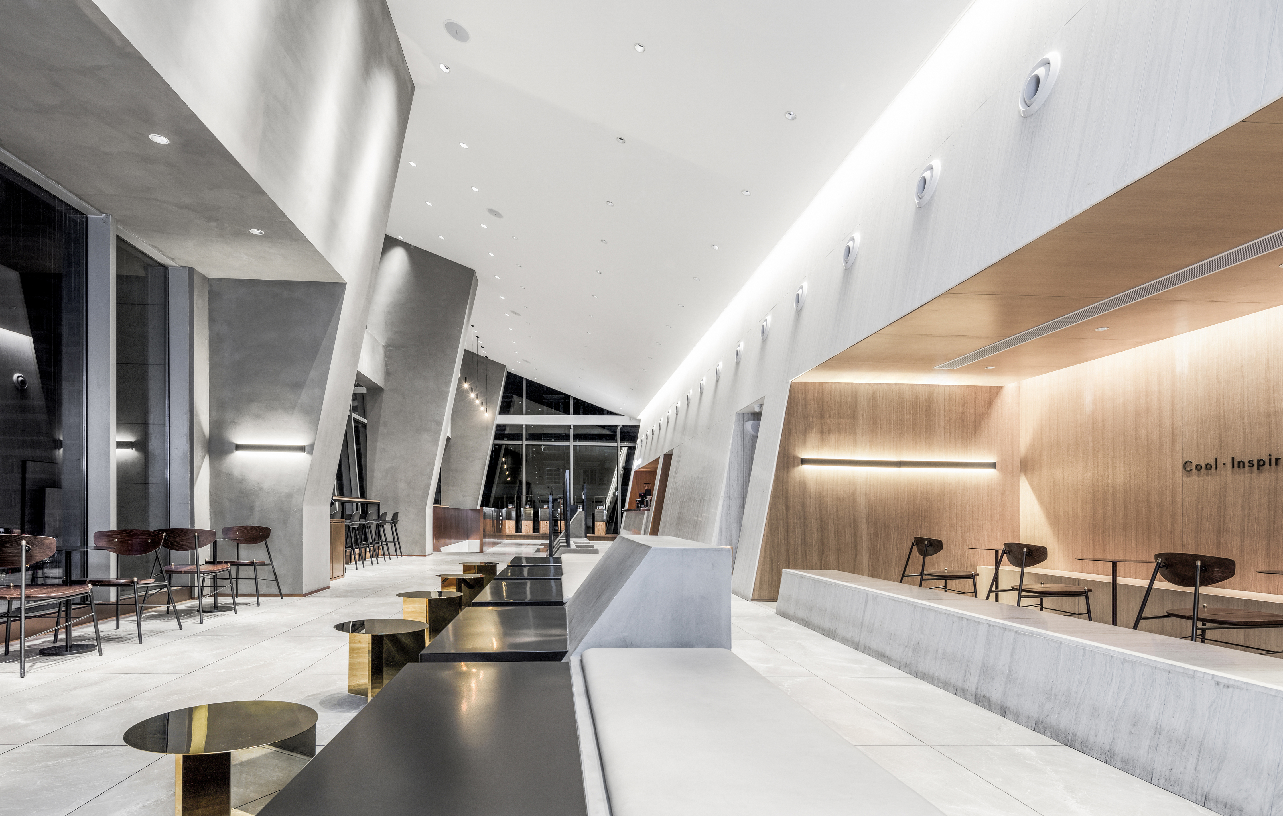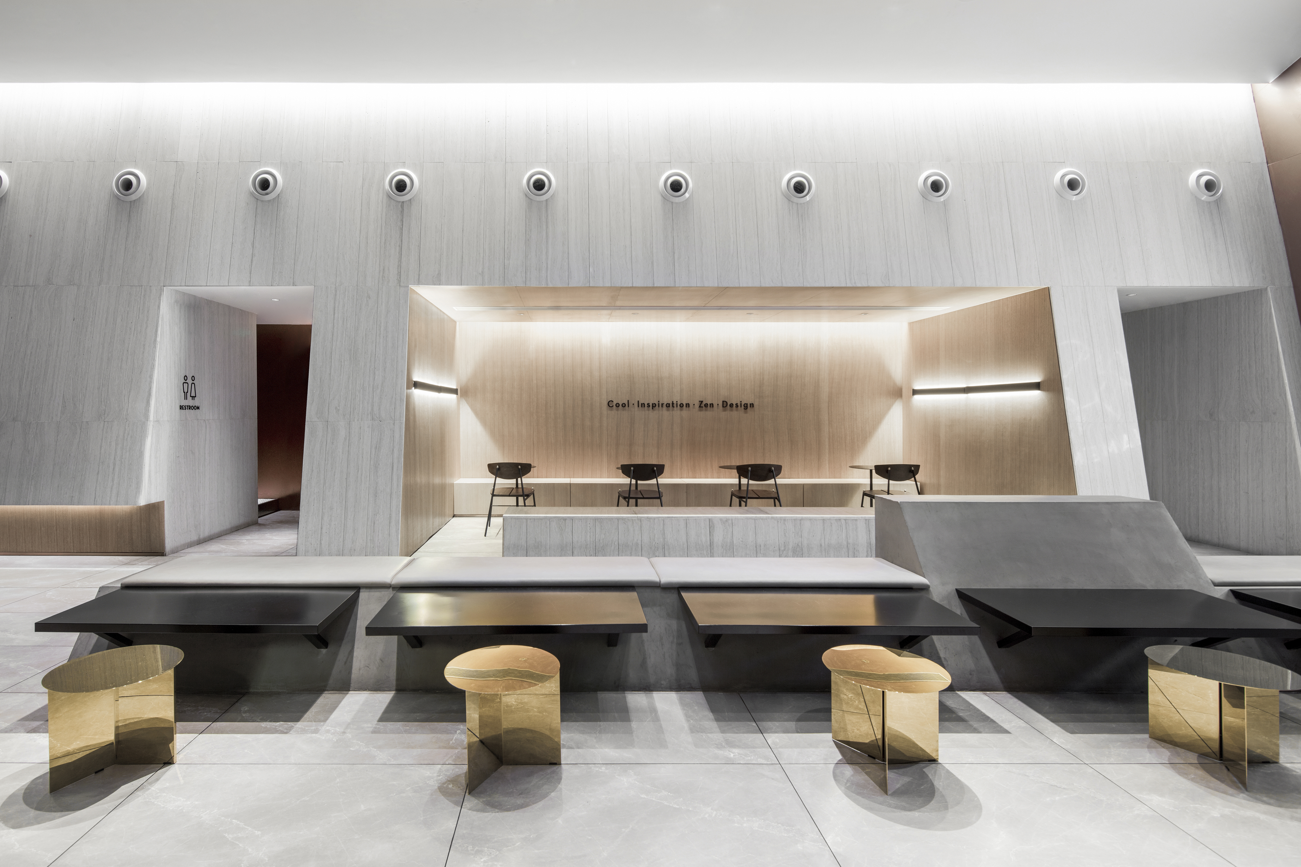 Located in the commercial hub of Xiamen Island, the project is a flagship store of HEYTEA, China's leading tea drink brand. Based on characteristics of the open two-storey architectural space, MOC DESIGN OFFICE created bottom-up oblique order within it, which accommodates various possibilities for urban life and socializing. The store is situated at the street corner, and is enclosed by two glass curtain walls which form a right angle. The transparent glass opens the interior to the outside and enhances its interaction with outdoor pedestrians. The overall space features modern geometric forms, simple, austere materials and hues, as well as an ambience that combines spirit and artistic style. Large areas of interior surfaces are covered with concrete and gold stainless steel, which present strong contrast of textures. Black baked finish is applied to details, helping to strike a balance and add a modern touch to the space. Besides, gold stainless steel is extended to the staircase installation, which appears more flexible and dynamic under the soft light and becomes a visual highlight in the space.